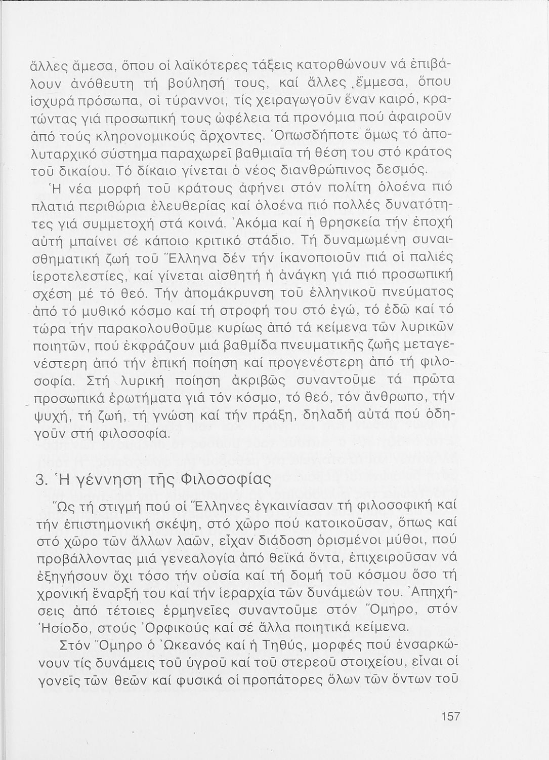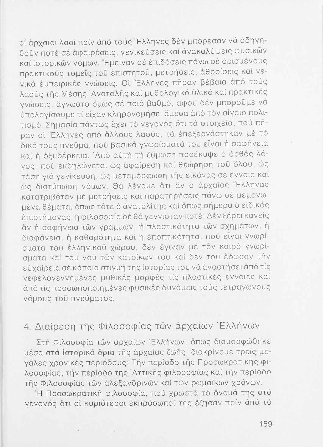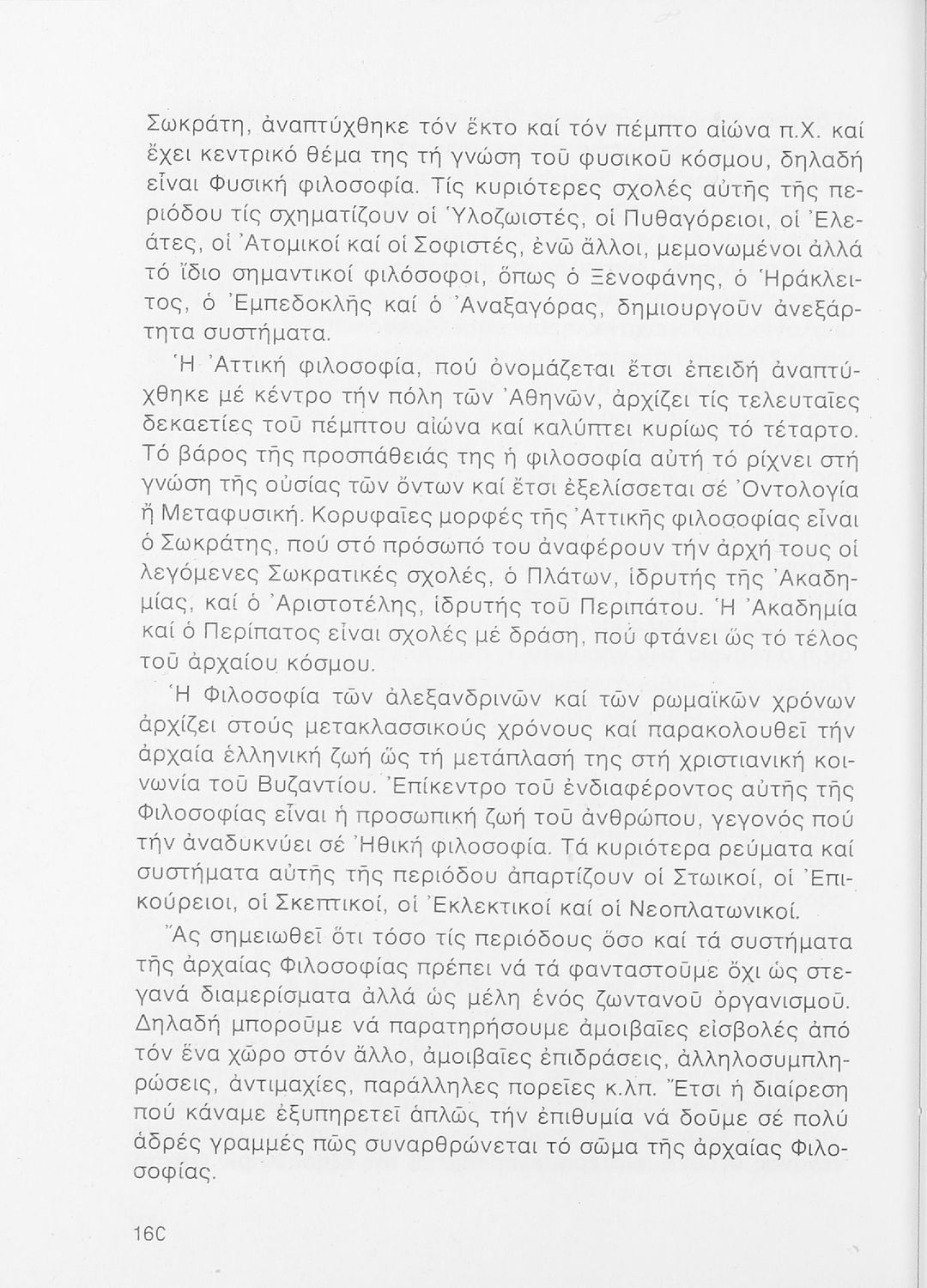 Σχολικό εγχειρίδιο Φιλοσοφίας Γ΄ Λυκείου που ακολουθεί μια ιστορική πραγμάτευση επιστημολογικών, ηθικών και αισθητικών ζητημάτων και καλύπτει δύο περιόδους: α) την ελληνική αρχαιότητα και β) την σύγχρονη ευρωπαϊκή σκέψη από τον Descartes και τον Kant στον λογικό θετικισμό και τον νεοκαντιανισμό. Περιέχει εκτενές κεφάλαιο για τους προσωκρατικούς.