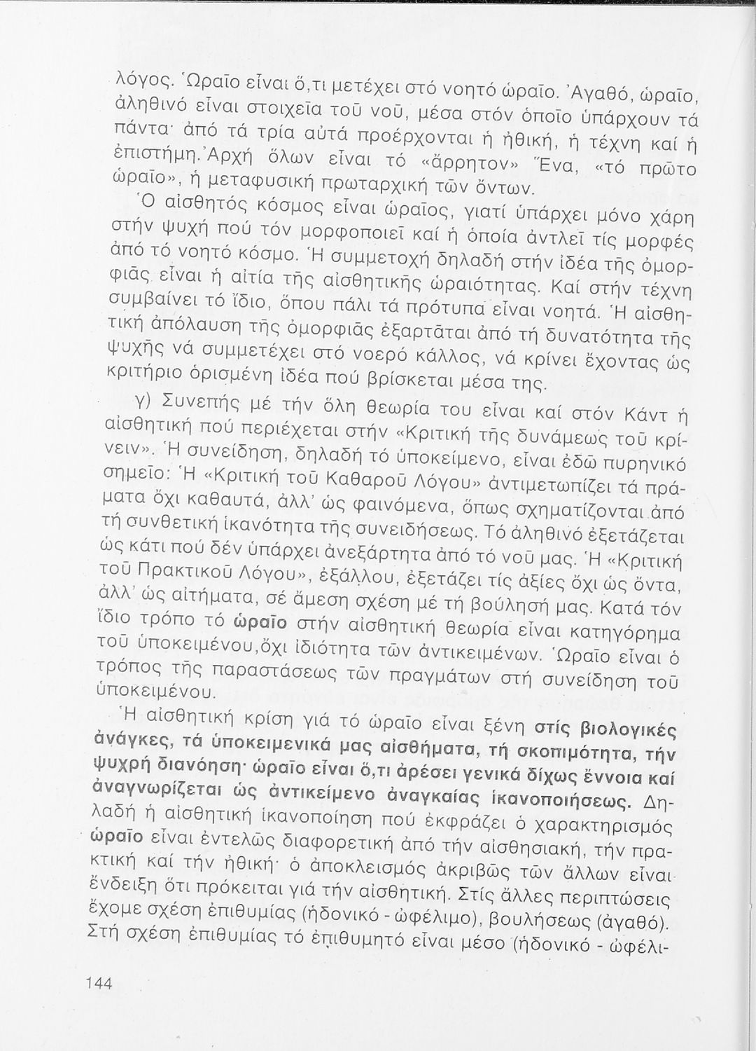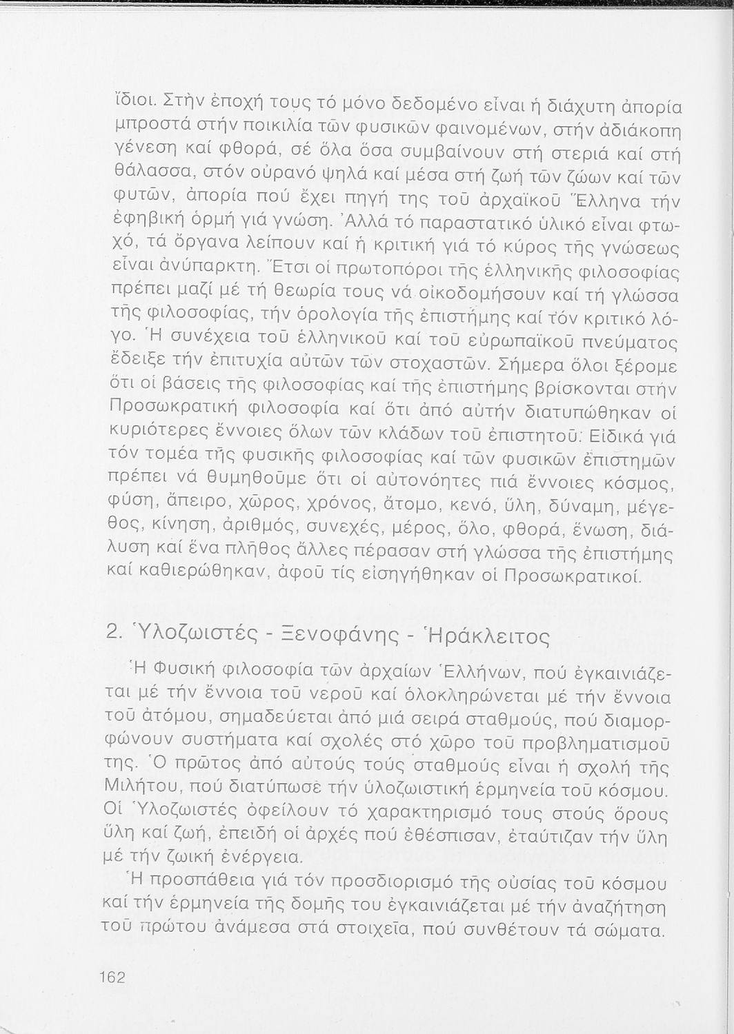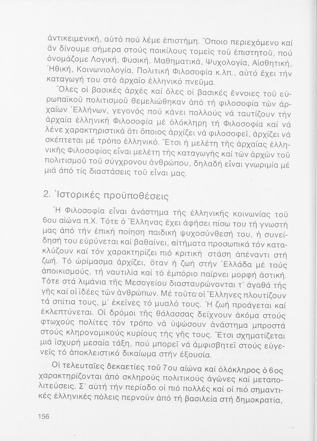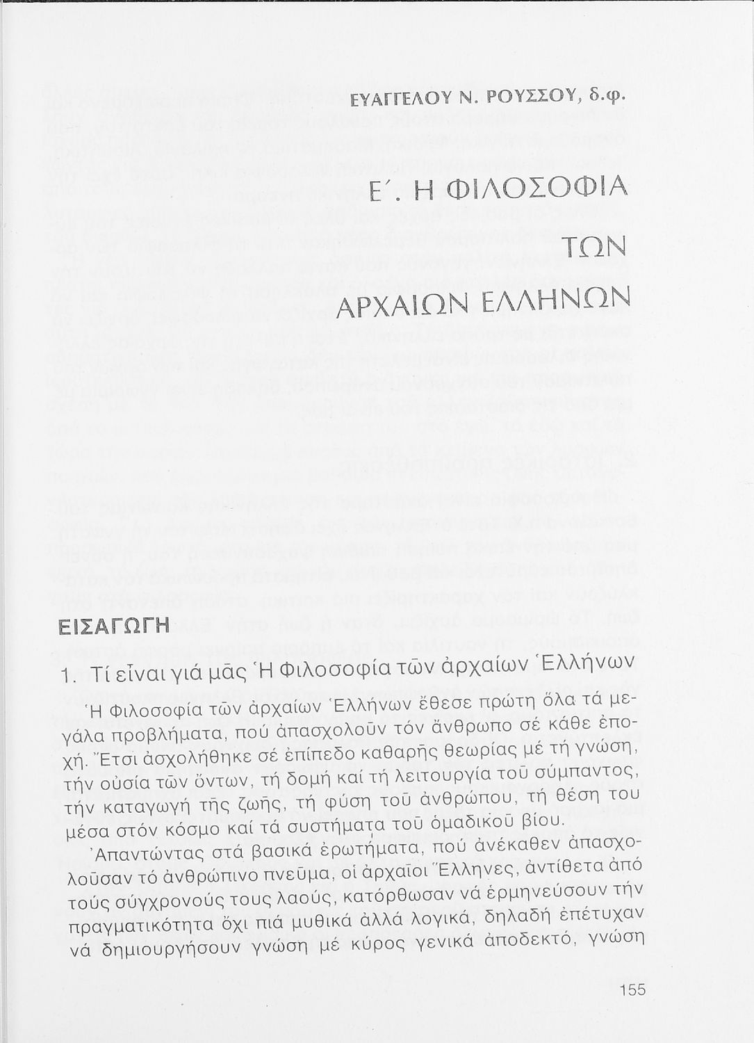Σχολικό εγχειρίδιο Φιλοσοφίας Γ΄ Λυκείου που ακολουθεί μια ιστορική πραγμάτευση επιστημολογικών, ηθικών και αισθητικών ζητημάτων και καλύπτει δύο περιόδους: α) την ελληνική αρχαιότητα και β) την σύγχρονη ευρωπαϊκή σκέψη από τον Descartes και τον Kant στον λογικό θετικισμό και τον νεοκαντιανισμό. Περιέχει εκτενές κεφάλαιο για τους προσωκρατικούς.