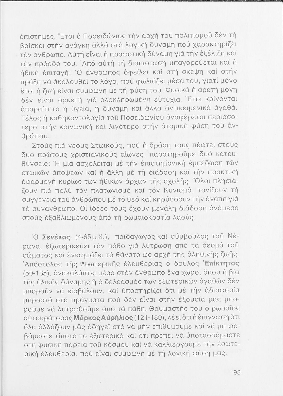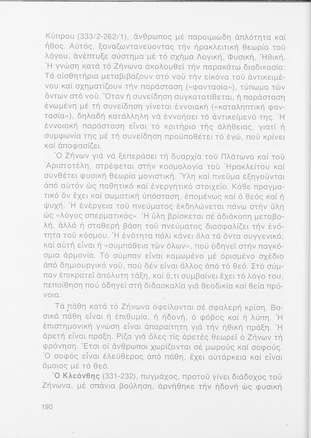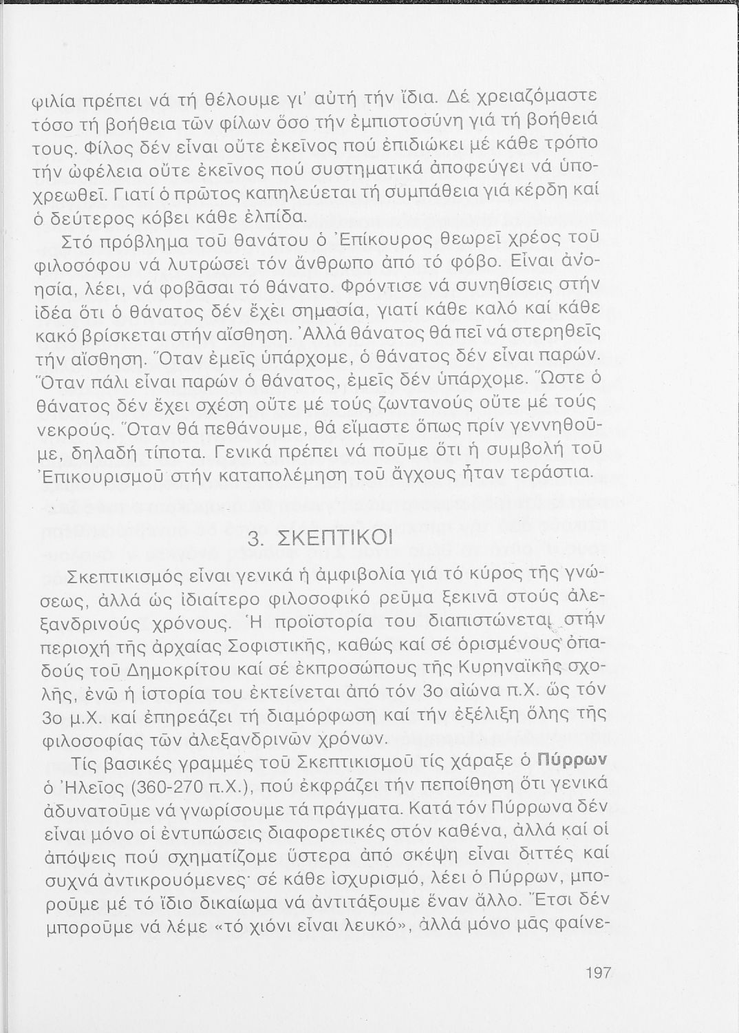 Σχολικό εγχειρίδιο Φιλοσοφίας Γ΄ Λυκείου που ακολουθεί μια ιστορική πραγμάτευση επιστημολογικών, ηθικών και αισθητικών ζητημάτων και καλύπτει δύο περιόδους: α) την ελληνική αρχαιότητα και β) την σύγχρονη ευρωπαϊκή σκέψη από τον Descartes και τον Kant στον λογικό θετικισμό και τον νεοκαντιανισμό. Περιέχει εκτενές κεφάλαιο για τους προσωκρατικούς.