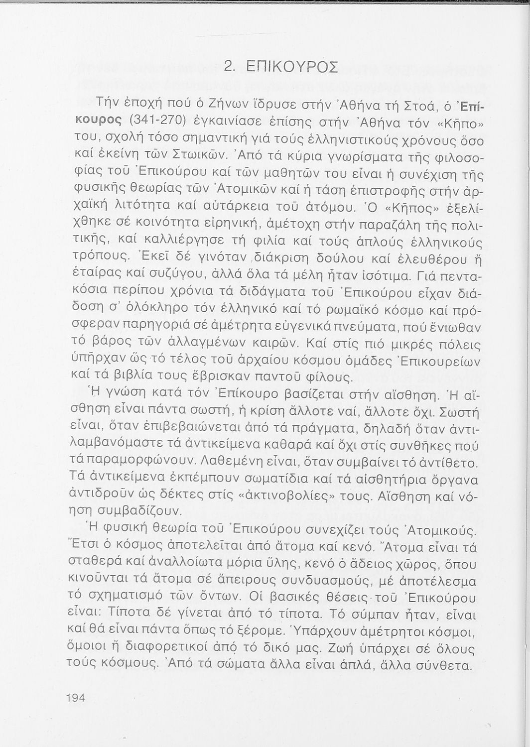 Βαθμίδα εκπαίδευσης: Δευτεροβάθμια Τάξη: Γ' Λυκείου Μάθημα: Φιλοσοφία Γλώσσα: Δημοτική Παρουσίαση περιεχομένου: Σχολικό εγχειρίδιο Φιλοσοφίας Γ΄ Λυκείου που ακολουθεί μια ιστορική πραγμάτευση επιστημολογικών, ηθικών και αισθητικών ζητημάτων και καλύπτει δύο περιόδους: α) την ελληνική αρχαιότητα και β) την σύγχρονη ευρωπαϊκή σκέψη από τον Descartes και τον Kant στον λογικό θετικισμό και τον νεοκαντιανισμό. Περιέχει εκτενές κεφάλαιο για τους προσωκρατικούς. |