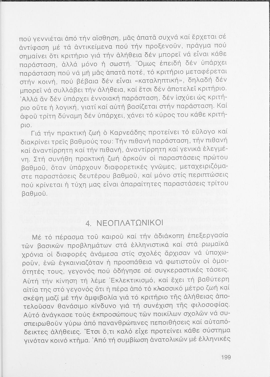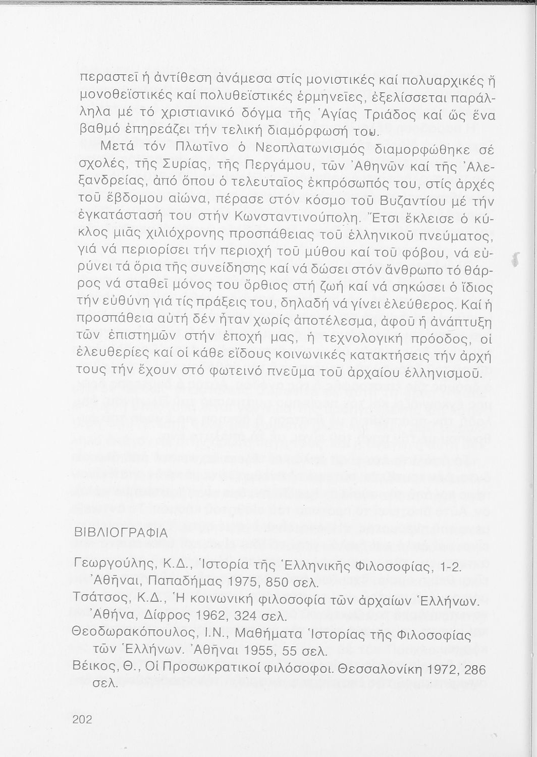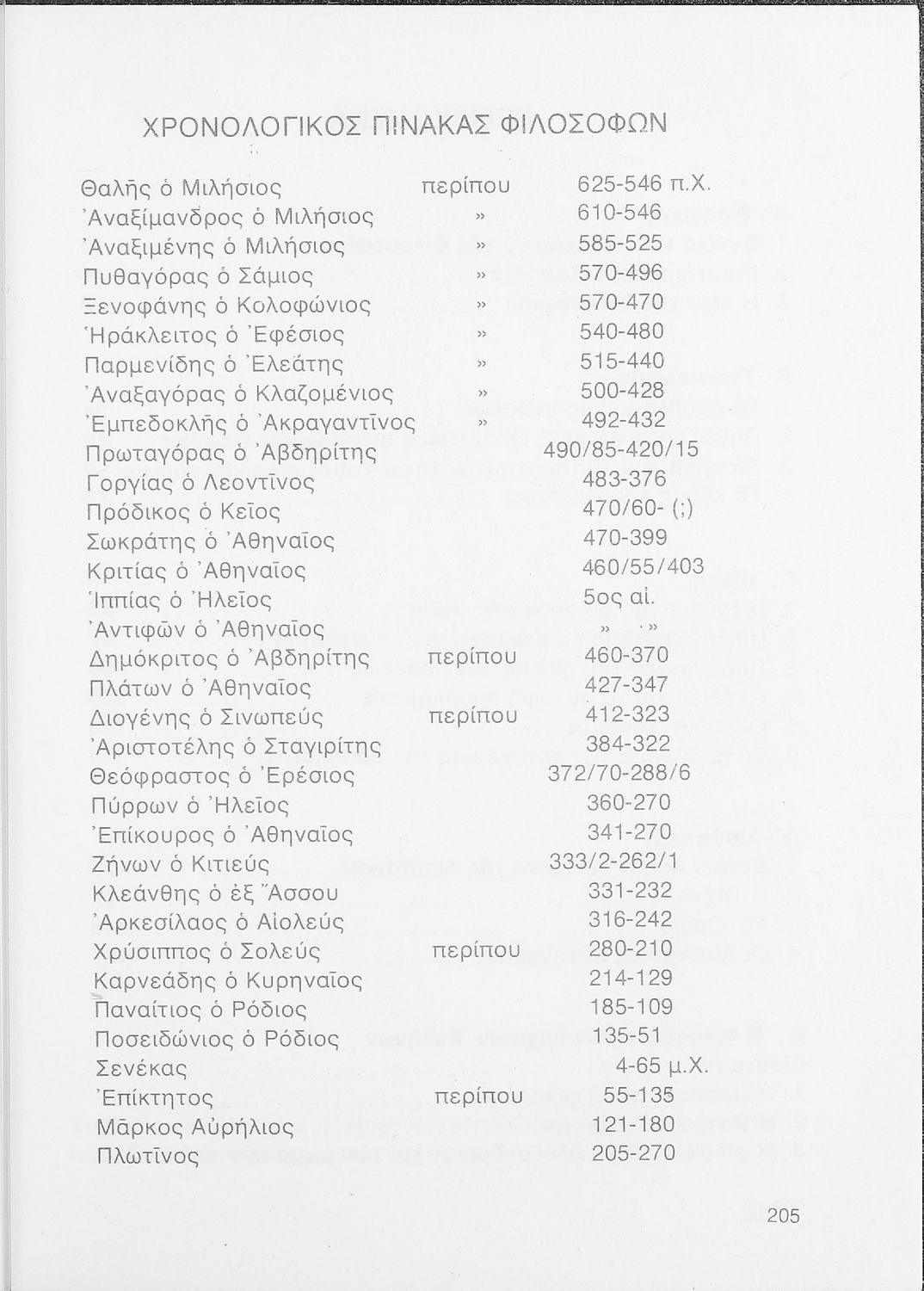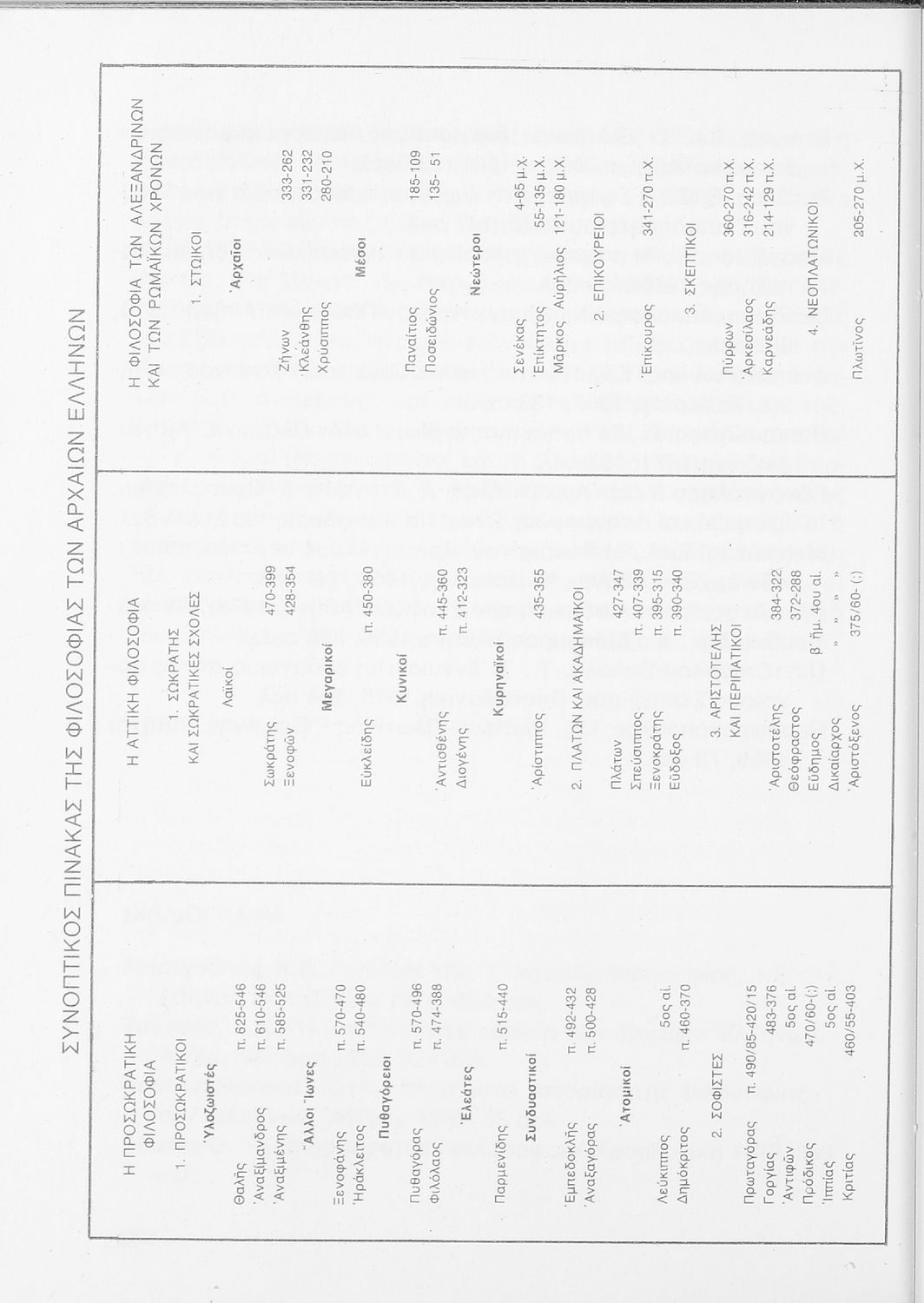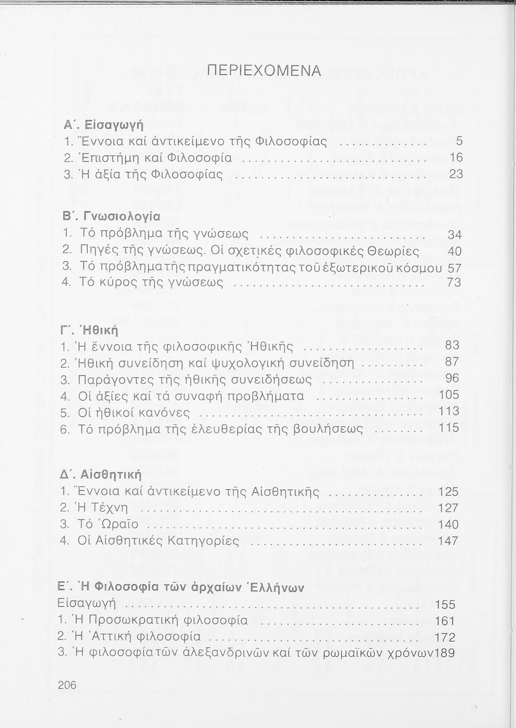 Σχολικό εγχειρίδιο Φιλοσοφίας Γ΄ Λυκείου που ακολουθεί μια ιστορική πραγμάτευση επιστημολογικών, ηθικών και αισθητικών ζητημάτων και καλύπτει δύο περιόδους: α) την ελληνική αρχαιότητα και β) την σύγχρονη ευρωπαϊκή σκέψη από τον Descartes και τον Kant στον λογικό θετικισμό και τον νεοκαντιανισμό. Περιέχει εκτενές κεφάλαιο για τους προσωκρατικούς.