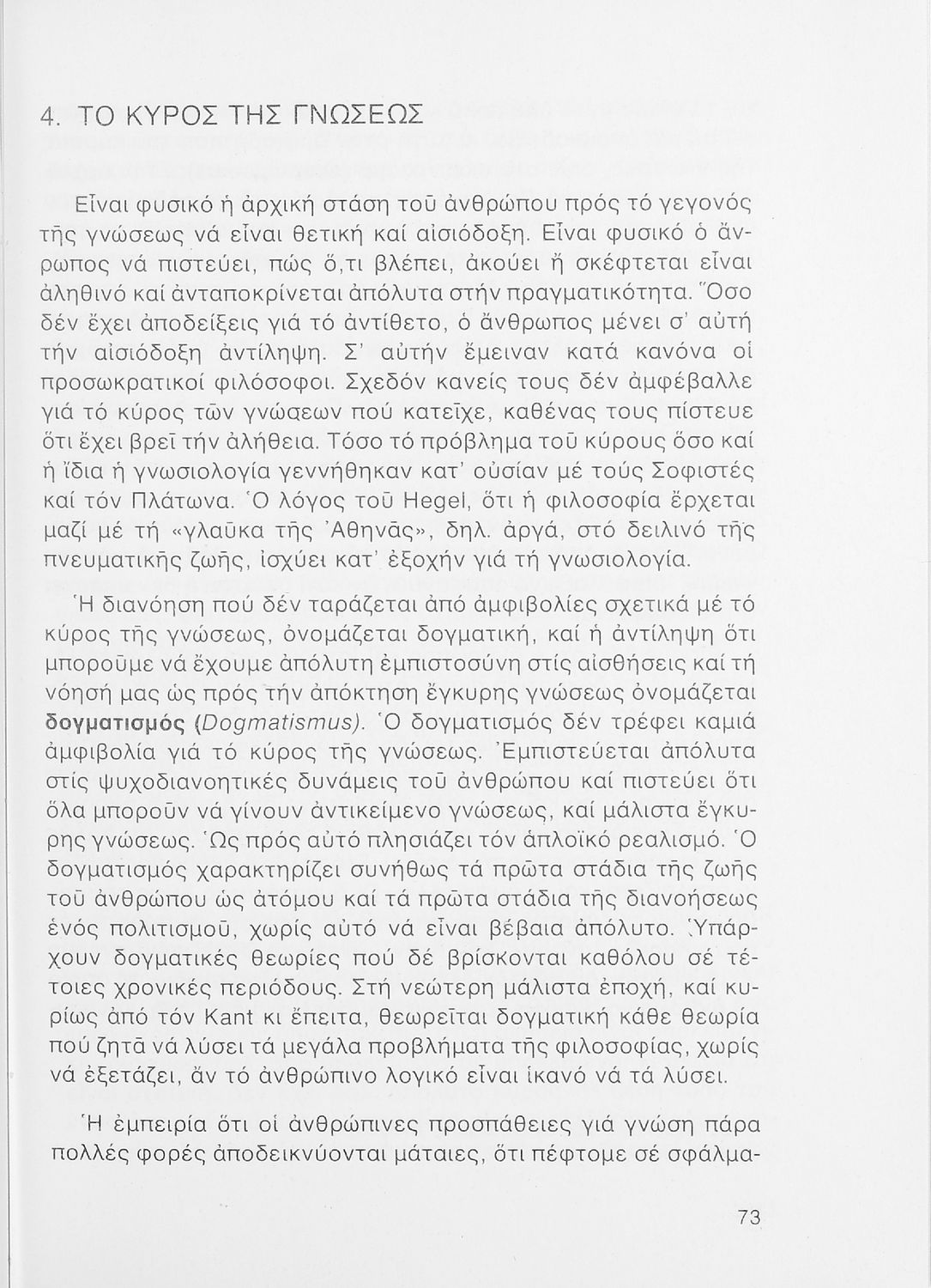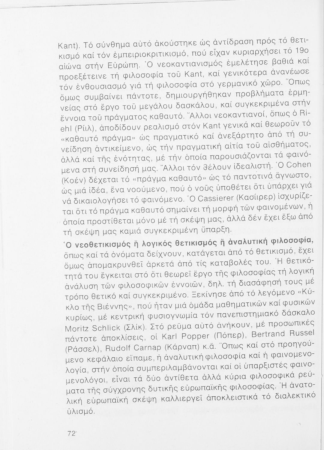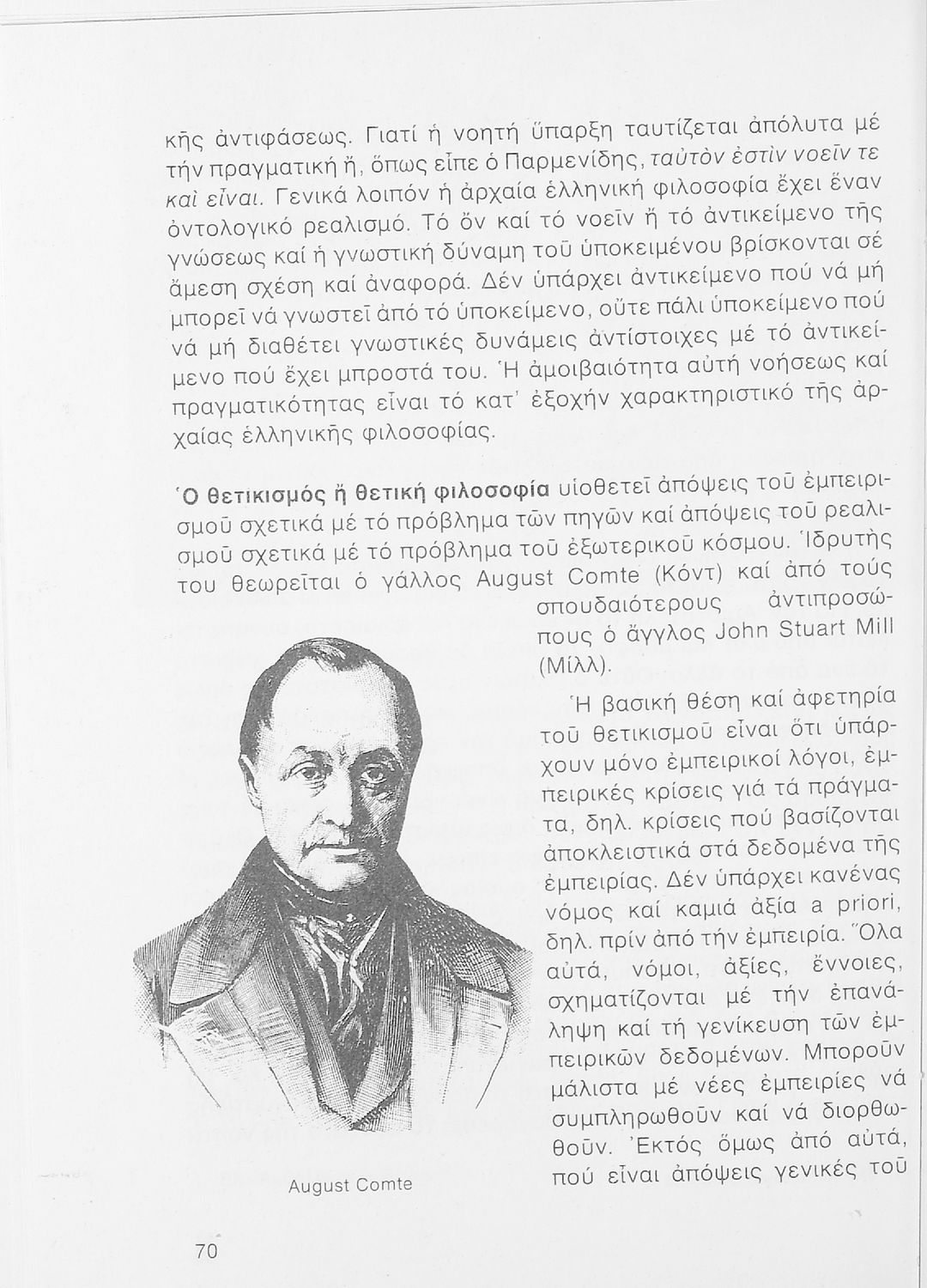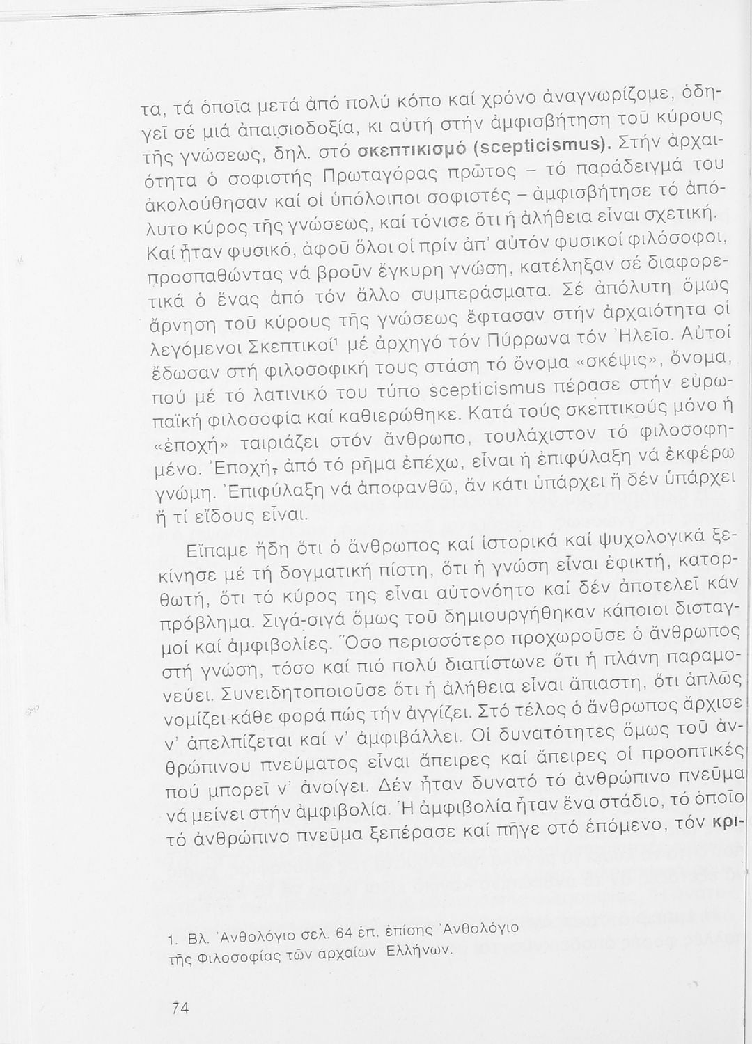 Σχολικό εγχειρίδιο Φιλοσοφίας Γ΄ Λυκείου που ακολουθεί μια ιστορική πραγμάτευση επιστημολογικών, ηθικών και αισθητικών ζητημάτων και καλύπτει δύο περιόδους: α) την ελληνική αρχαιότητα και β) την σύγχρονη ευρωπαϊκή σκέψη από τον Descartes και τον Kant στον λογικό θετικισμό και τον νεοκαντιανισμό. Περιέχει εκτενές κεφάλαιο για τους προσωκρατικούς.