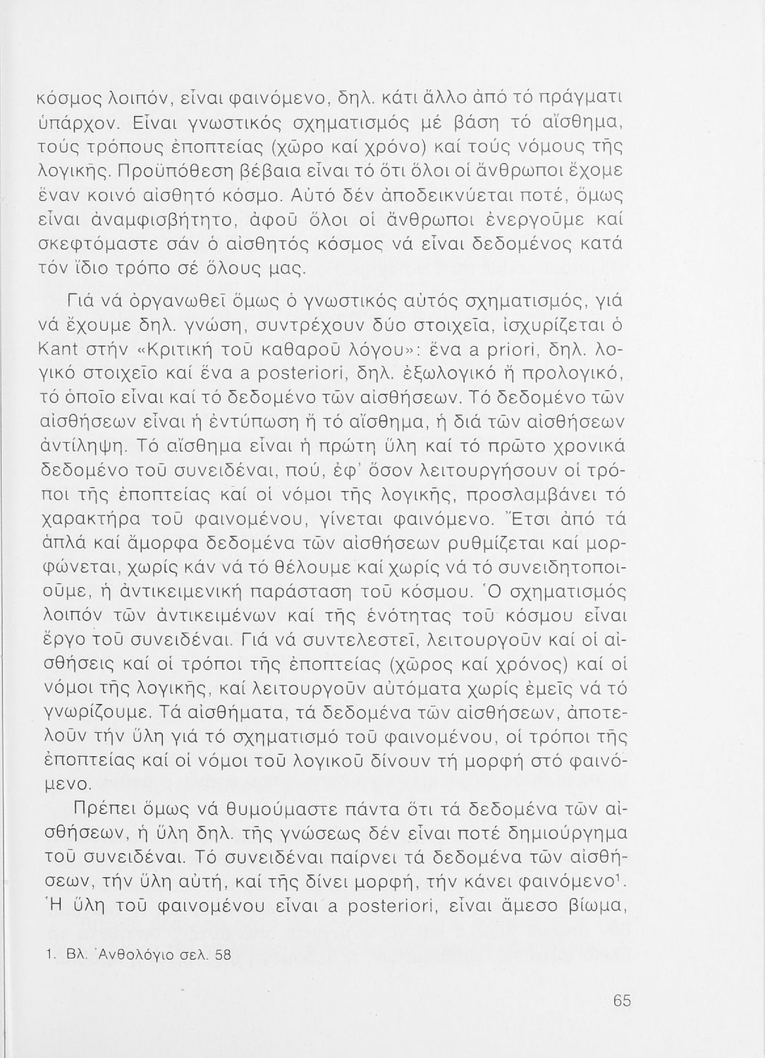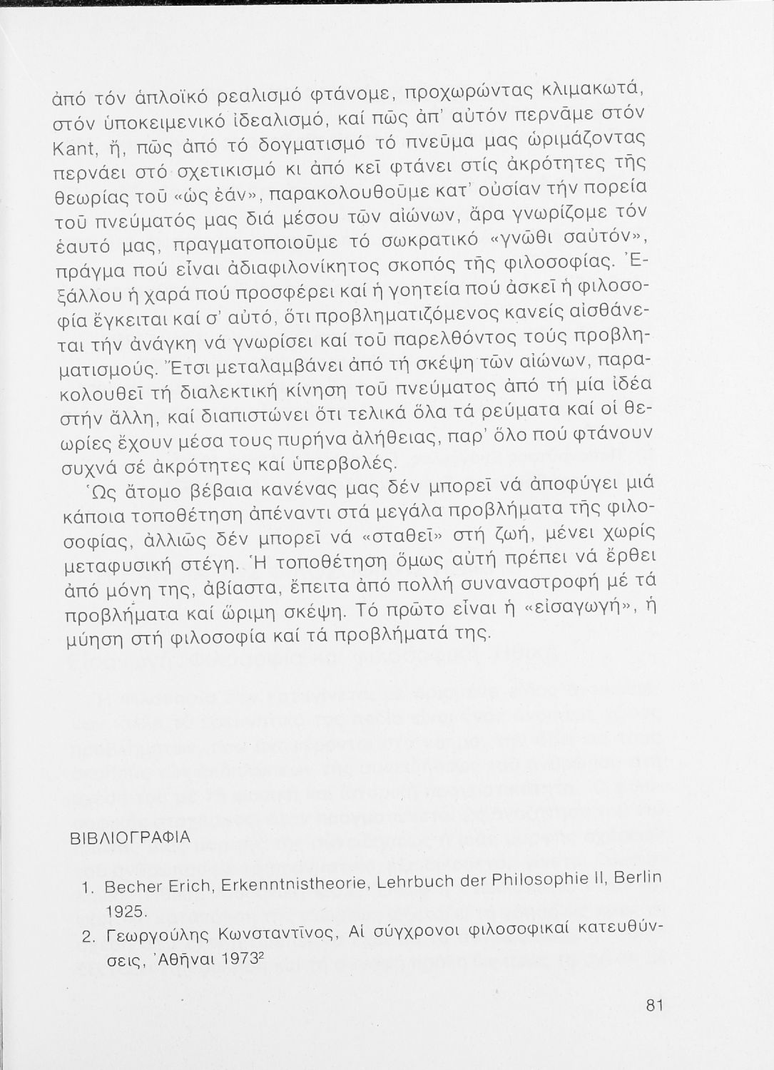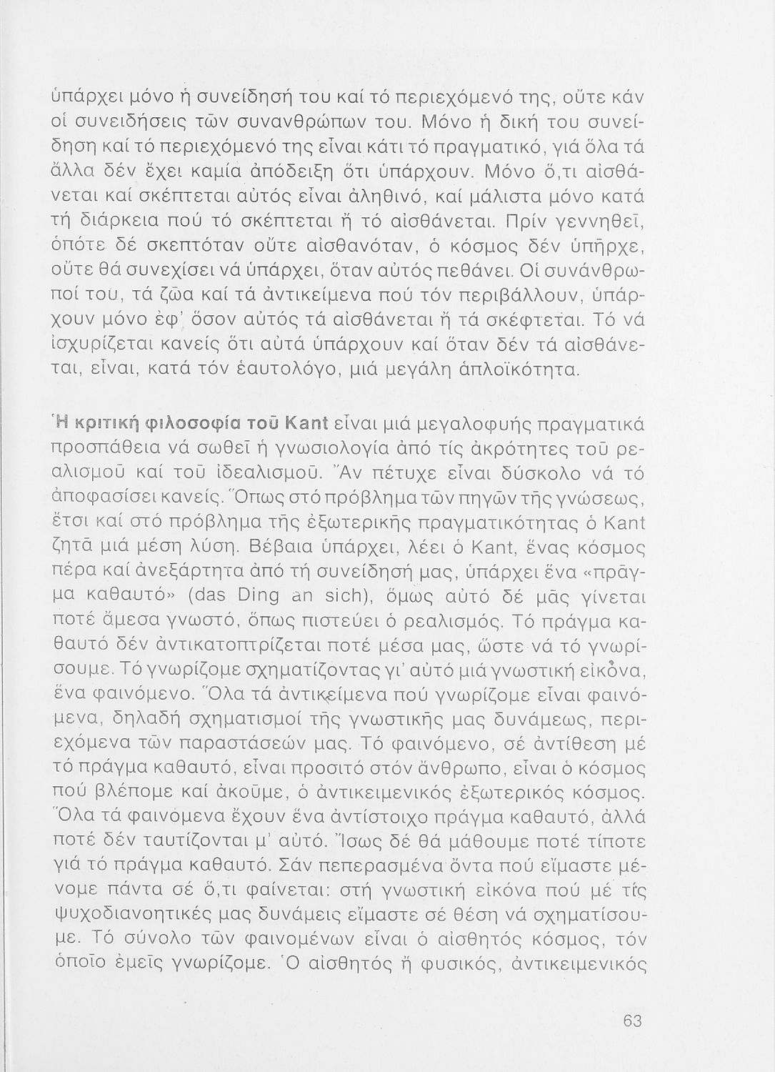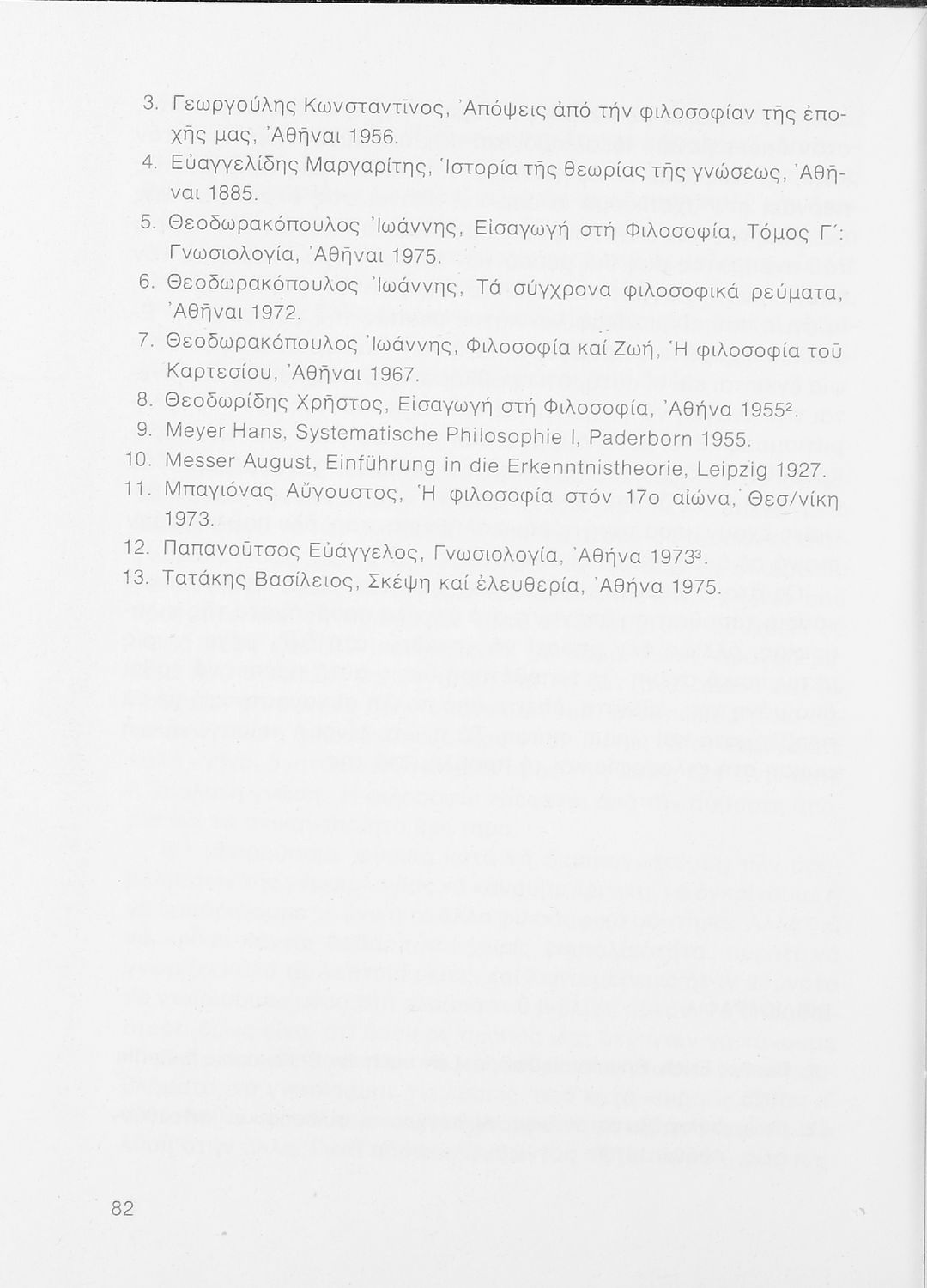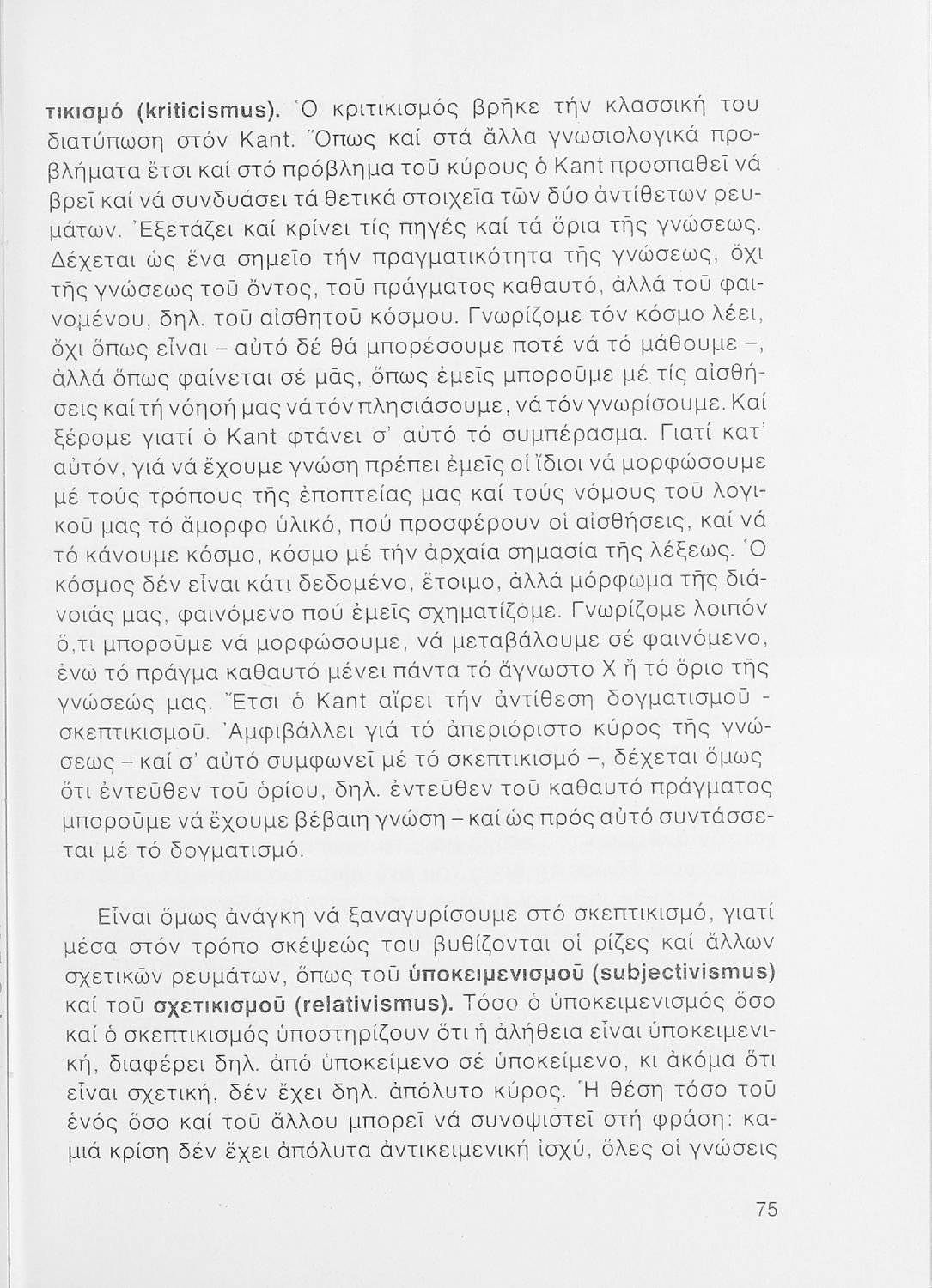 Σχολικό εγχειρίδιο Φιλοσοφίας Γ΄ Λυκείου που ακολουθεί μια ιστορική πραγμάτευση επιστημολογικών, ηθικών και αισθητικών ζητημάτων και καλύπτει δύο περιόδους: α) την ελληνική αρχαιότητα και β) την σύγχρονη ευρωπαϊκή σκέψη από τον Descartes και τον Kant στον λογικό θετικισμό και τον νεοκαντιανισμό. Περιέχει εκτενές κεφάλαιο για τους προσωκρατικούς.