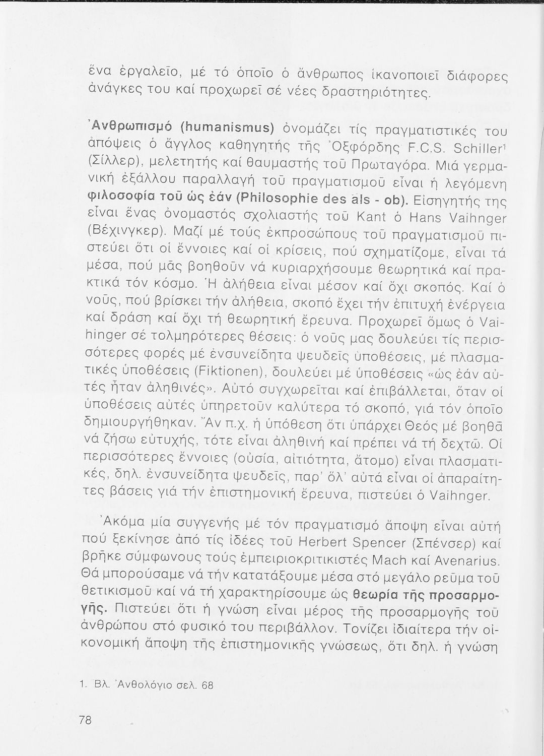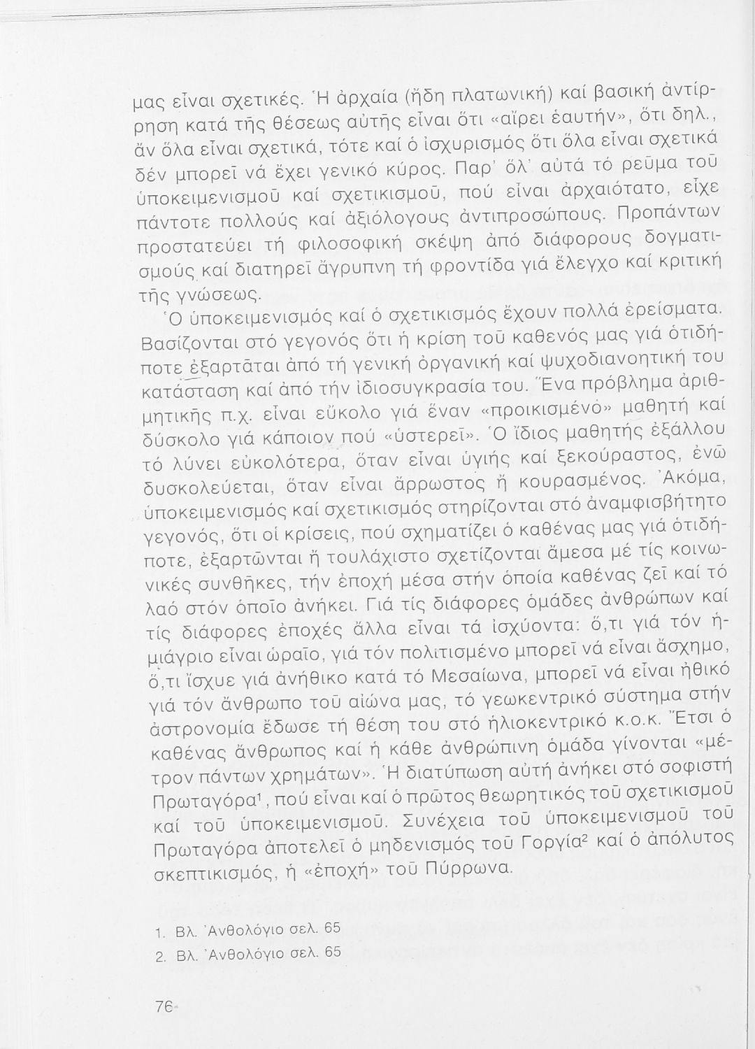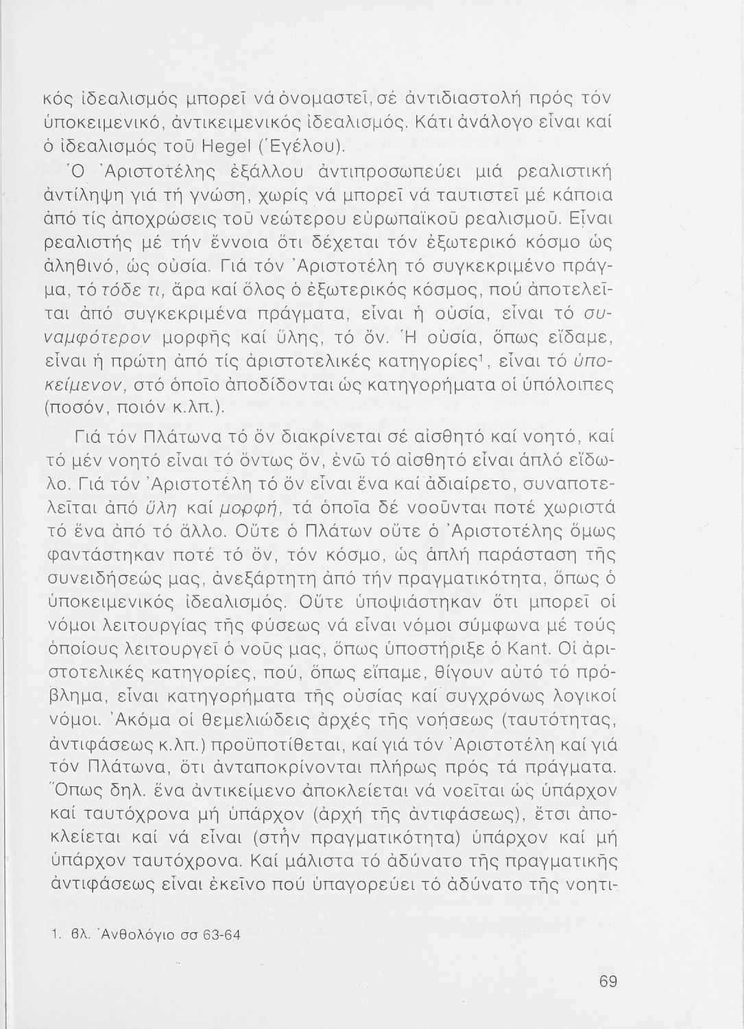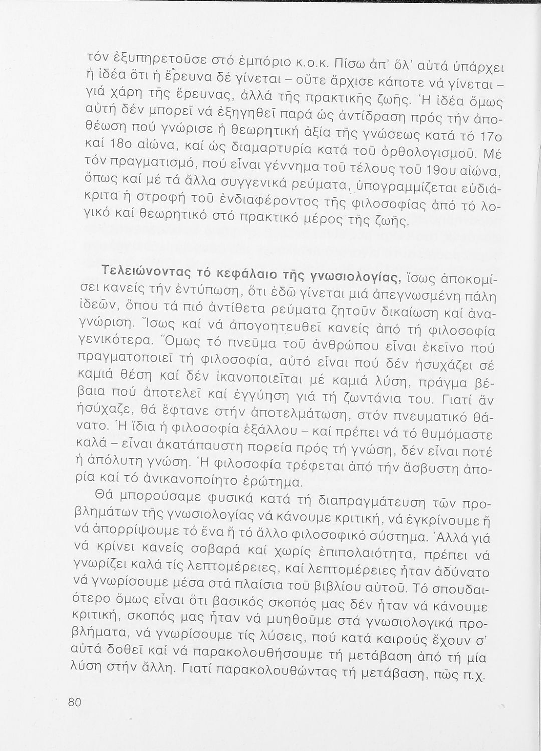 Σχολικό εγχειρίδιο Φιλοσοφίας Γ΄ Λυκείου που ακολουθεί μια ιστορική πραγμάτευση επιστημολογικών, ηθικών και αισθητικών ζητημάτων και καλύπτει δύο περιόδους: α) την ελληνική αρχαιότητα και β) την σύγχρονη ευρωπαϊκή σκέψη από τον Descartes και τον Kant στον λογικό θετικισμό και τον νεοκαντιανισμό. Περιέχει εκτενές κεφάλαιο για τους προσωκρατικούς.