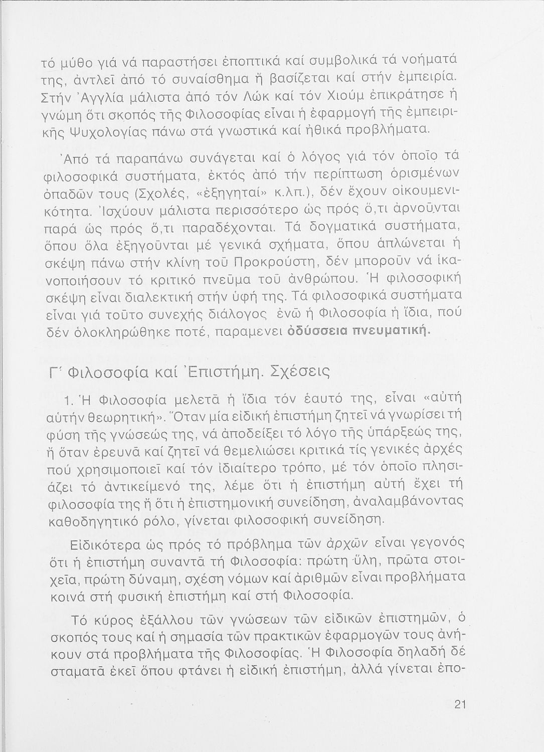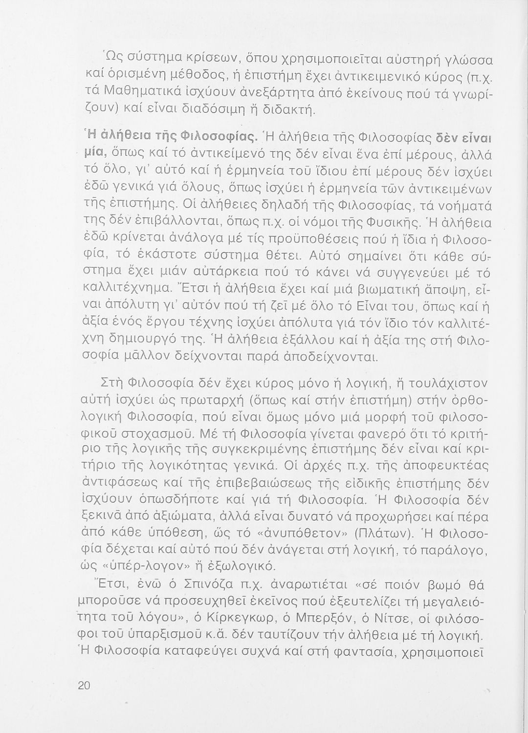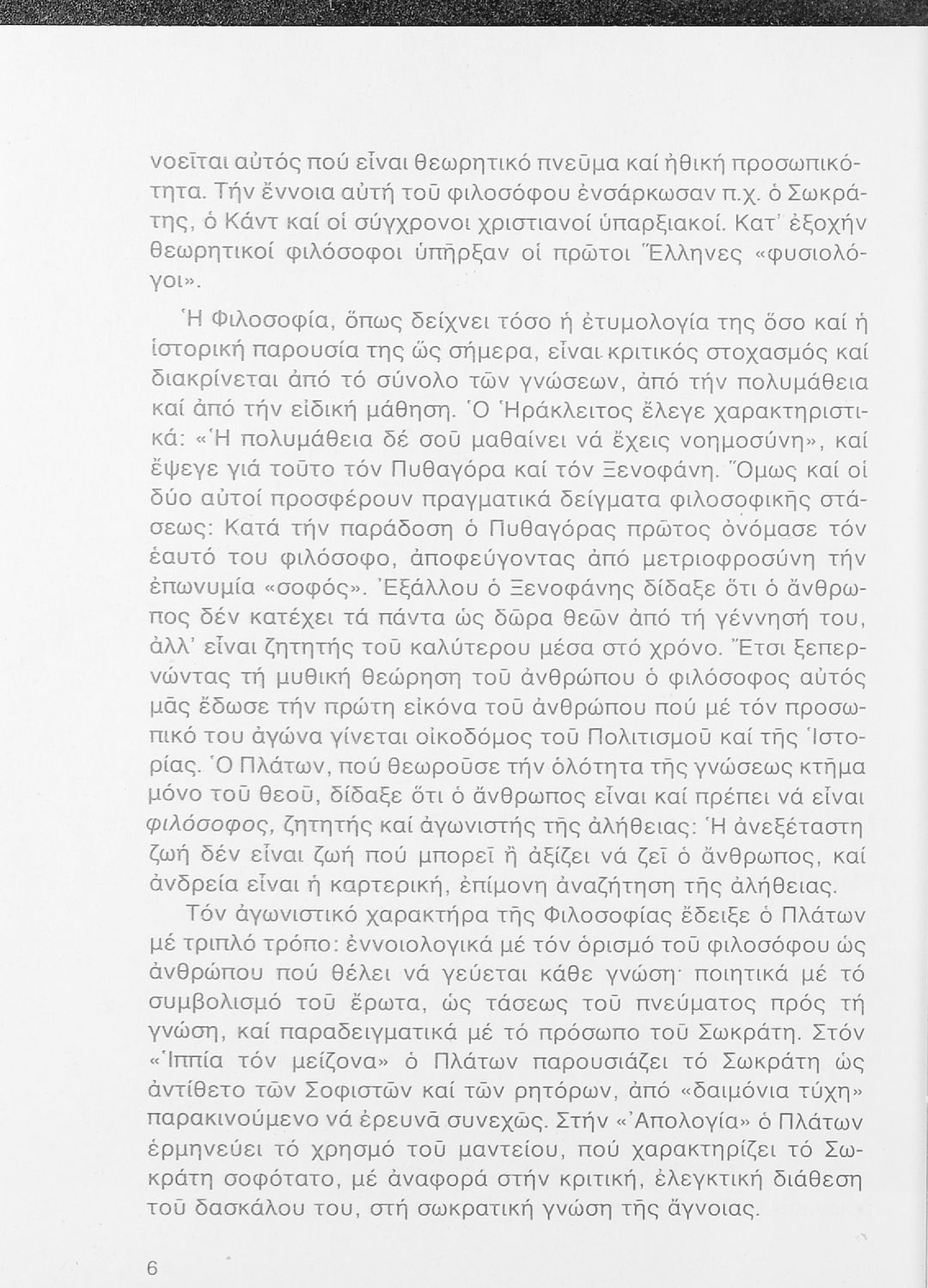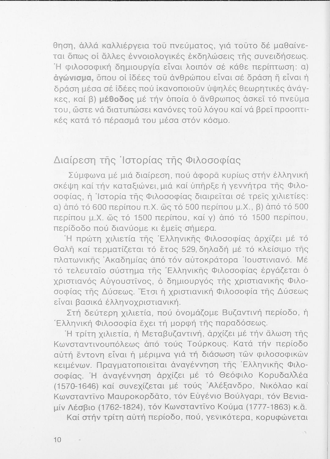 Σχολικό εγχειρίδιο Φιλοσοφίας Γ΄ Λυκείου που ακολουθεί μια ιστορική πραγμάτευση επιστημολογικών, ηθικών και αισθητικών ζητημάτων και καλύπτει δύο περιόδους: α) την ελληνική αρχαιότητα και β) την σύγχρονη ευρωπαϊκή σκέψη από τον Descartes και τον Kant στον λογικό θετικισμό και τον νεοκαντιανισμό. Περιέχει εκτενές κεφάλαιο για τους προσωκρατικούς.