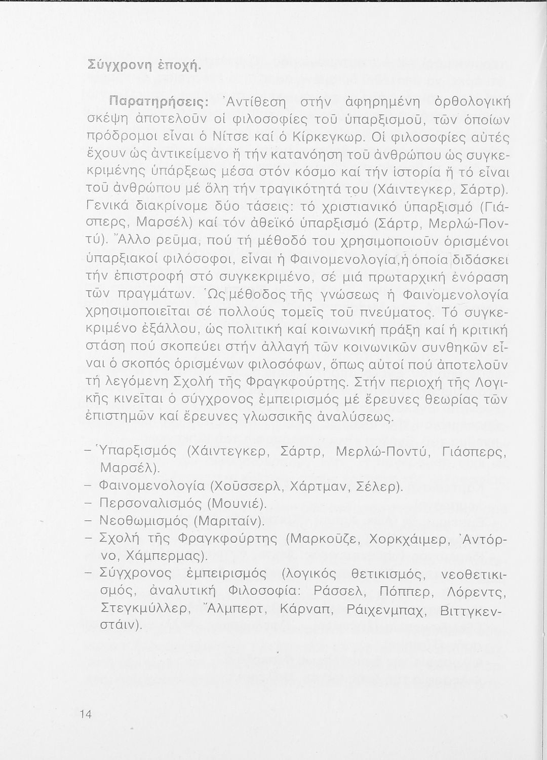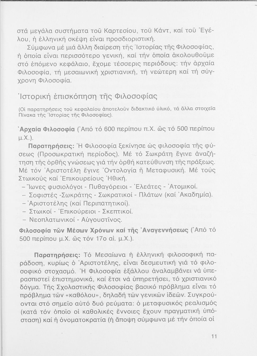 Παρουσίαση περιεχομένου: Σχολικό εγχειρίδιο Φιλοσοφίας Γ΄ Λυκείου που ακολουθεί μια ιστορική πραγμάτευση επιστημολογικών, ηθικών και αισθητικών ζητημάτων και καλύπτει δύο περιόδους: α) την ελληνική αρχαιότητα και β) την σύγχρονη ευρωπαϊκή σκέψη από τον Descartes και τον Kant στον λογικό θετικισμό και τον νεοκαντιανισμό. Περιέχει εκτενές κεφάλαιο για τους προσωκρατικούς.