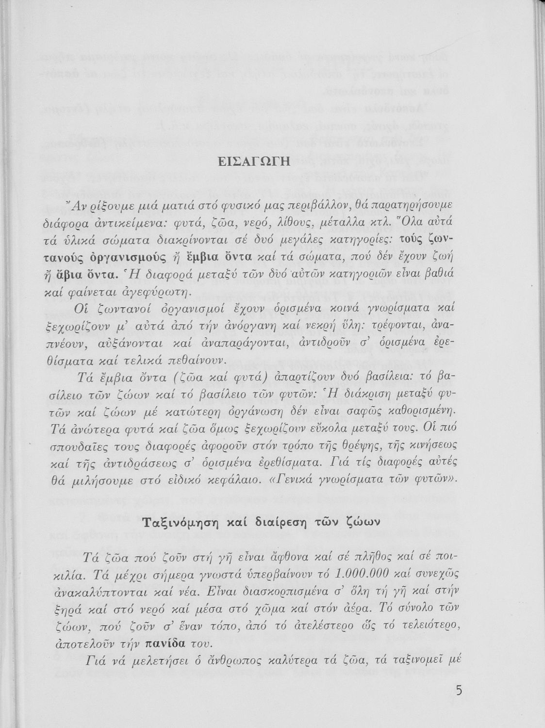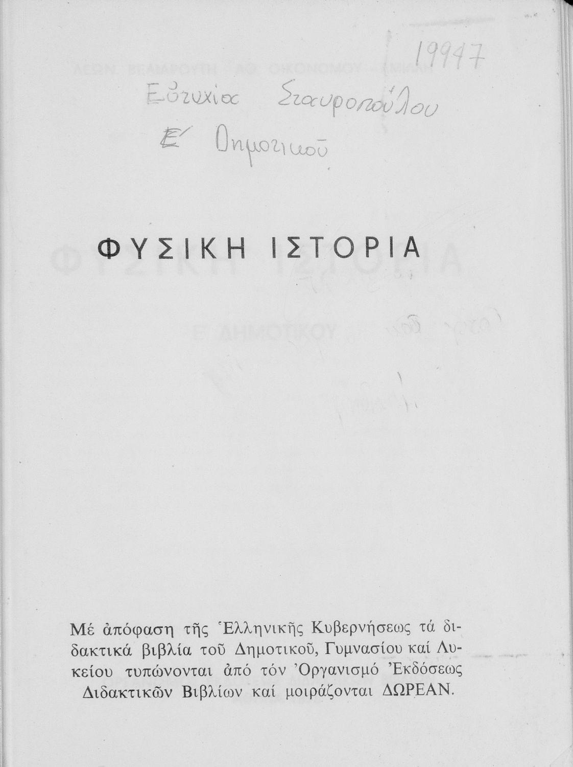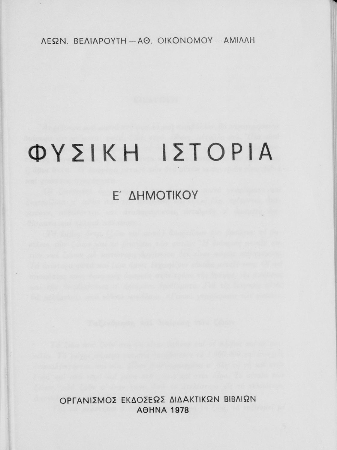 Σχολικό εγχειρίδιο της Ε΄ Δημοτικού για το μάθημα της Φυσικής Ιστορίας στο Δημοτικό. Περιέχει πληροφορίες για την ζωολογία φυτολογία και την ορυκτολογία. Το βιβλίο έχει εικόνες, οι οποίες διευκολύνουν τη διδασκαλία. Ο λόγος των κειμένων είναι απλός και κατανοητός για τους μαθητές.