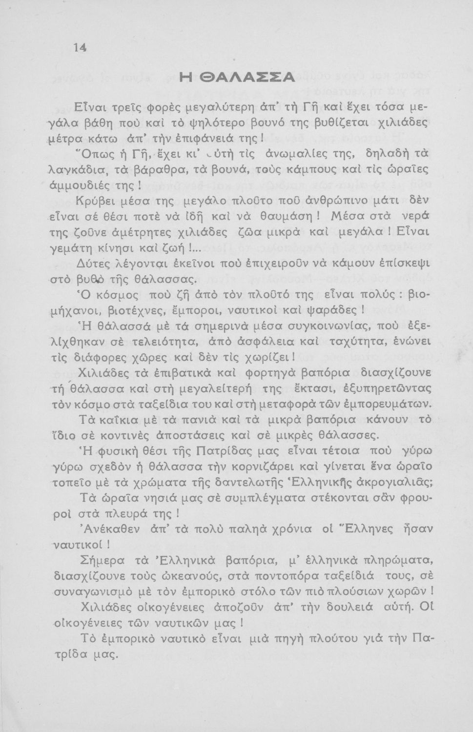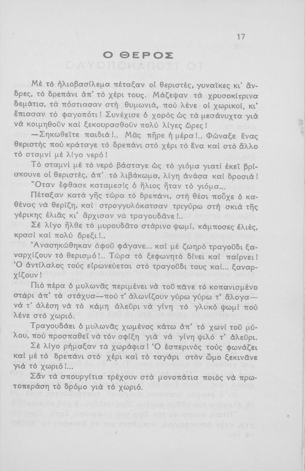 Μάθημα: Νέα Ελληνικά Γλώσσα: Δημοτική Παρουσίαση περιεχομένου: Εξωσχολικό ανάγνωσμα για μαθητές του Δημοτικού που περιλαμβάνει σύντομα διηγήματα εμπνευσμένα από τη κοινωνική ζωή, τη φύση και το συναίσθημα. Ο συγγραφέας είναι υπάλληλος του Υπουργείου Παιδείας. |