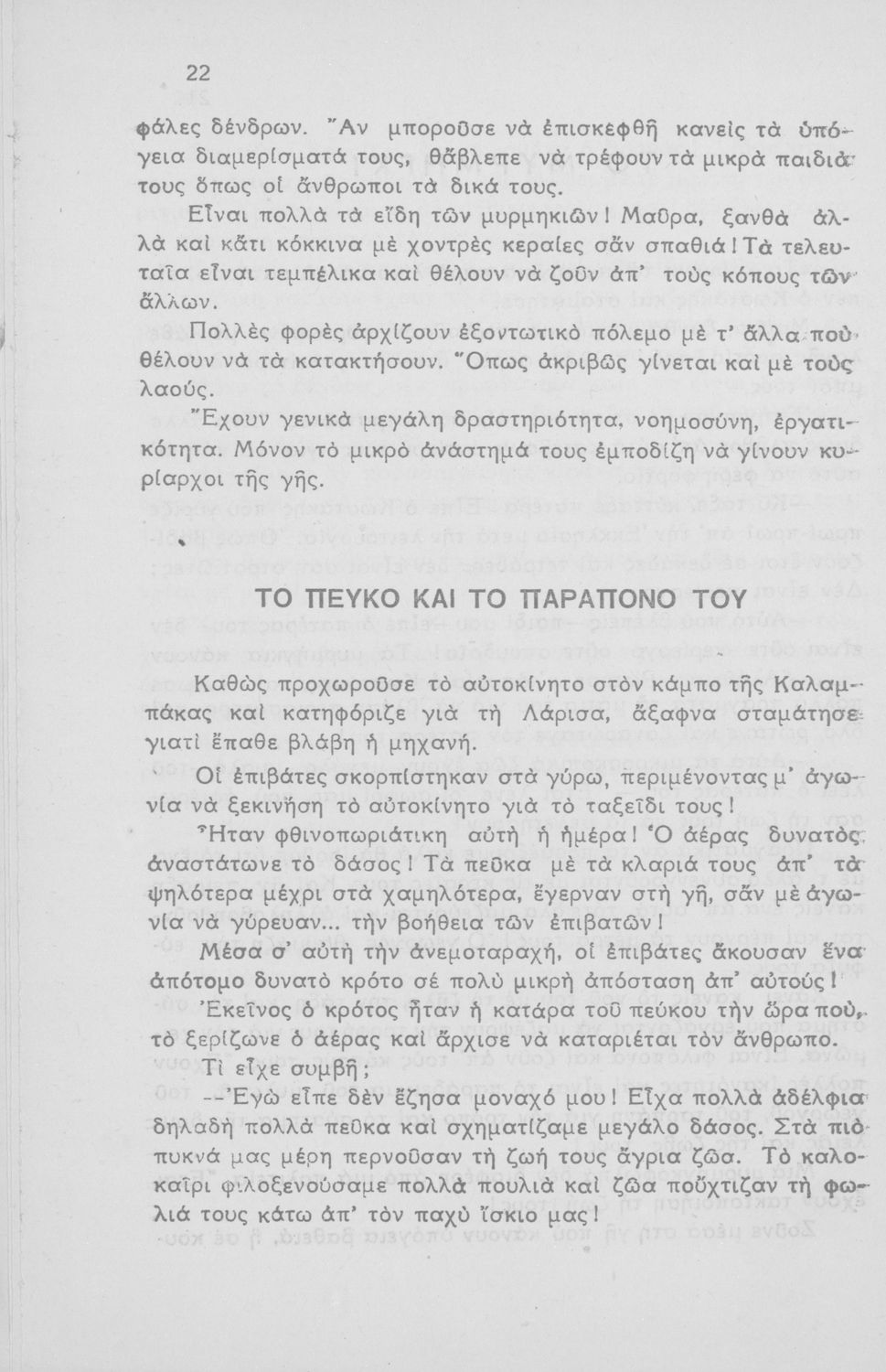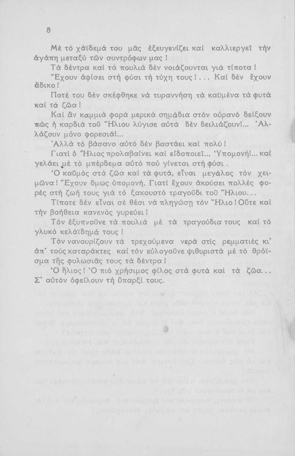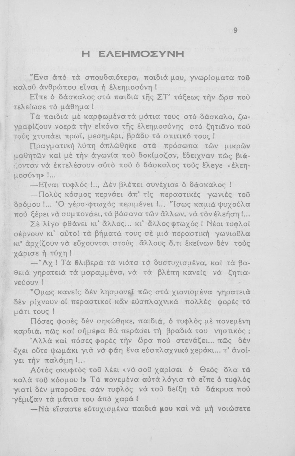 Εξωσχολικό ανάγνωσμα για μαθητές του Δημοτικού που περιλαμβάνει σύντομα διηγήματα εμπνευσμένα από τη κοινωνική ζωή, τη φύση και το συναίσθημα. Ο συγγραφέας είναι υπάλληλος του Υπουργείου Παιδείας.