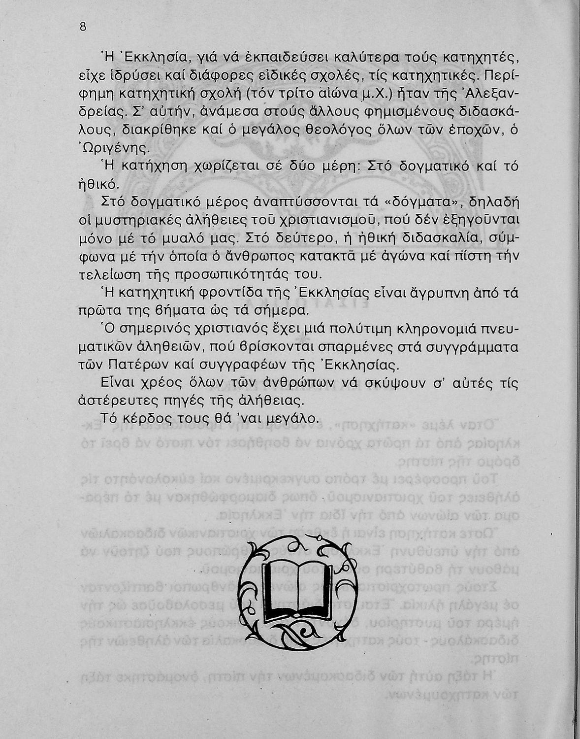 Σχολικό εγχειρίδιο Θρησκευτικών ΣΤ΄ Δημοτικού που αναλύει την έννοια της κατήχησης στις διάφορες θρησκείες με έμφαση στο ορθόδοξο χριστιανικό δόγμα, το οποίο εξετάζει από δογματική και ηθική σκοπιά. Περιλαμβάνει και στοιχεία λειτουργικής της Ορθόδοξης Εκκλησίας.