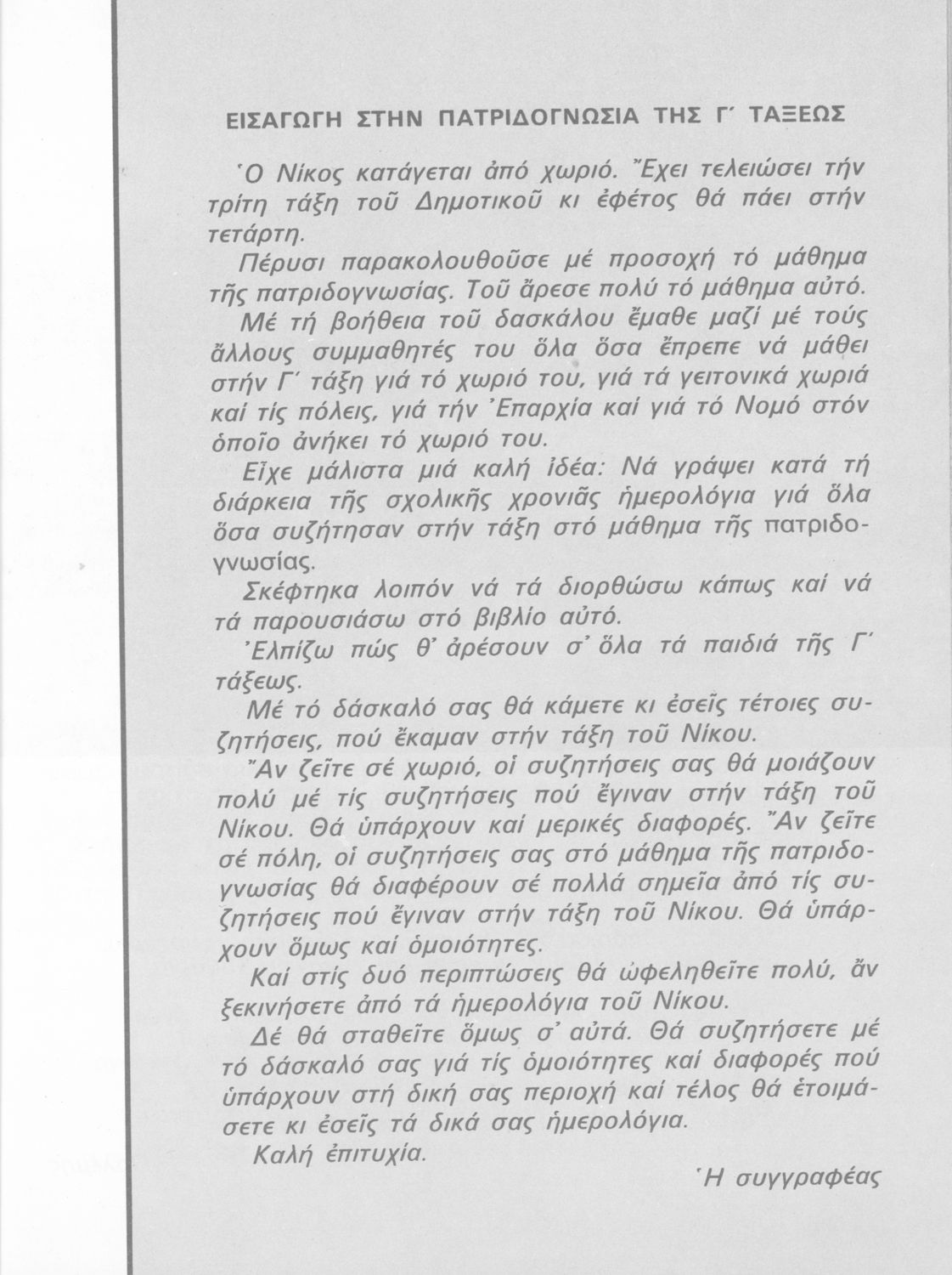 Σχολικό εγχειρίδιο Γεωγραφίας Γ ΄ και Δ' Δημοτικού. Το πρώτο μέρος του βιβλίου απευθύνεται σε μαθητές της Γ' Δημοτικού και αποτελεί μια εισαγωγή στην πατριδογνωσία με έμφαση στις παραδόσεις της ελληνικής ...