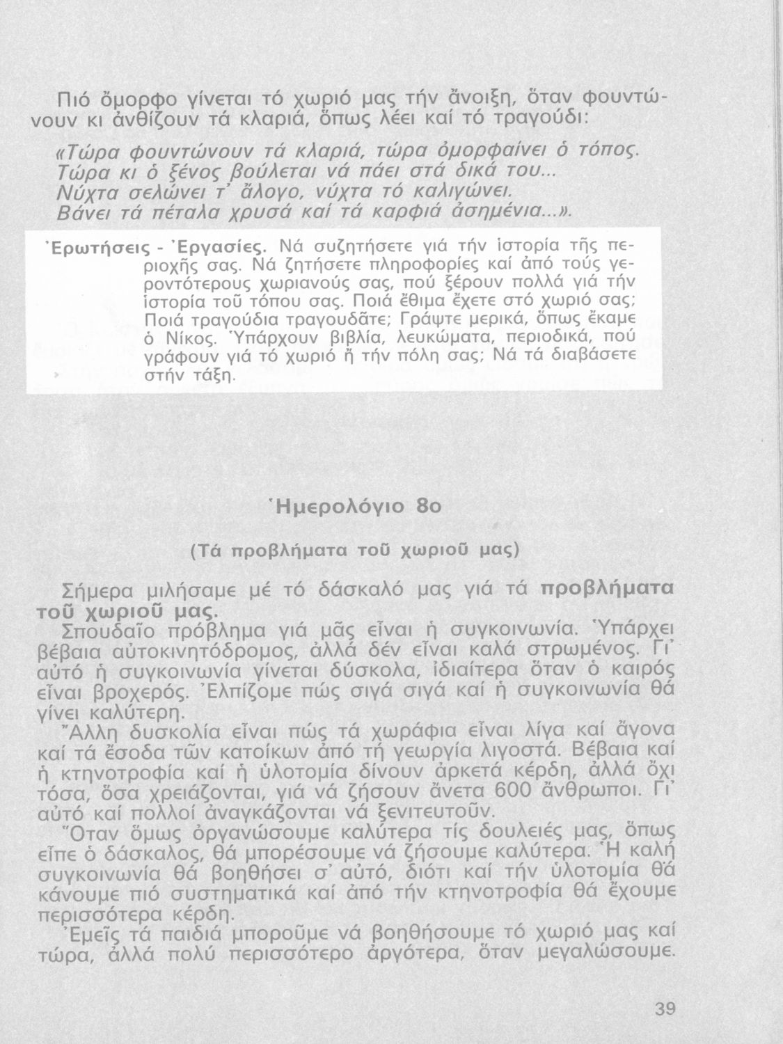 Παρουσίαση περιεχομένου: Σχολικό εγχειρίδιο Γεωγραφίας Γ ΄ και Δ' Δημοτικού. Το πρώτο μέρος του βιβλίου απευθύνεται σε μαθητές της Γ' Δημοτικού και αποτελεί μια εισαγωγή στην πατριδογνωσία με έμφαση στις παραδόσεις της ελληνικής επαρχίας. Το δεύτερο μέρος αφορά την Δ' Δημοτικού και εξετάζει την οικονομική, πολιτική και γεωφυσική γεωγραφία της Ελλάδας.