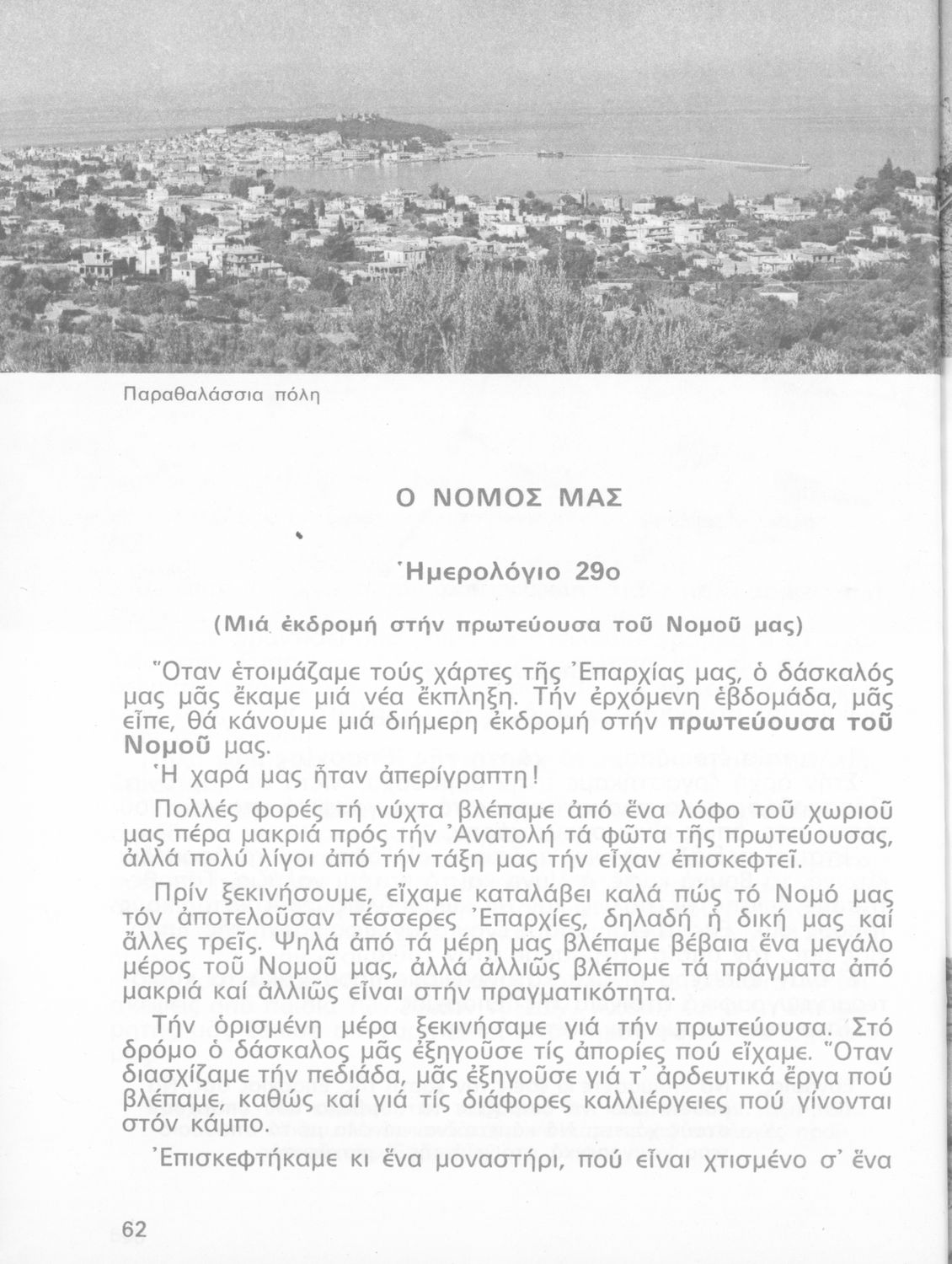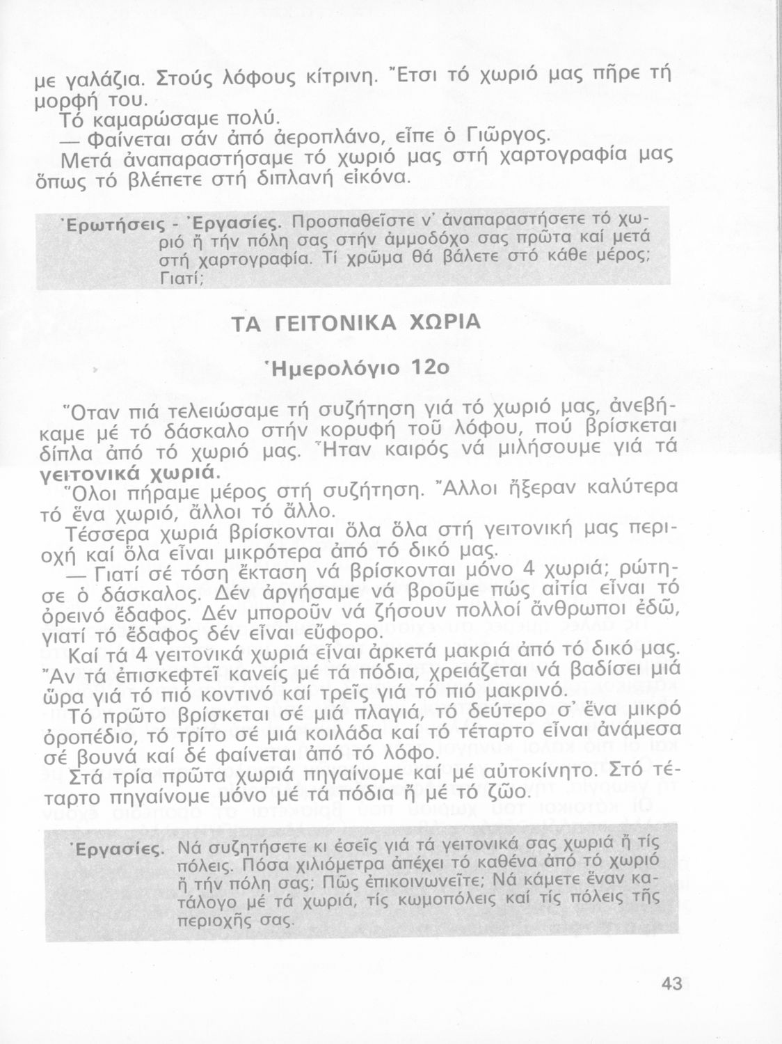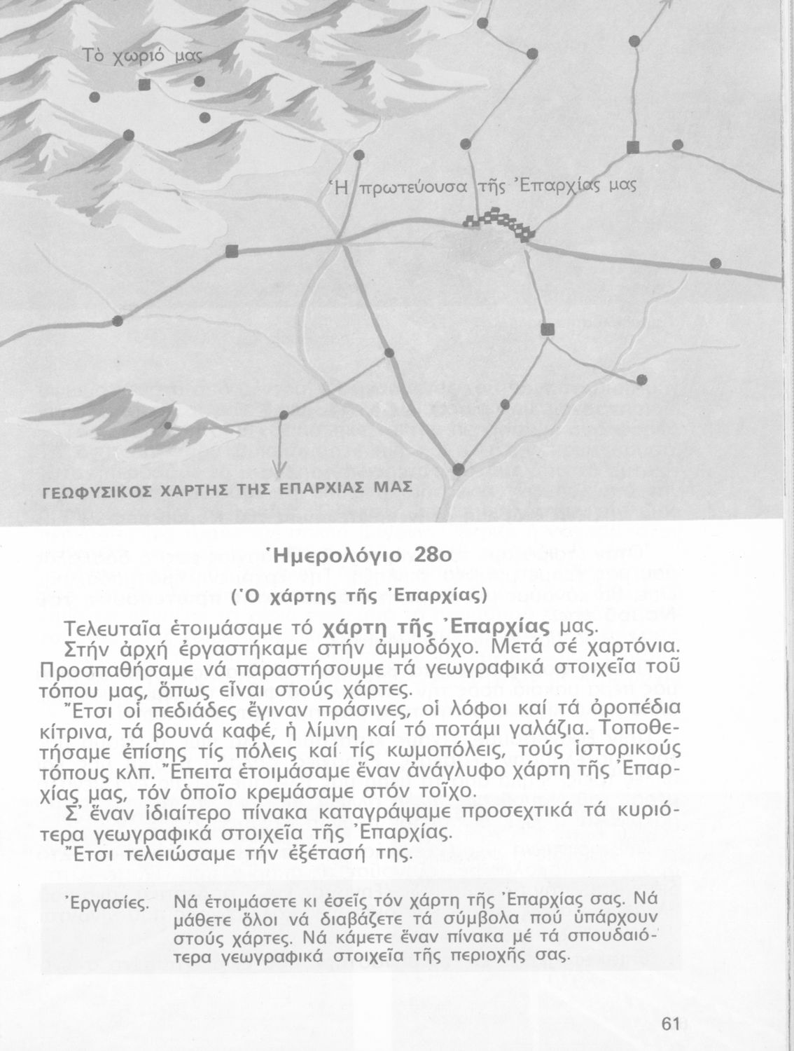 Παρουσίαση περιεχομένου: Σχολικό εγχειρίδιο Γεωγραφίας Γ ΄ και Δ' Δημοτικού. Το πρώτο μέρος του βιβλίου απευθύνεται σε μαθητές της Γ' Δημοτικού και αποτελεί μια εισαγωγή στην πατριδογνωσία με έμφαση στις παραδόσεις της ελληνικής επαρχίας. Το δεύτερο μέρος αφορά την Δ' Δημοτικού και εξετάζει την οικονομική, πολιτική και γεωφυσική γεωγραφία της Ελλάδας.