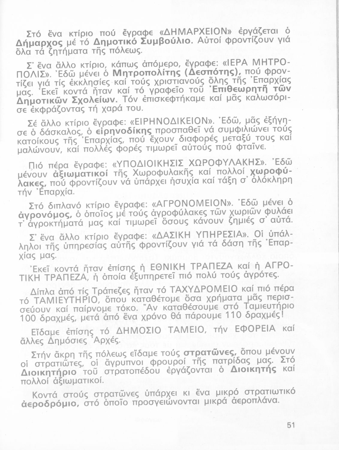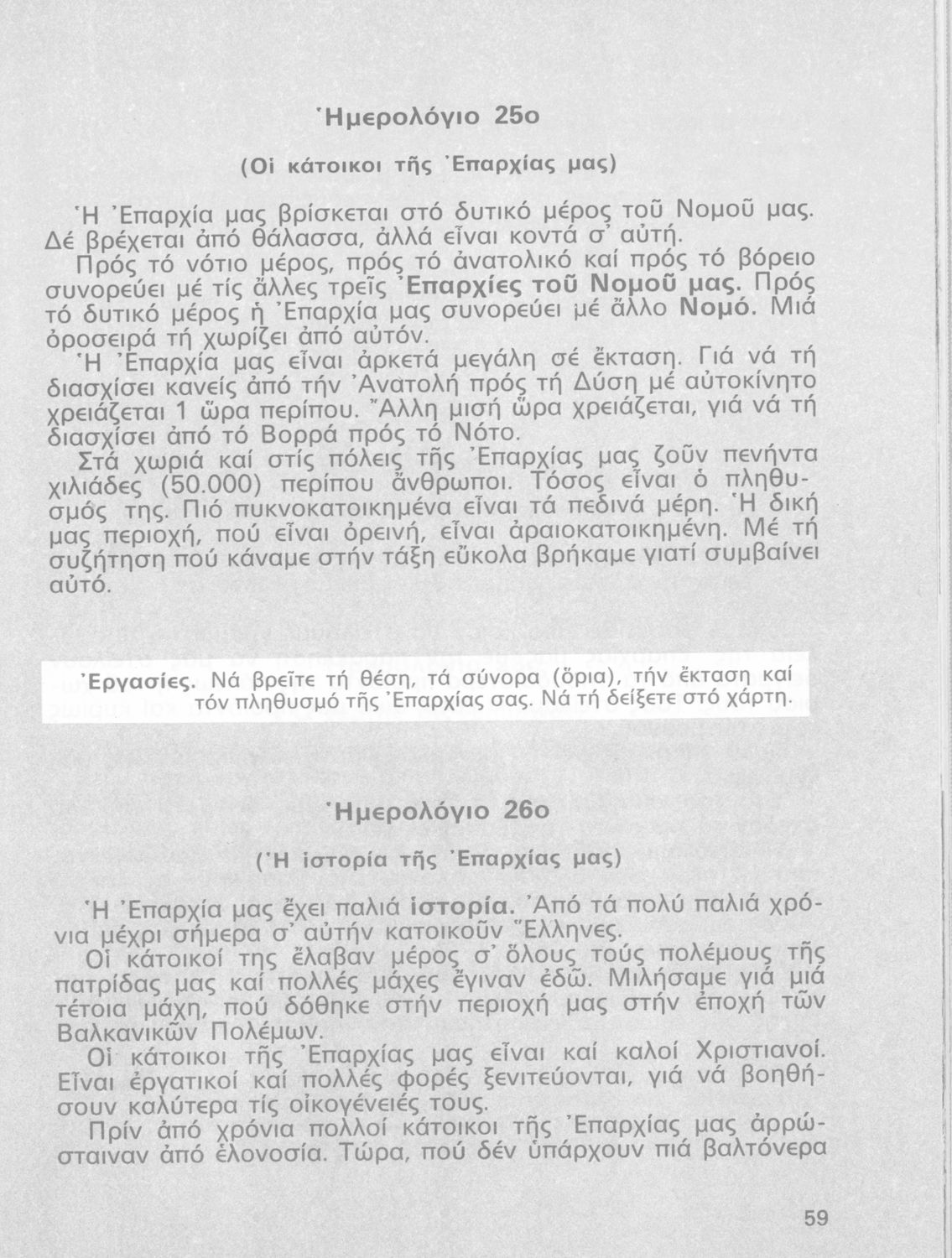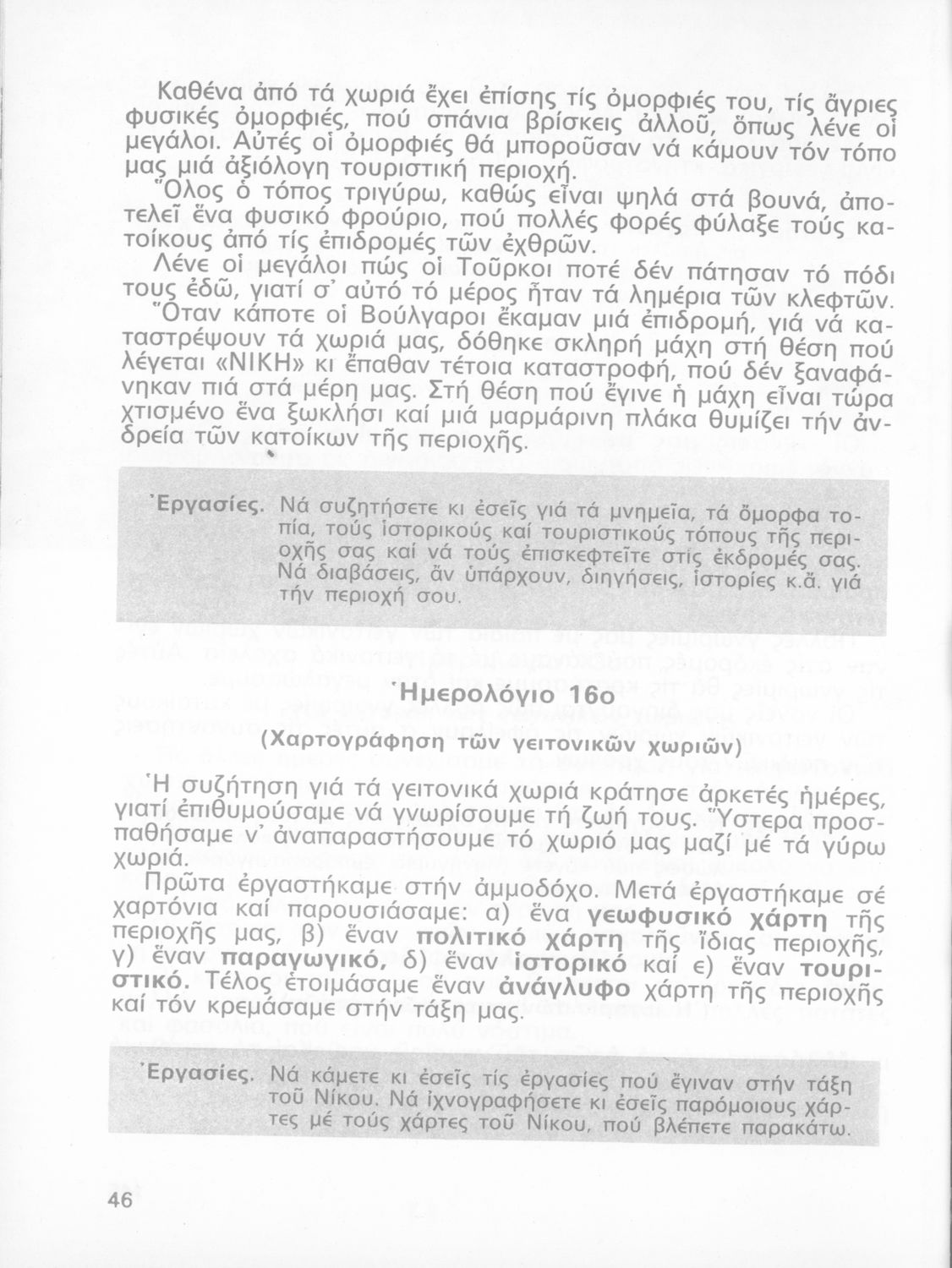 Παρουσίαση περιεχομένου: Σχολικό εγχειρίδιο Γεωγραφίας Γ ΄ και Δ' Δημοτικού. Το πρώτο μέρος του βιβλίου απευθύνεται σε μαθητές της Γ' Δημοτικού και αποτελεί μια εισαγωγή στην πατριδογνωσία με έμφαση στις παραδόσεις της ελληνικής επαρχίας. Το δεύτερο μέρος αφορά την Δ' Δημοτικού και εξετάζει την οικονομική, πολιτική και γεωφυσική γεωγραφία της Ελλάδας.