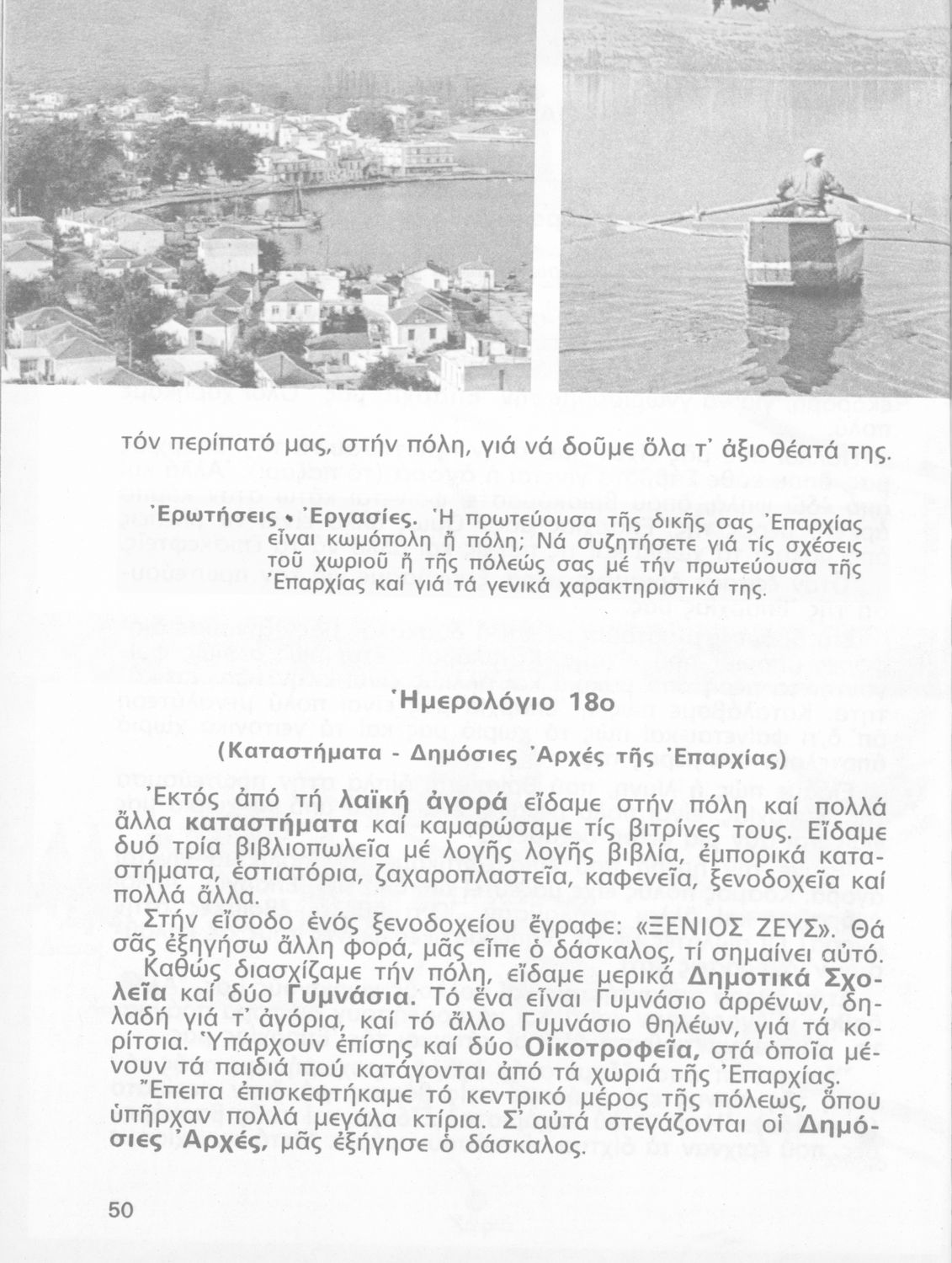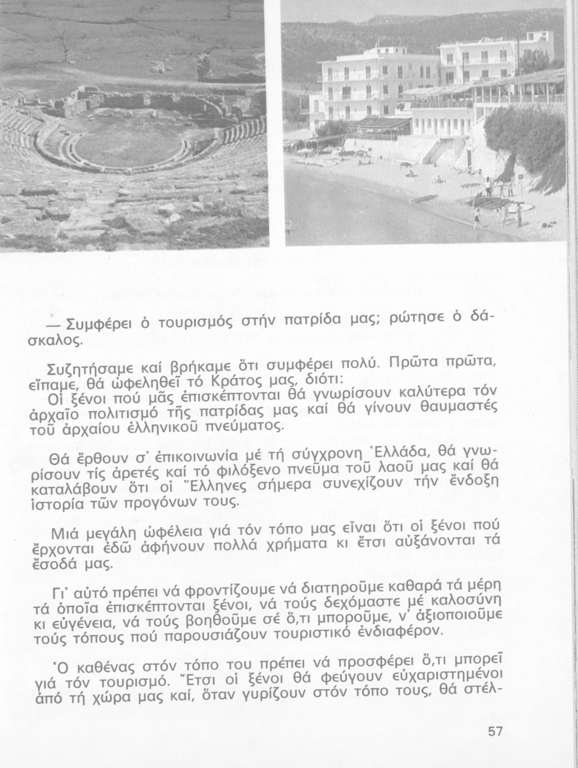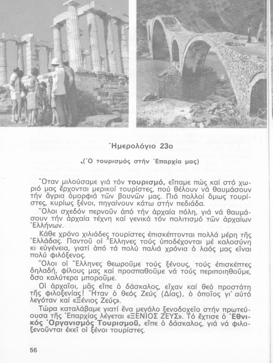 Σχολικό εγχειρίδιο Γεωγραφίας Γ ΄ και Δ' Δημοτικού. Το πρώτο μέρος του βιβλίου απευθύνεται σε μαθητές της Γ' Δημοτικού και αποτελεί μια εισαγωγή στην πατριδογνωσία με έμφαση στις παραδόσεις της ελληνικής επαρχίας. Το δεύτερο μέρος αφορά την Δ' Δημοτικού και εξετάζει την οικονομική, πολιτική και γεωφυσική γεωγραφία της Ελλάδας.