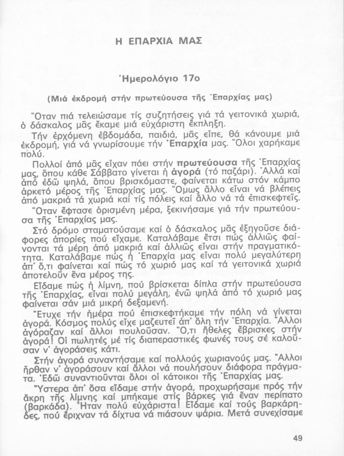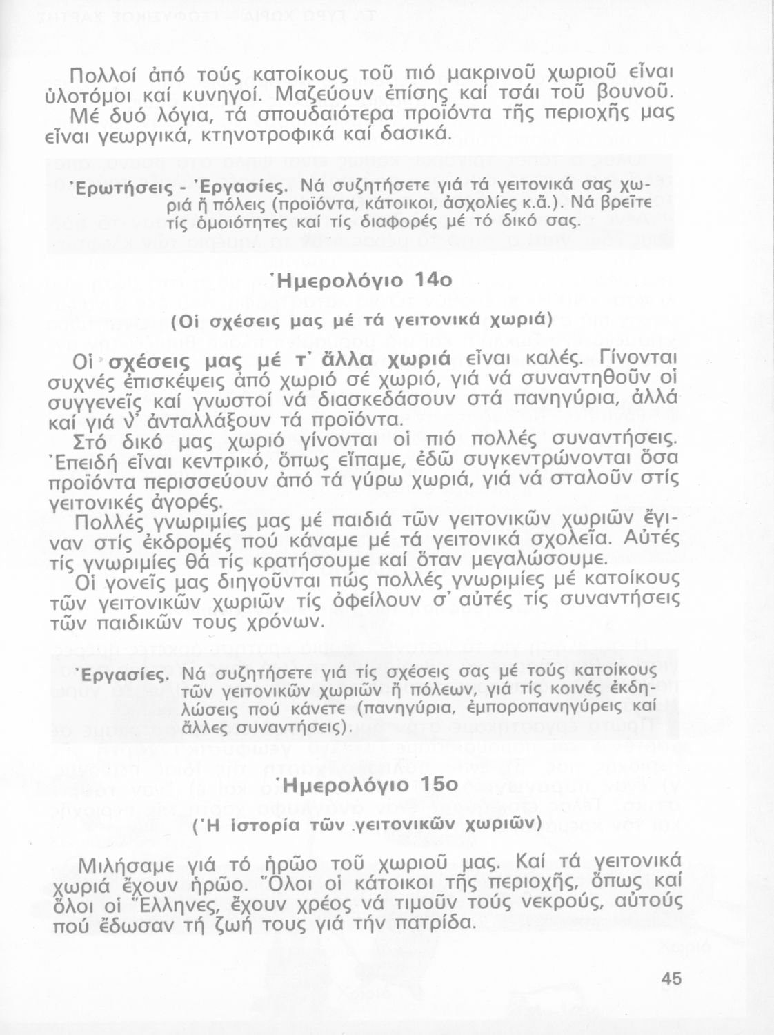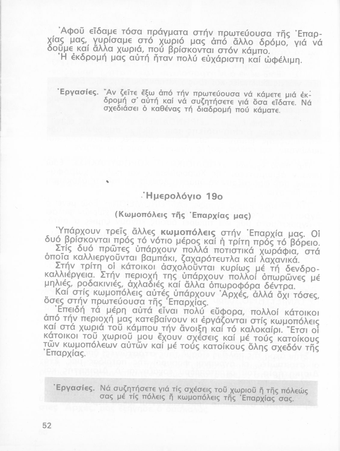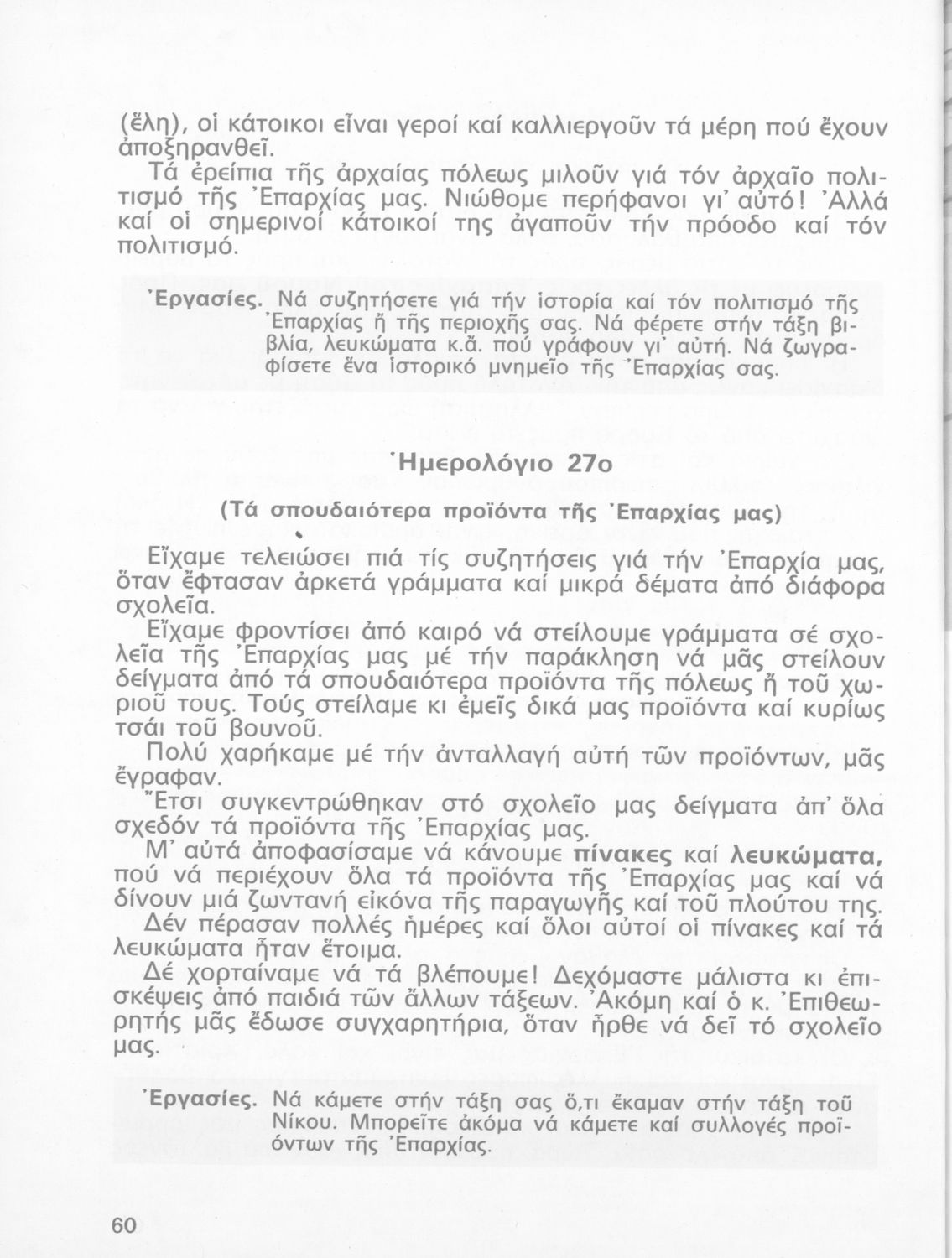 Σχολικό εγχειρίδιο Γεωγραφίας Γ ΄ και Δ' Δημοτικού. Το πρώτο μέρος του βιβλίου απευθύνεται σε μαθητές της Γ' Δημοτικού και αποτελεί μια εισαγωγή στην πατριδογνωσία με έμφαση στις παραδόσεις της ελληνικής επαρχίας. Το δεύτερο μέρος αφορά την Δ' Δημοτικού και εξετάζει την οικονομική, πολιτική και γεωφυσική γεωγραφία της Ελλάδας.