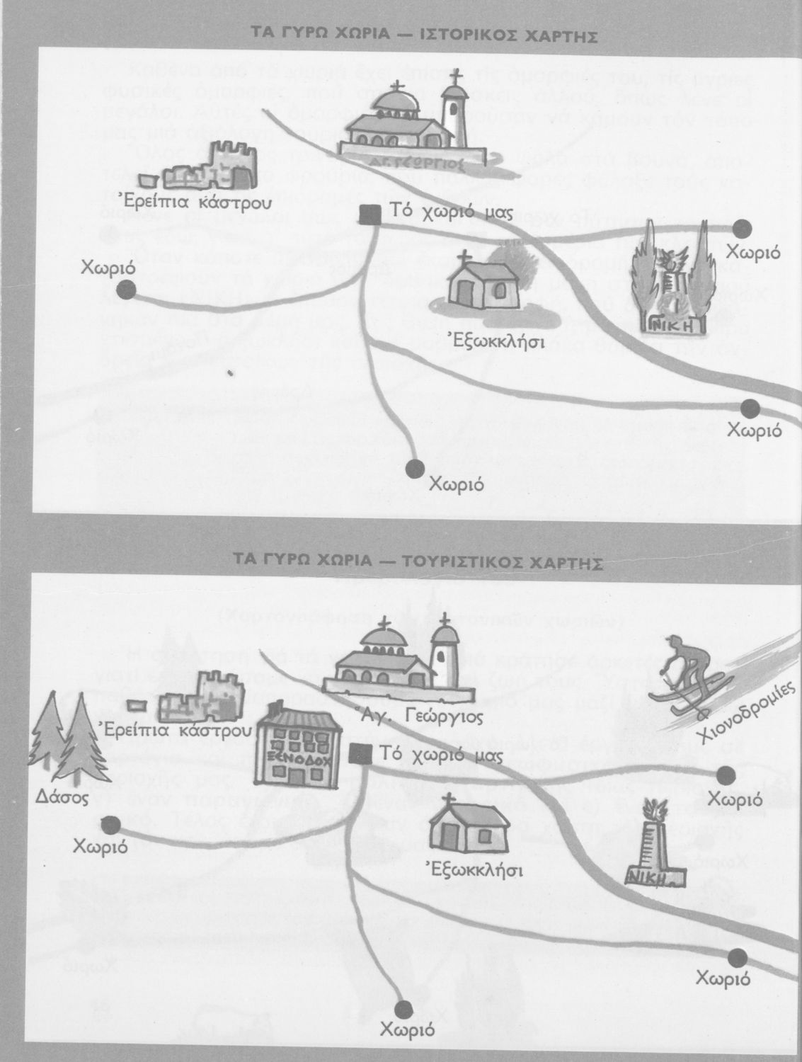 Μαθητικό βοήθημα Γεωγραφίας για την Γ΄ και Δ΄ Δημοτικού που περιέχει χάρτες περιοχών της Ελλάδας τις οποίες εξετάζει από γεωφυσική, πολιτική και οικονομική άποψη.