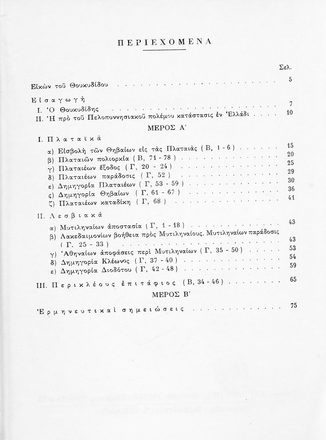 Σχολικό εγχειρίδιο Αρχαίων Ελληνικών για τις Δ΄, Ε΄ και ΣΤ΄ Γυμνασίου παλαιού τύπου που περιλαμβάνει σύντομο βιογραφικό σημείωμα του Θουκυδίδη, περιγραφή του ιστορικού πλαισίου, αποσπάσματα από τα Πλαταϊκά, τα