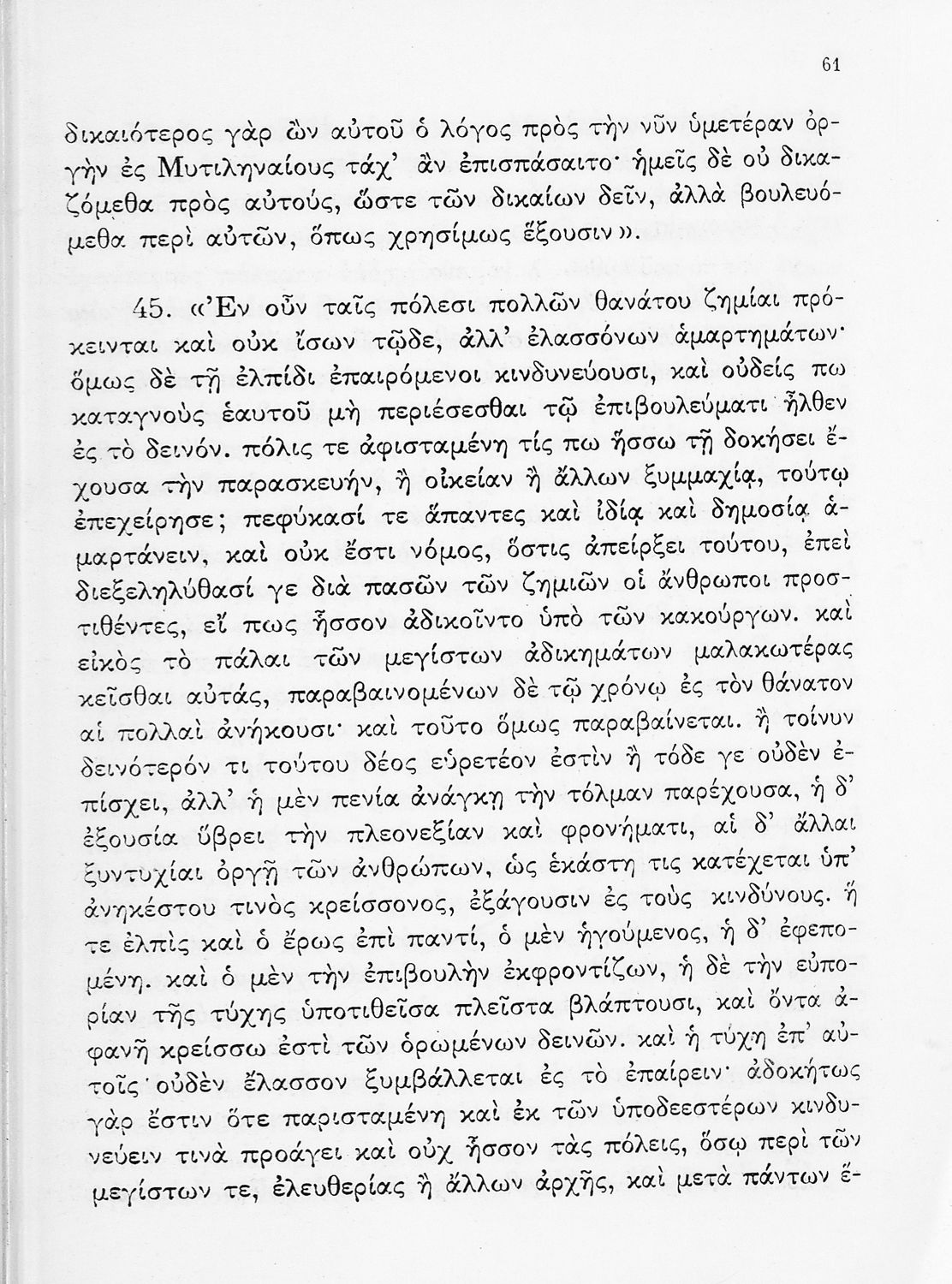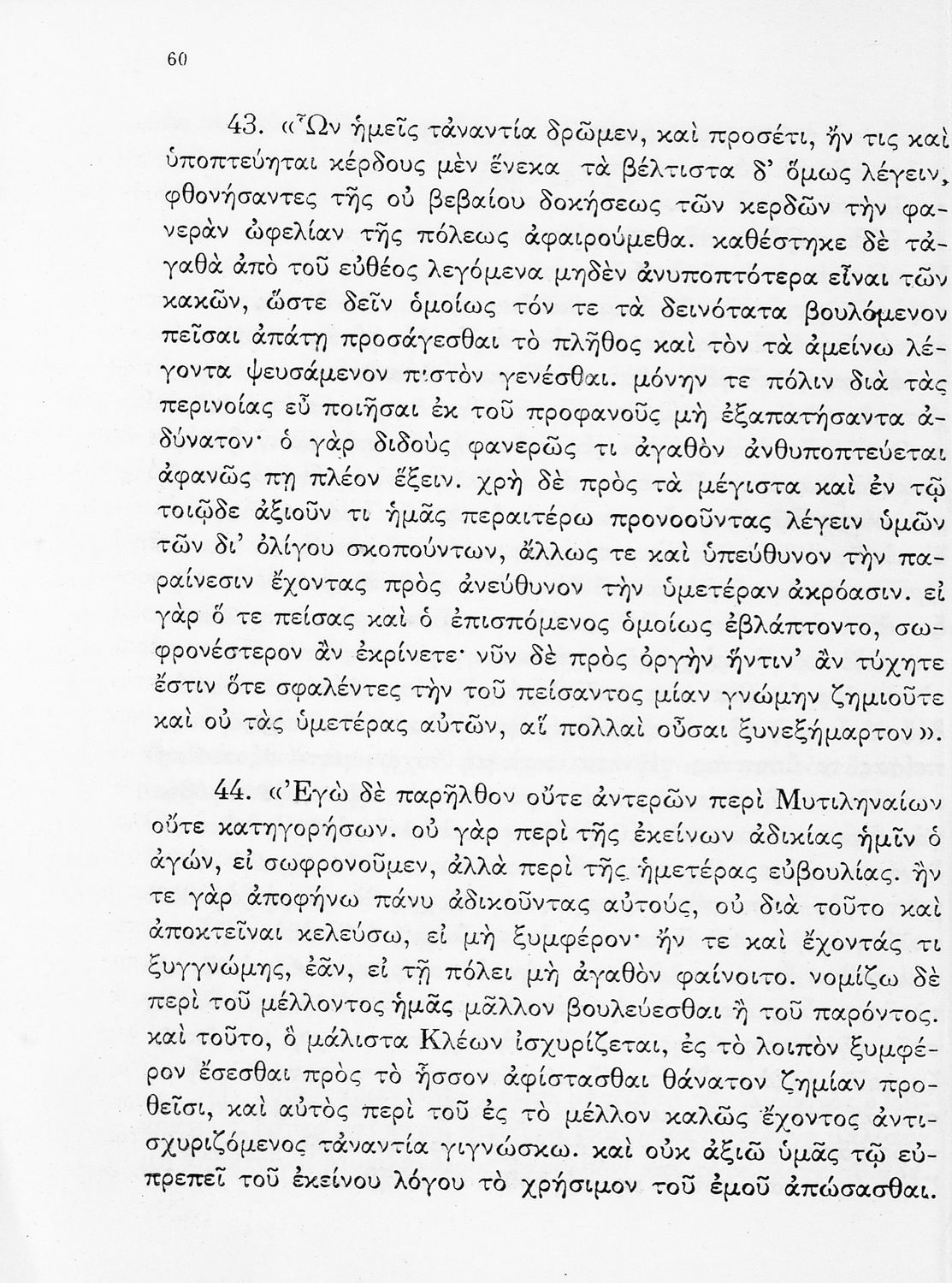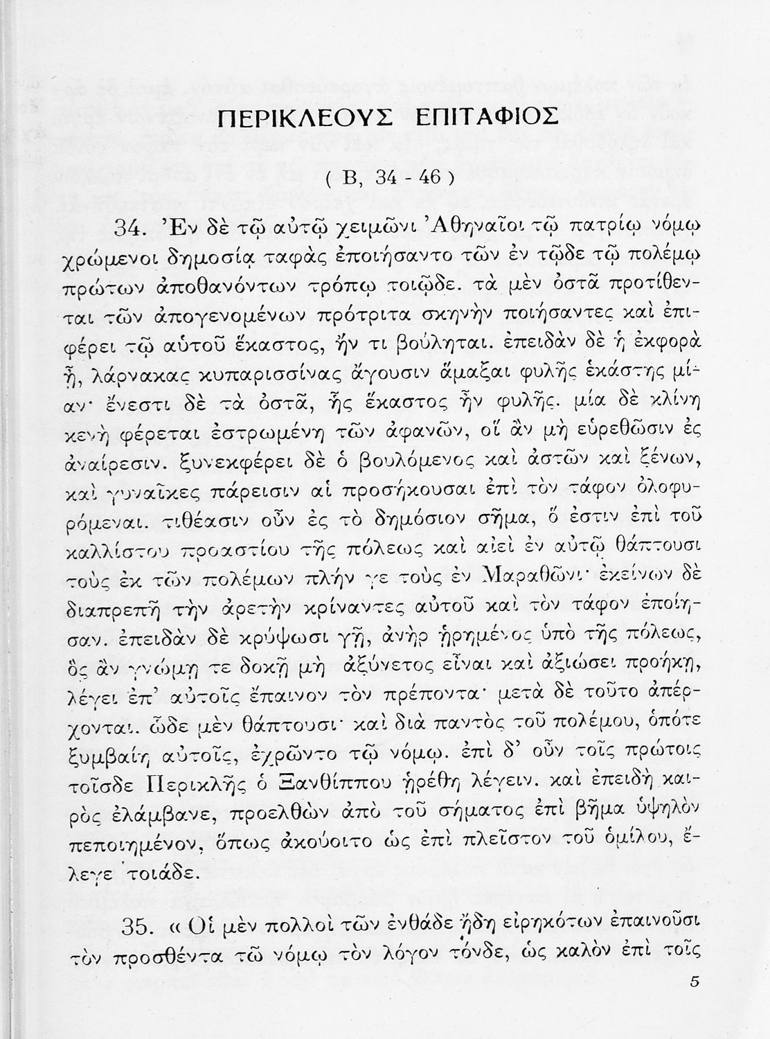 Σχολικό εγχειρίδιο Αρχαίων Ελληνικών Δ΄, Ε΄ και ΣΤ΄ Γυμνασίου που περιέχει εισαγωγή στη ζωή και το έργο του Θουκυδίδη, αποσπάσματα από τα Πλαταιϊκά, τα Λεσβιακά και τον Επιτάφιο του Περικλή και ερμηνευτικές σημειώσεις.