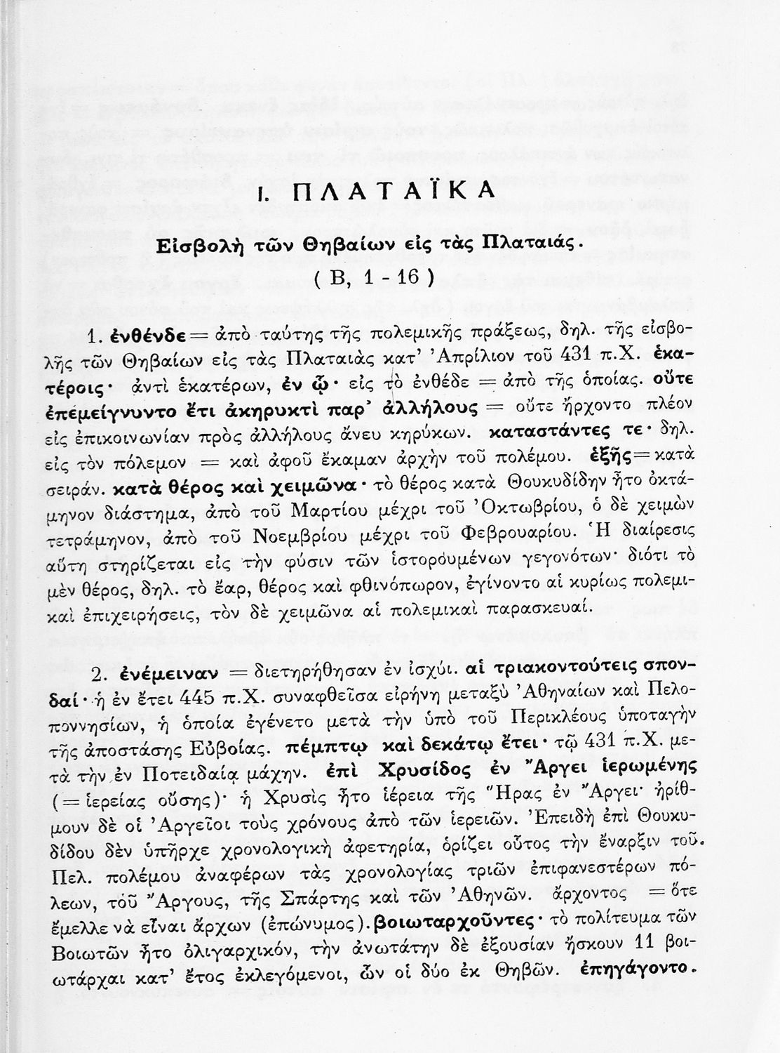 Σχολικό εγχειρίδιο Αρχαίων Ελληνικών για τις Δ΄, Ε΄ και ΣΤ΄ Γυμνασίου παλαιού τύπου που περιλαμβάνει σύντομο βιογραφικό σημείωμα του Θουκυδίδη, περιγραφή του ιστορικού πλαισίου, αποσπάσματα από τα Πλαταϊκά, τα