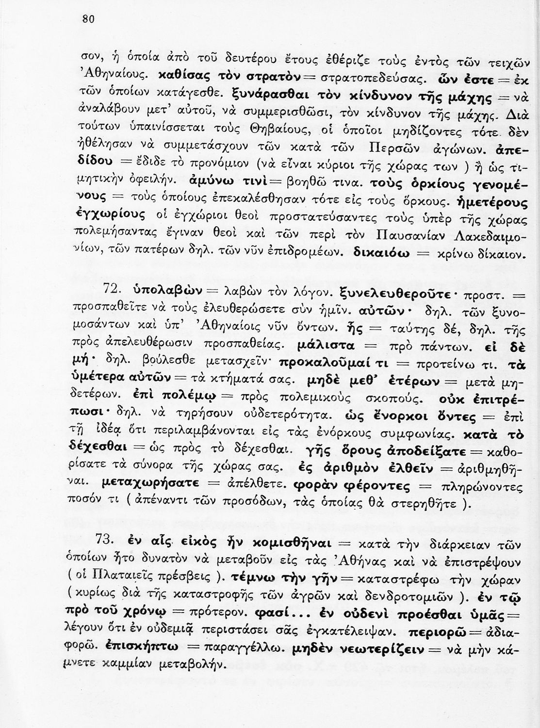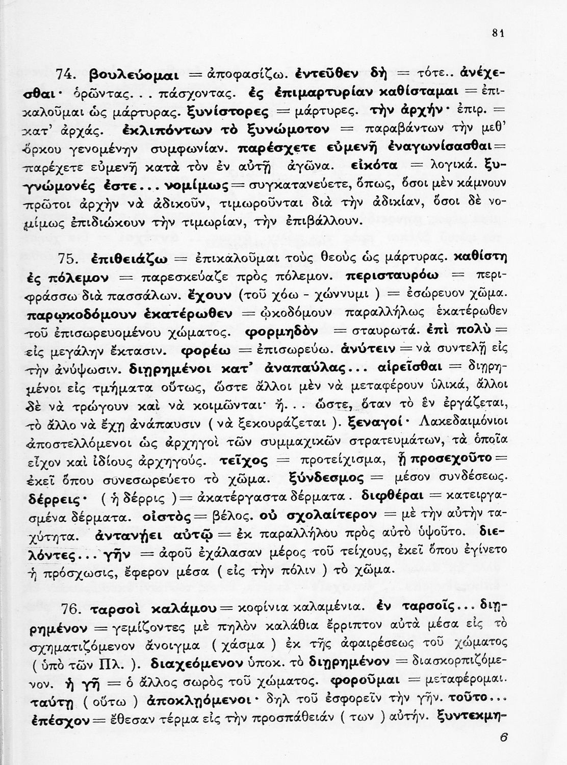 Μαθητικό βοήθημα Αρχαίων Ελληνικών ΣΤ΄ Γυμνασίου που περιλαμβάνει αποσπάσματα από τα Πλαταϊκά του Θουκυδίδη, μετάφραση, γραμματικά, συντακτικά και ερμηνευτικά σχόλια.