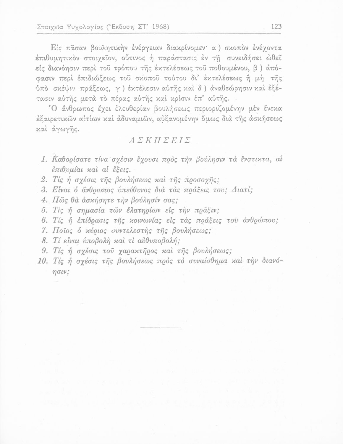 Σχολικό εγχειρίδιο Πειραματικής Ψυχολογίας για τη Γ΄ Γυμνασίου χωρισμένο σε τρία τμήματα: το παριστάναι, το συναισθάνεσθαι, και το βούλεσθαι.