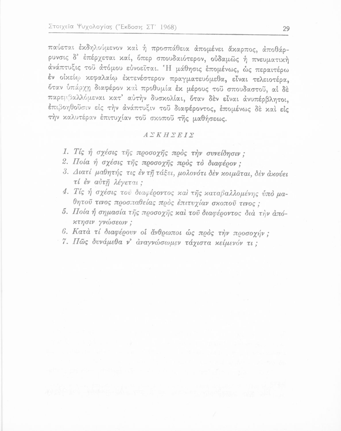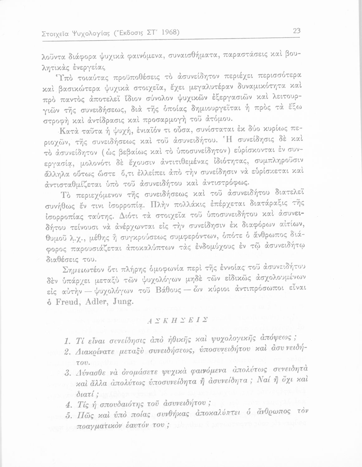 Σχολικό εγχειρίδιο Εμπειρικής Ψυχολογίας για τη Γ΄ Γυμνασίου χωρισμένο σε τρία τμήματα: το γνωστικό, το συναισθηματικό και το βουλητικό. Εξετάζει και τις ανωμαλίες της συνείδησης.