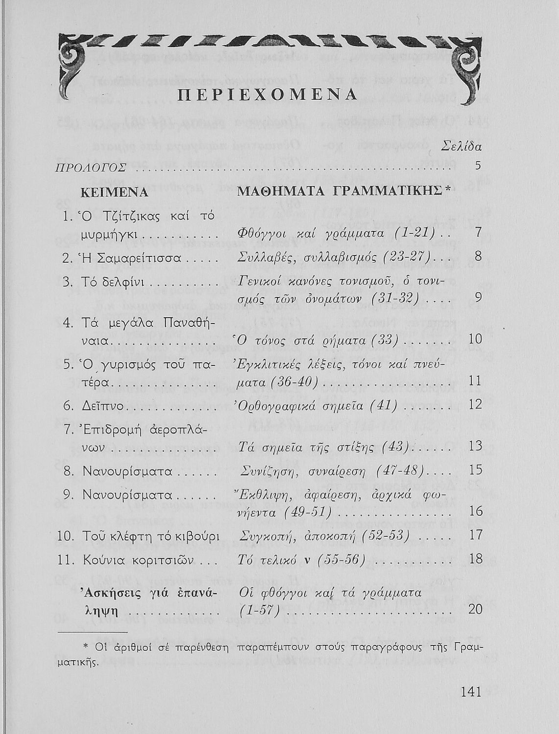 Σχολικό εγχειρίδιο για τη Γραμματική με κείμενα και ασκήσεις πάνω στα μέρη του λόγου και τις κλίσεις τους για εξάσκηση και εμπέδωση των μαθητών.