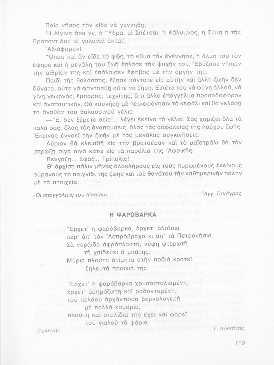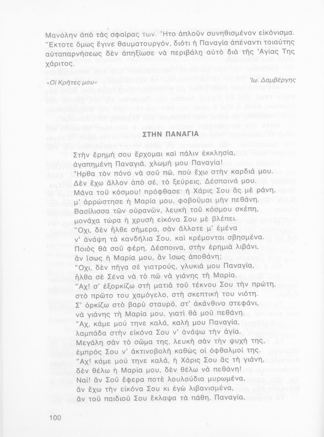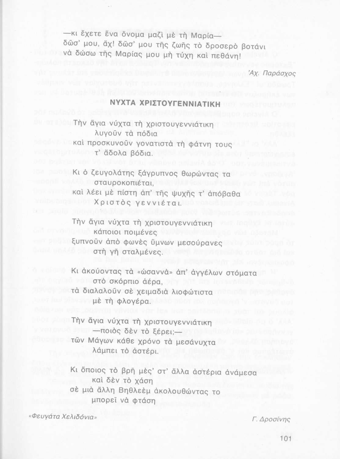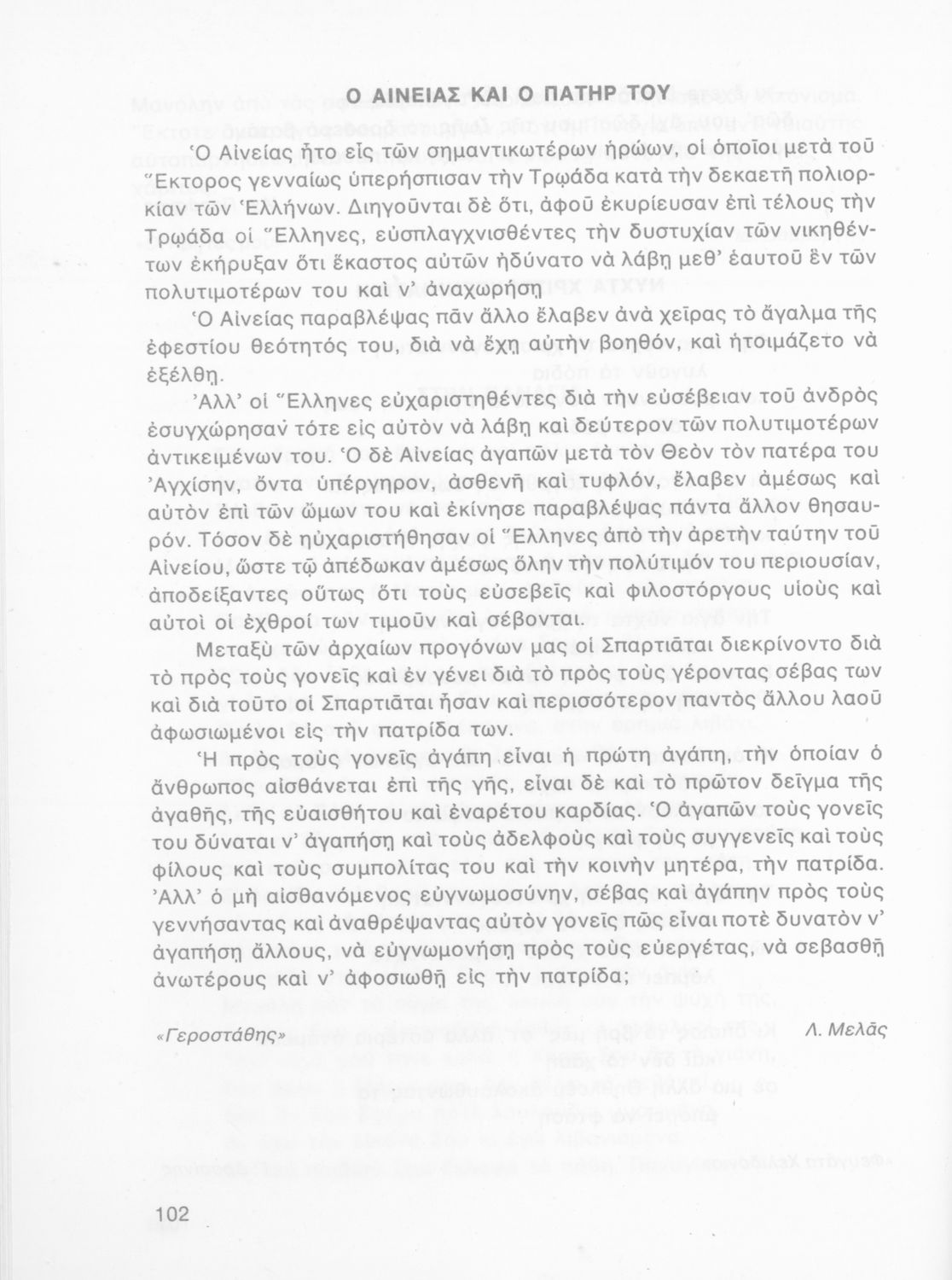 Σχολικό εγχειρίδιο Νέων Ελληνικών Γ΄ Γυμνασίου και Α' Αστικού Σχολείου που περιέχει πεζά και ποιήματα Ελλήνων συγγραφέων εμπνευσμένα από τη θρησκευτική και κοινωνική ζωή, την ελληνική μυθολογία, την αρχαία και