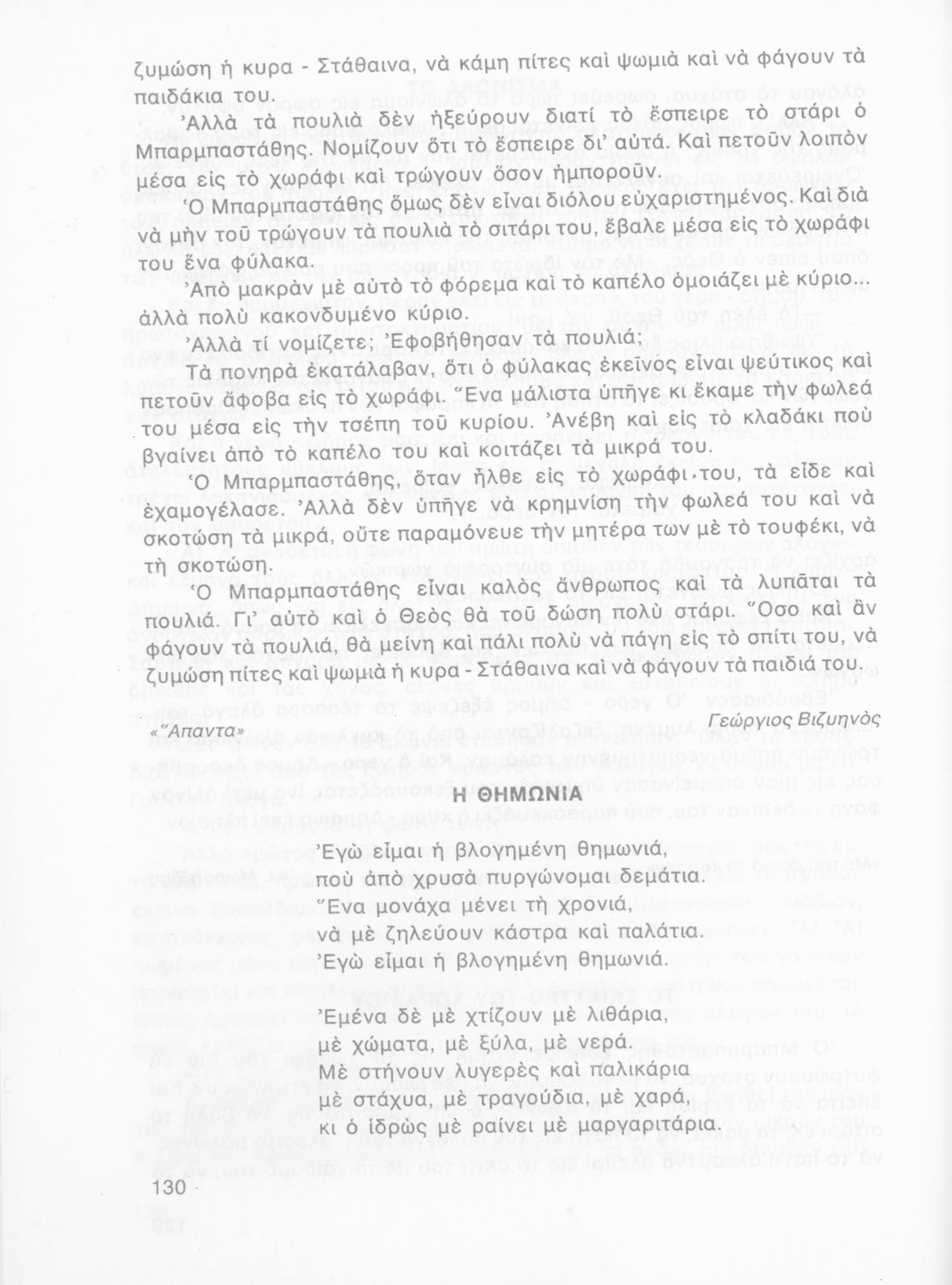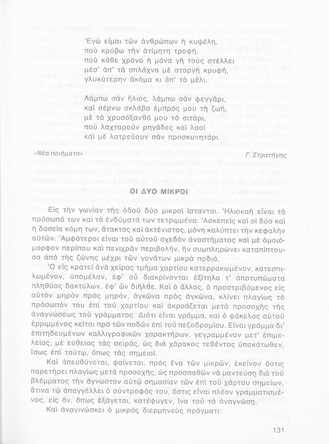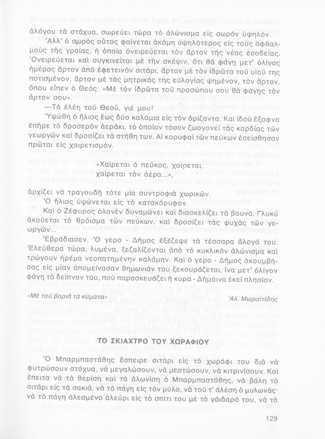 Σχολικό εγχειρίδιο Νέων Ελληνικών Γ΄ Γυμνασίου και Α' Αστικού Σχολείου που περιέχει πεζά και ποιήματα Ελλήνων συγγραφέων εμπνευσμένα από τη θρησκευτική και κοινωνική ζωή, την ελληνική μυθολογία, την αρχαία και