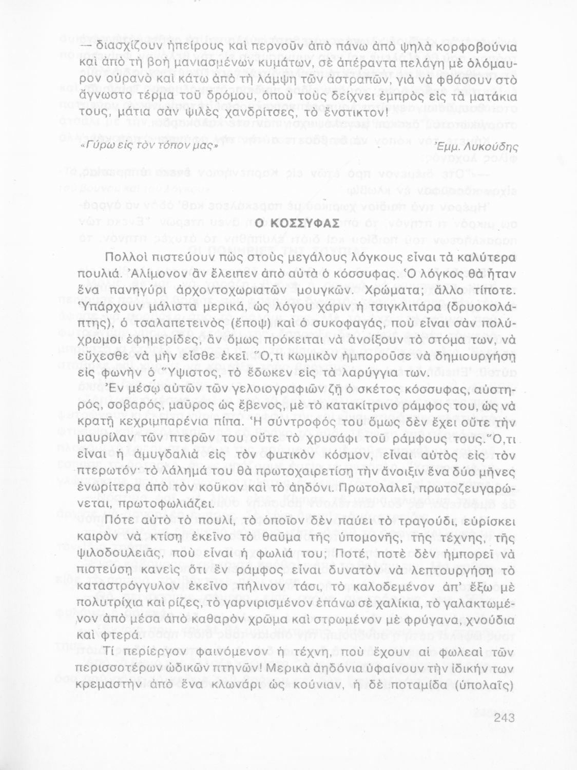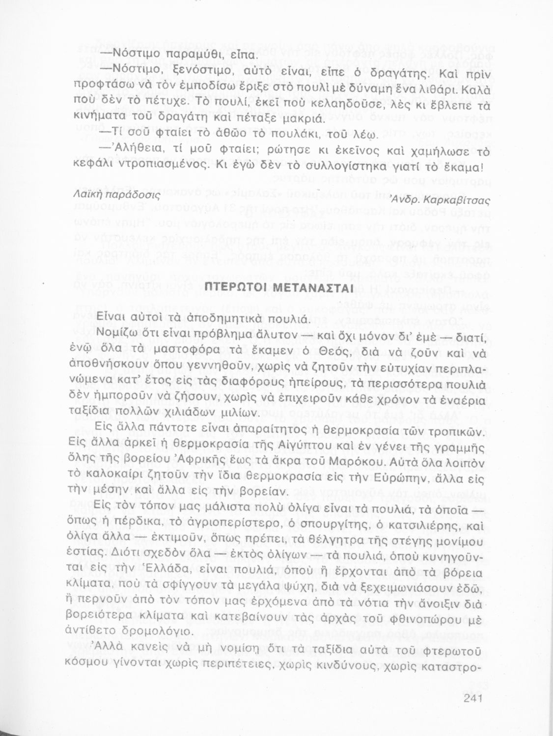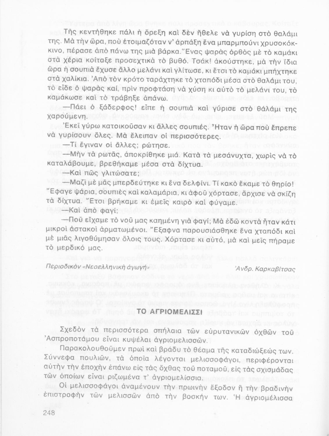 Σχολικό εγχειρίδιο Νέων Ελληνικών Α' Γυμνασίου που περιέχει ποιήματα και πεζά Ελλήνων συγγραφέων εμπνευσμένα από την αρχαία ελληνική ιστορία και μυθολογία, τη βυζαντινή και σύγχρονη ελληνική ιστορία και την καθημερινή ζωή. Περιέχει παράρτημα με βιογραφίες των συγγραφέων και λεξιλόγιο.