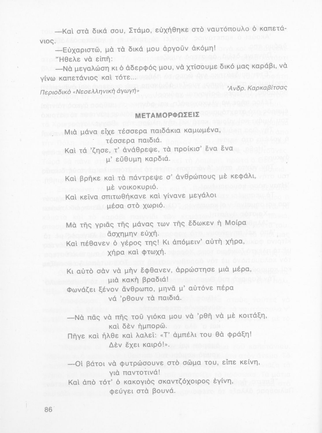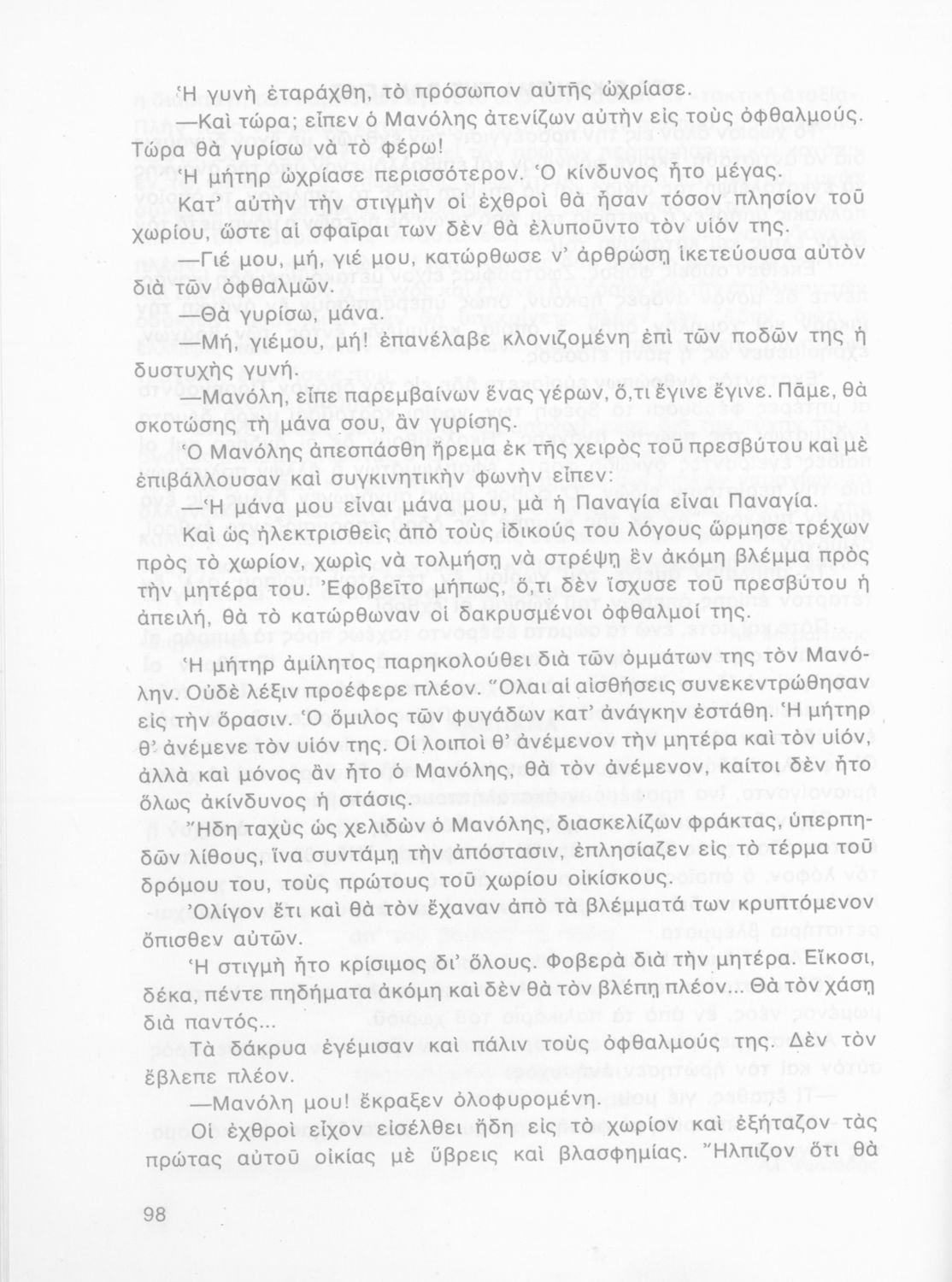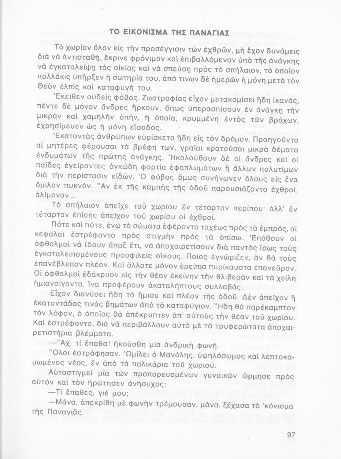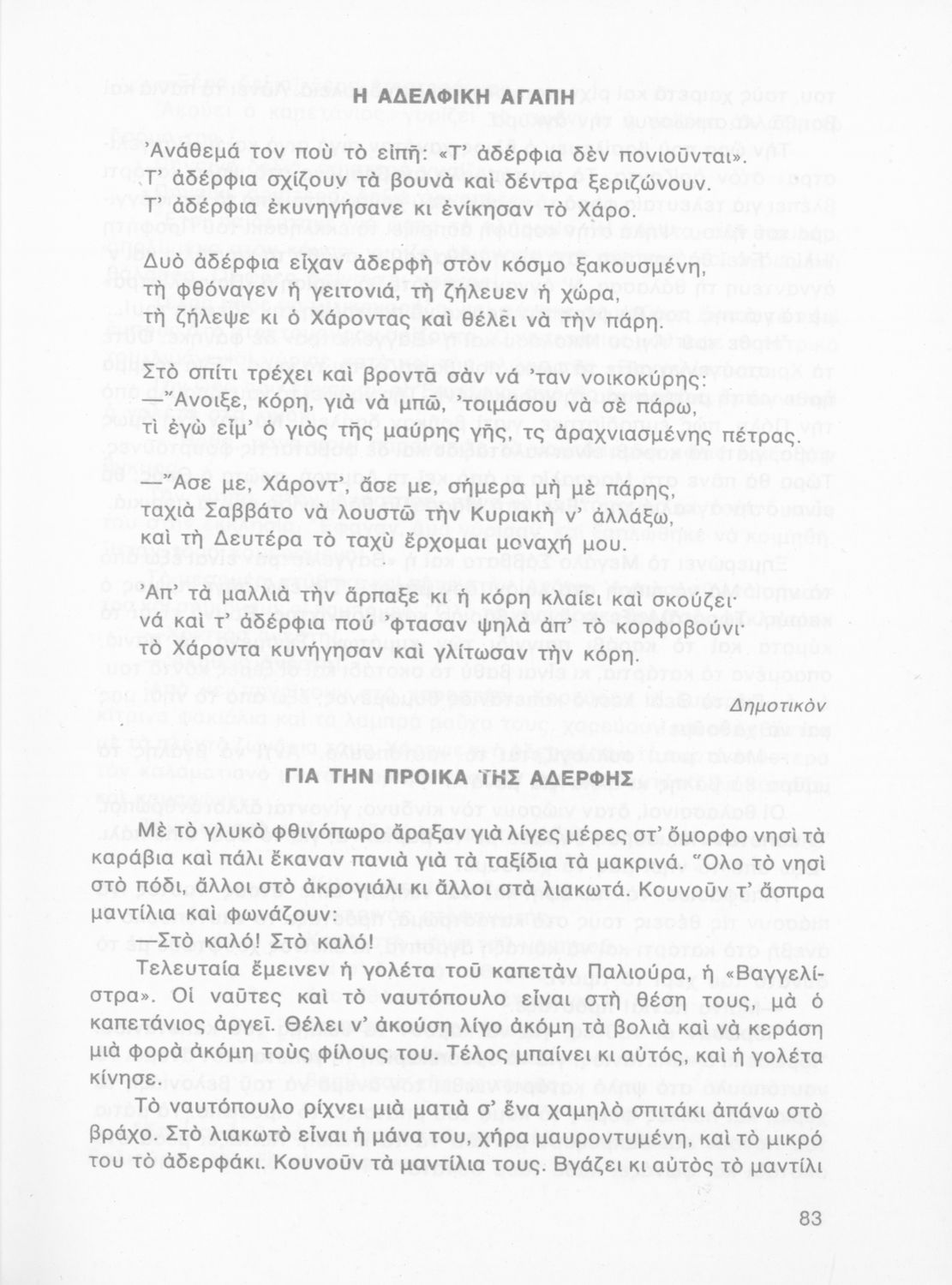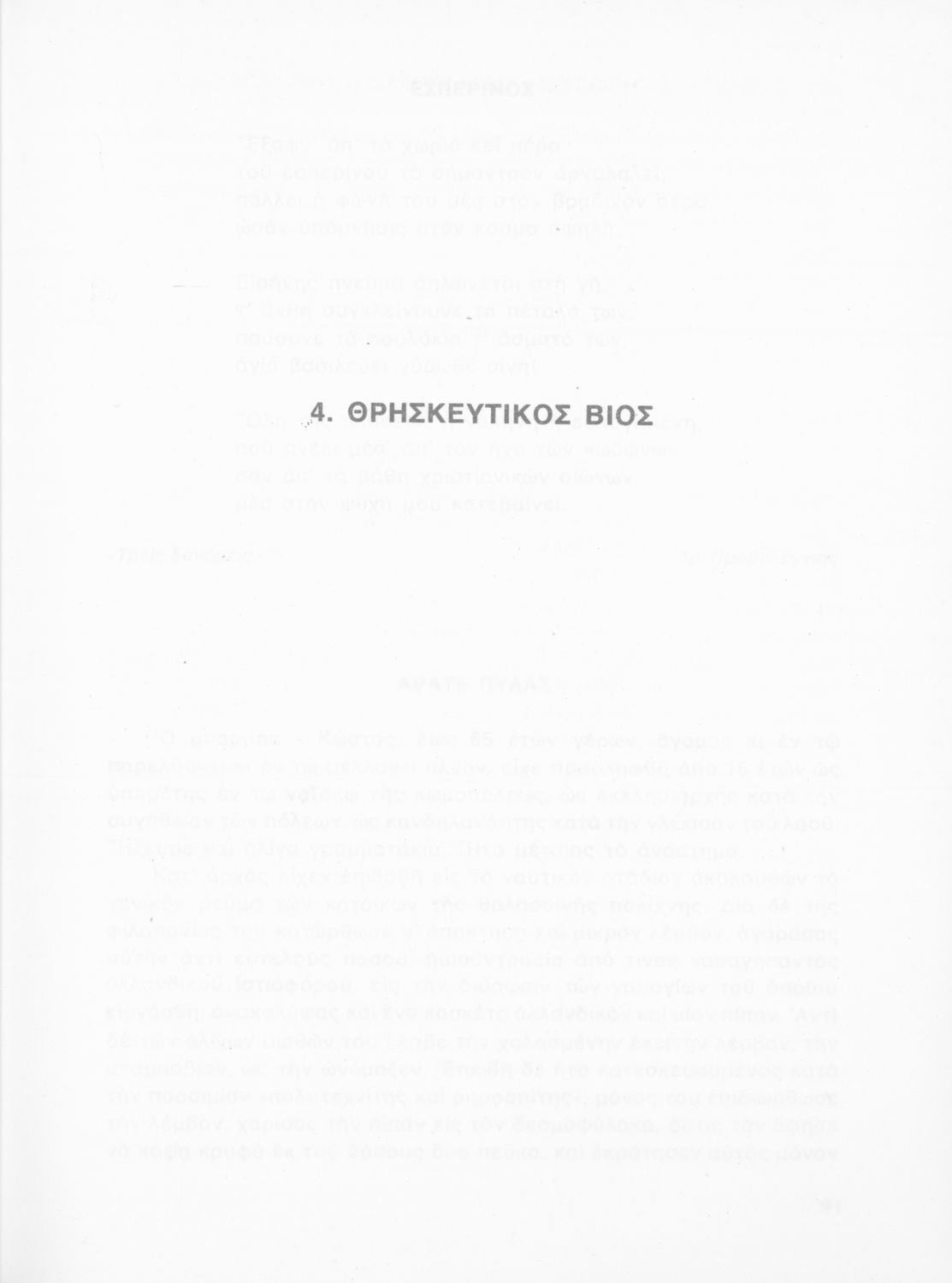 Σχολικό εγχειρίδιο Νέων Ελληνικών Γ΄ Γυμνασίου και Α' Αστικού Σχολείου που περιέχει πεζά και ποιήματα Ελλήνων συγγραφέων εμπνευσμένα από τη θρησκευτική και κοινωνική ζωή, την ελληνική μυθολογία, την αρχαία και