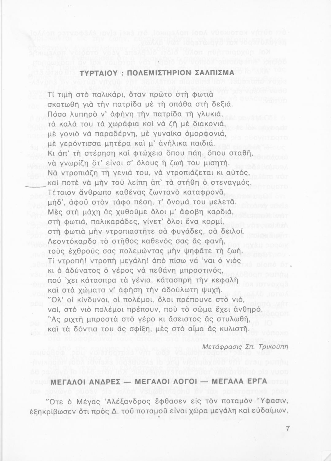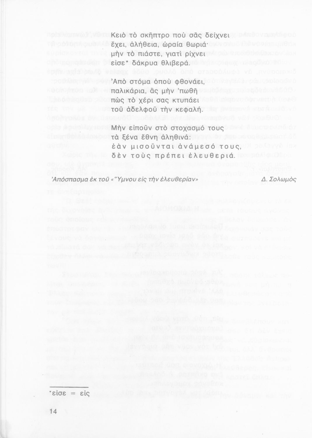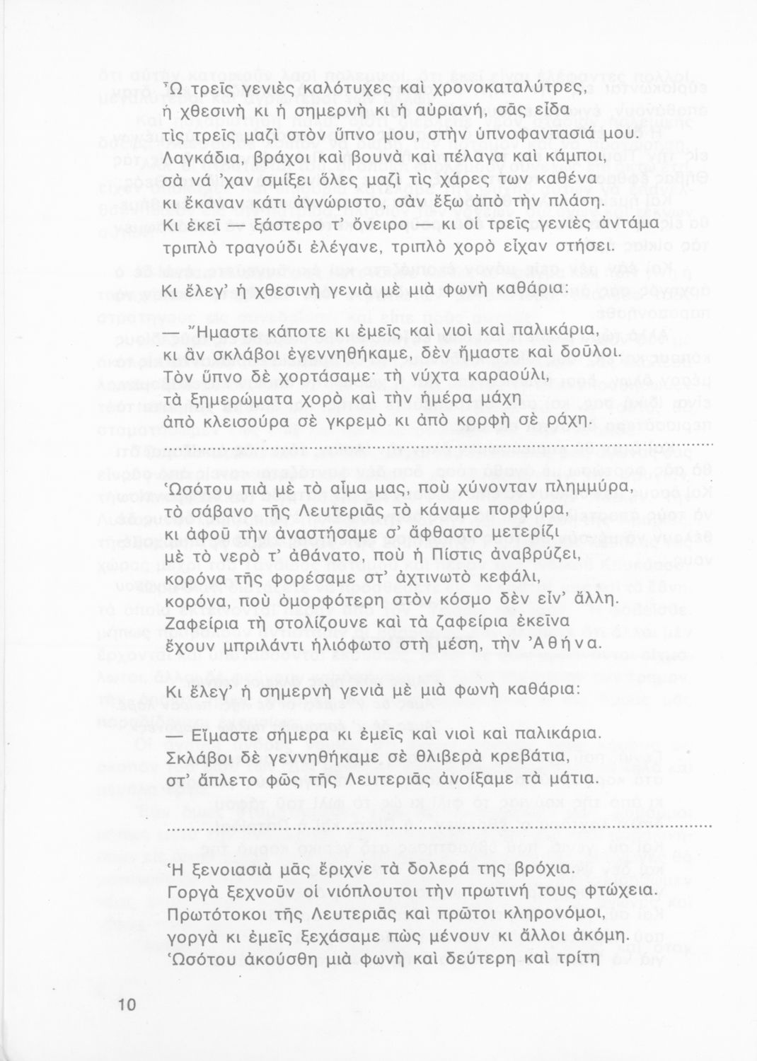 Σχολικό εγχειρίδιο Νέων Ελληνικών Α' Γυμνασίου που περιέχει ποιήματα και πεζά Ελλήνων συγγραφέων εμπνευσμένα από την αρχαία ελληνική ιστορία και μυθολογία, τη βυζαντινή και σύγχρονη ελληνική ιστορία και την καθημερινή ζωή. Περιέχει παράρτημα με βιογραφίες των συγγραφέων και λεξιλόγιο.