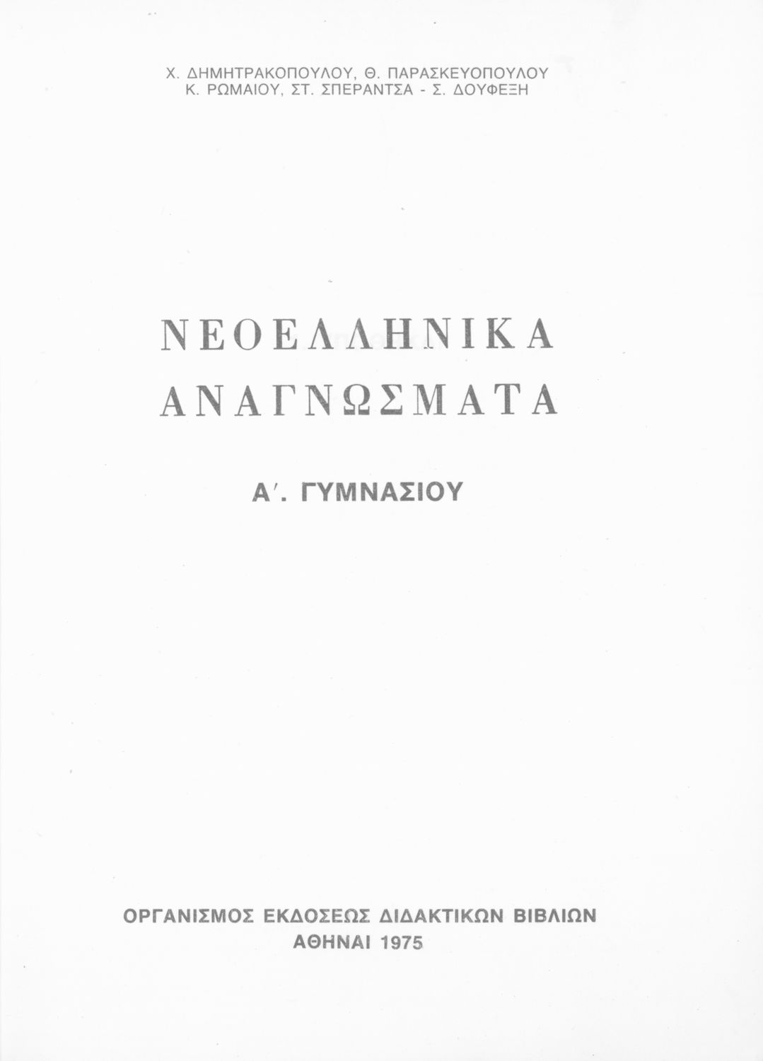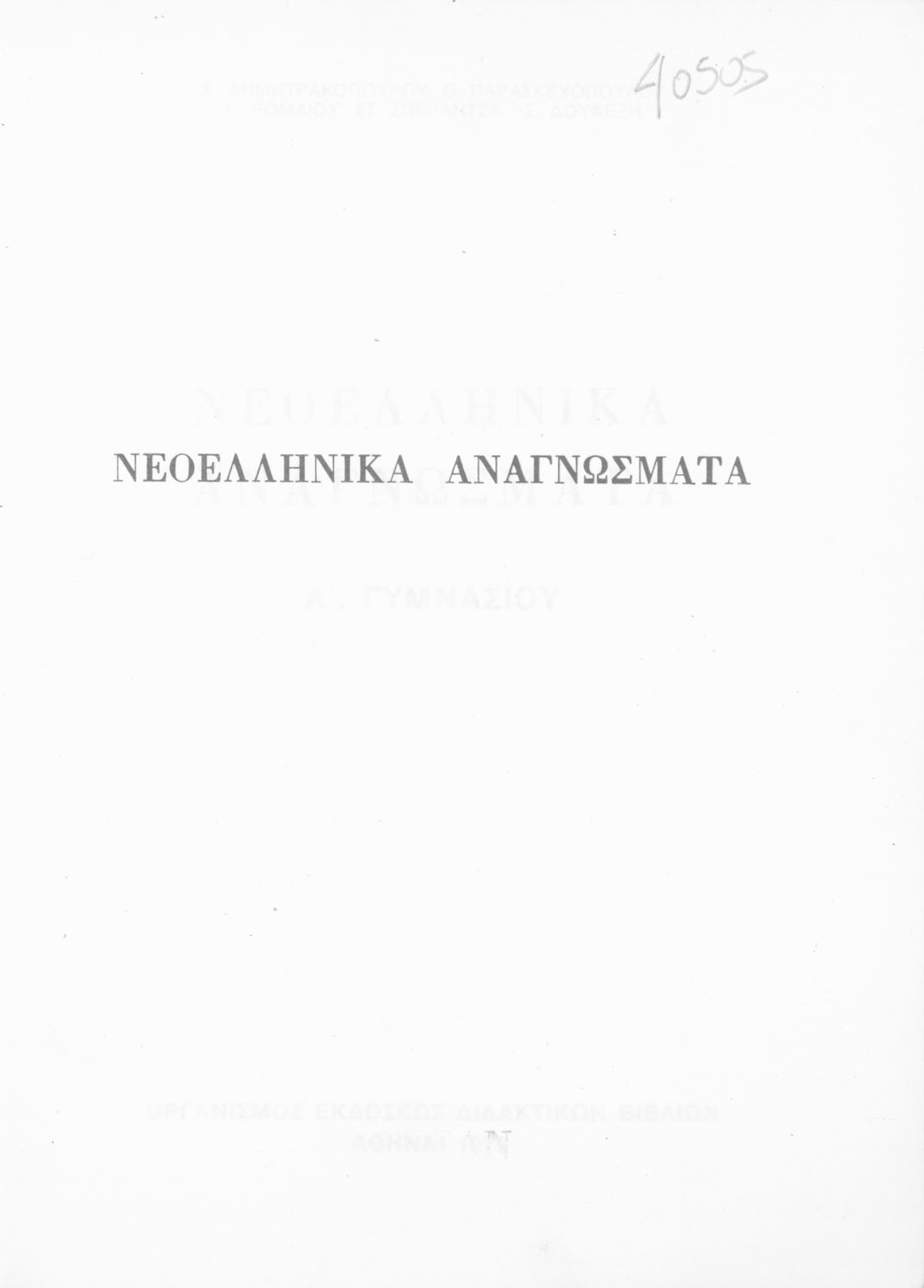 Κωδικός αναγνώρισης: 01-40505 Τίτλος: Νεοελληνικά αναγνώσματα Α΄ Γυμνασίου Συγγραφέας: Χ. Δημητρακόπουλος, Θ. Παρασκευόπουλος, Κ. Ρωμαίος, Στ. Σπεράντσας, Σ. Δουφεξής Μέγεθος και υπόστρωμα: Σχολικό εγχειρίδιο, μαλακό εξώφυλλο, 287 σελίδες. |