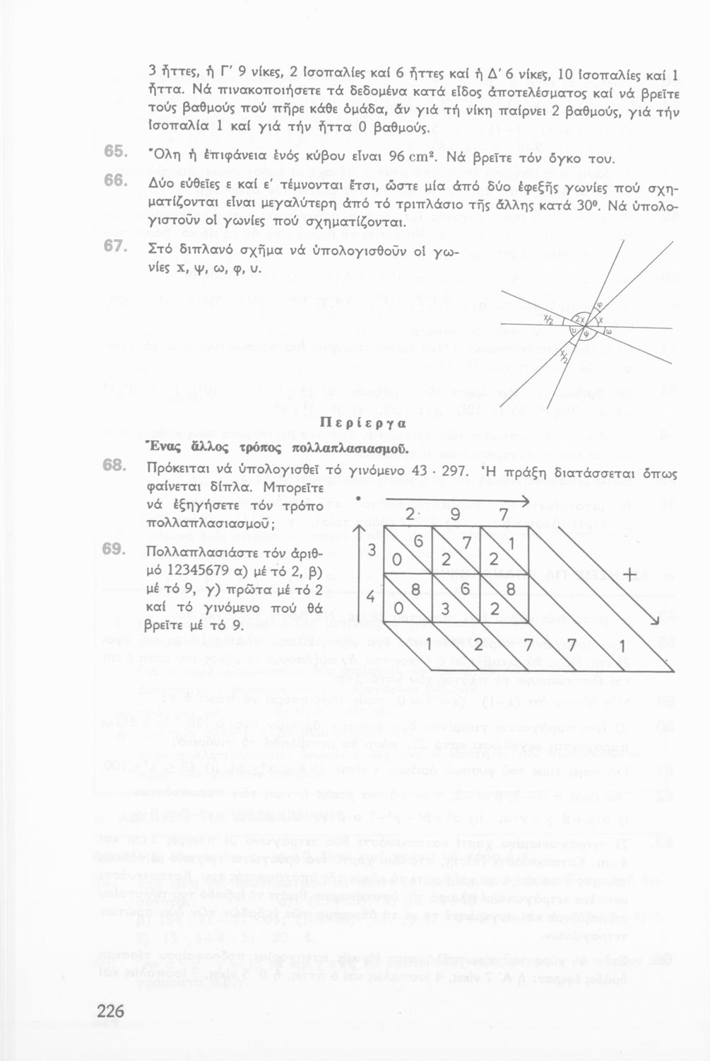 Βαθμίδα εκπαίδευσης: Δευτεροβάθμια Τάξη: Α' Γυμνασίου Μάθημα: Μαθηματικά Γλώσσα: Δημοτική Παρουσίαση περιεχομένου: Σχολικό εγχειρίδιο Μαθηματικών Α΄ Γυμνασίου που συνδυάζει Γεωμετρία και Άλγεβρα. |