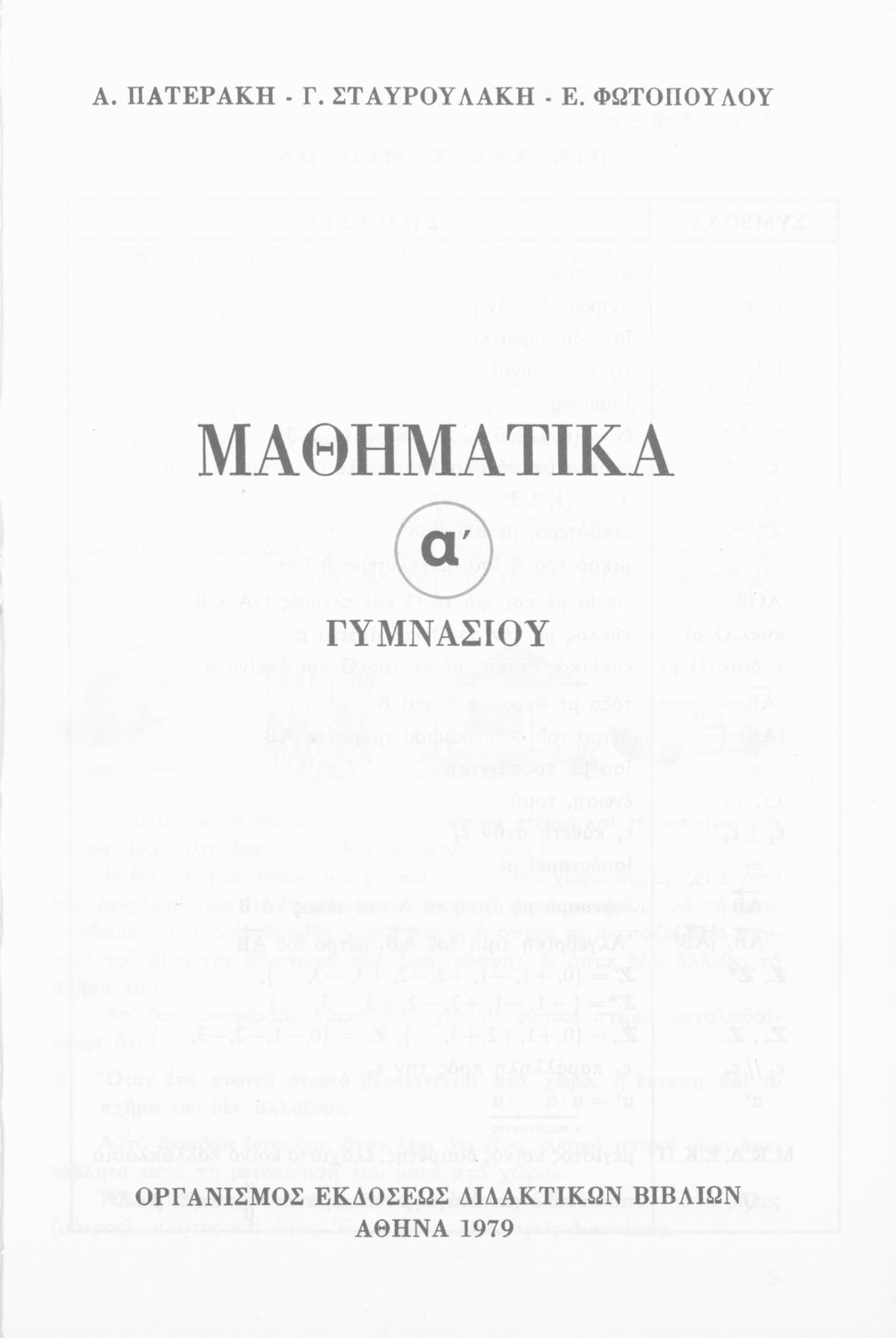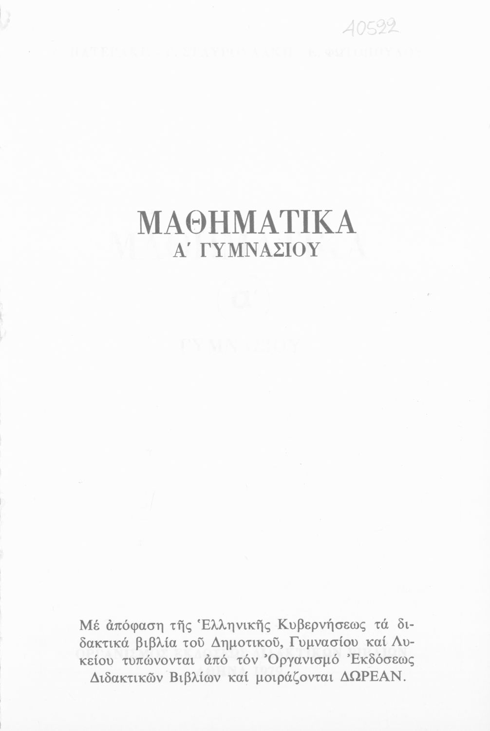 Κωδικός αναγνώρισης: 01-40522 Τίτλος: Μαθηματικά Α΄ Γυμνασίου Συγγραφέας: Α. Πατεράκης, Γ. Σταυρουλάκης, Ε. Φωτόπουλος Μέγεθος και υπόστρωμα: Σχολικό εγχειρίδιο, 23εκ., μαλακό εξώφυλλο, 319 σελίδες. |