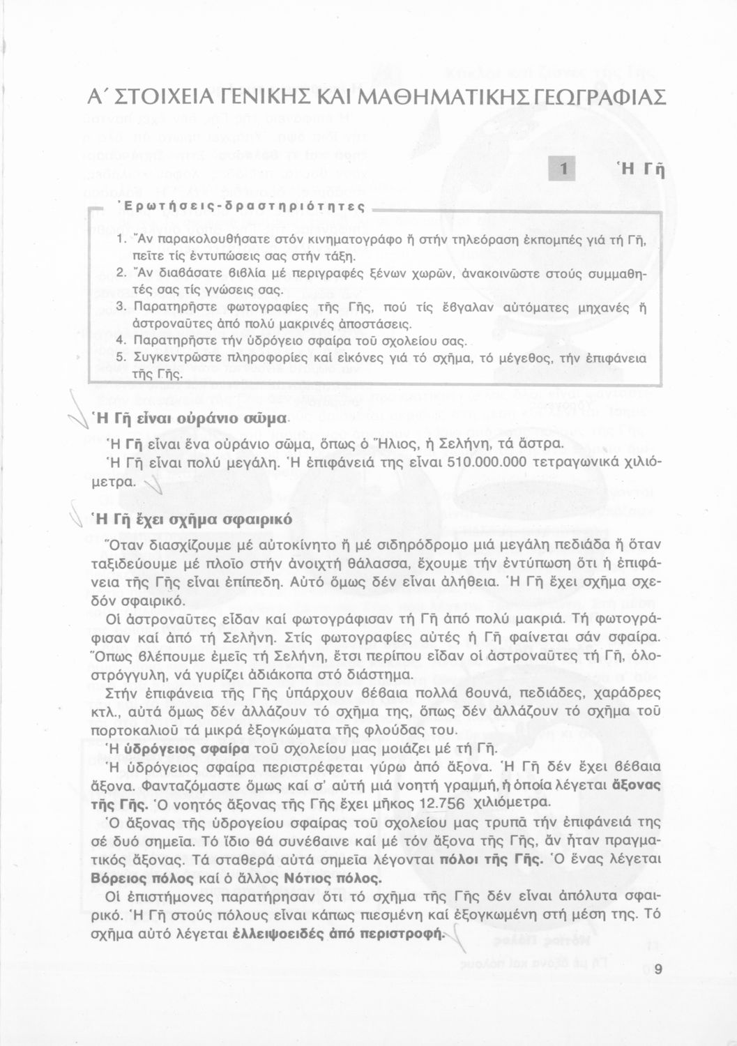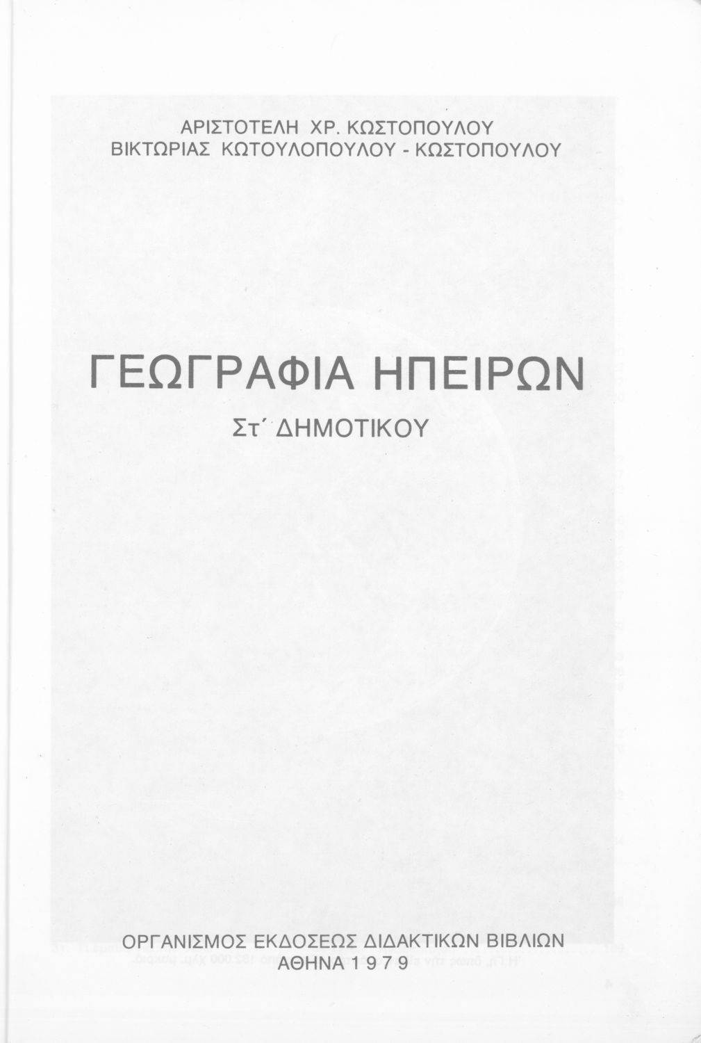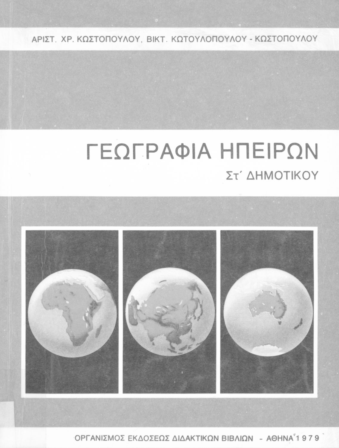 Σχολικό εγχειρίδιο Γεωγραφίας για τις Ε΄ και ΣΤ΄ Δημοτικού που περιλαμβάνει στοιχεία μαθηματικής και φυσικής γεωγραφίας, γεωλογίας και κοσμογραφίας, και εξετάζει την Ελλάδα και ενδεικτικές χώρες από τις πέντε ...