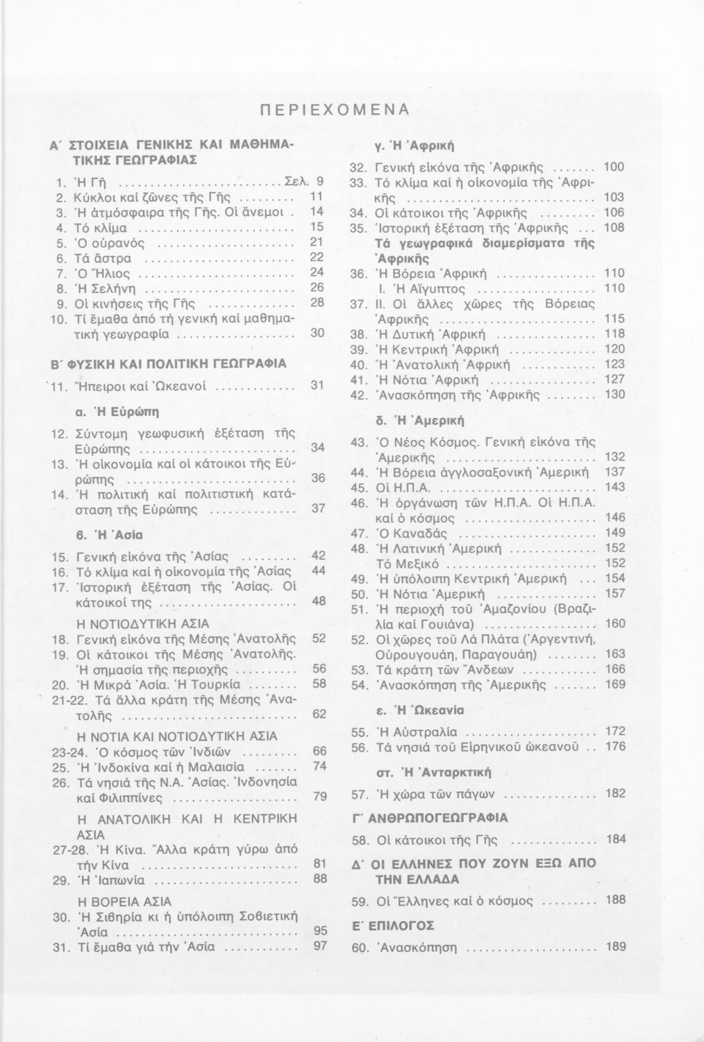 Σχολικό εγχειρίδιο Γεωγραφίας ΣΤ΄ Δημοτικού που περιλαμβάνει εισαγωγή στη φυσική, μαθηματική και πολιτική γεωγραφία και εξετάζει την Ελλάδα και ενδεικτικές χώρες και περιοχές από τις πέντε ηπείρους, εκτός της Ευρώπης, από γεωφυσική και πολιτική άποψη. Περιέχει και στοιχεία ανθρωπογεωγραφίας.