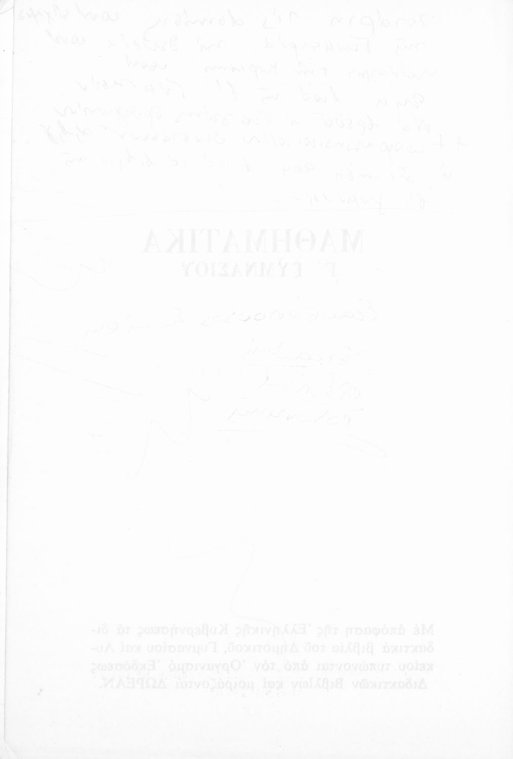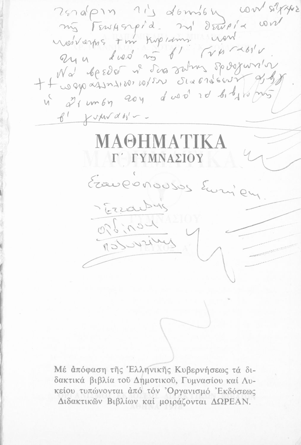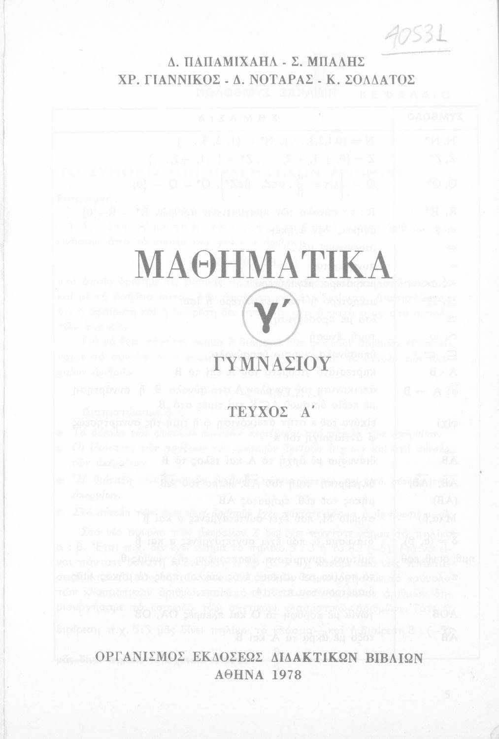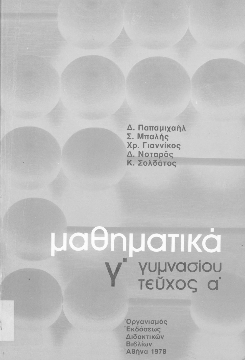 Σχολικό εγχειρίδιο μαθηματικών Γ΄ Γυμνασίου που περιλαμβάνει θεωρία, παραδείγματα και ασκήσεις. Φέρει το σύμβολο της δικτατορίας.