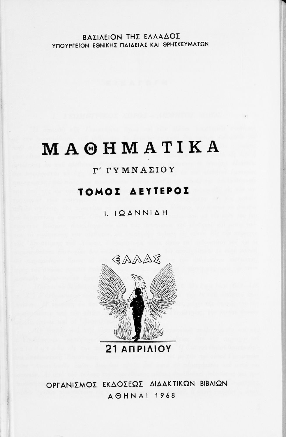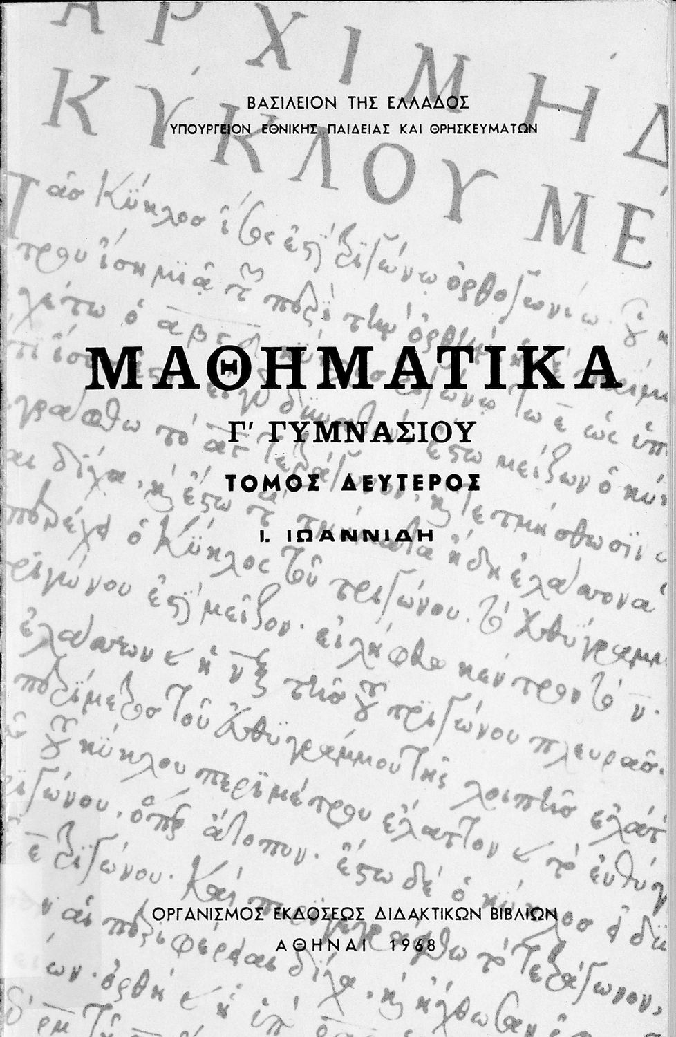 Σχολικό εγχειρίδιο Μαθηματικών Γ΄ Γυμνασίου που εστιάζει στη Γεωμετρία. Φέρει το σύμβολο της δικτατορίας. Ο συγγραφέας ήταν επιμελητής στο ΕΜΠ.