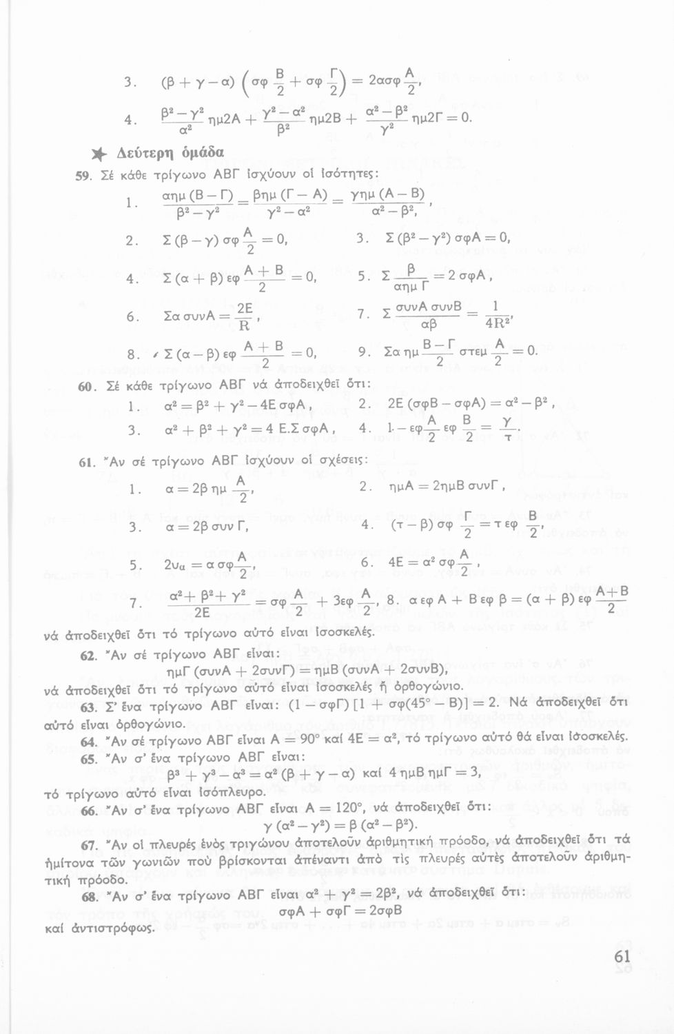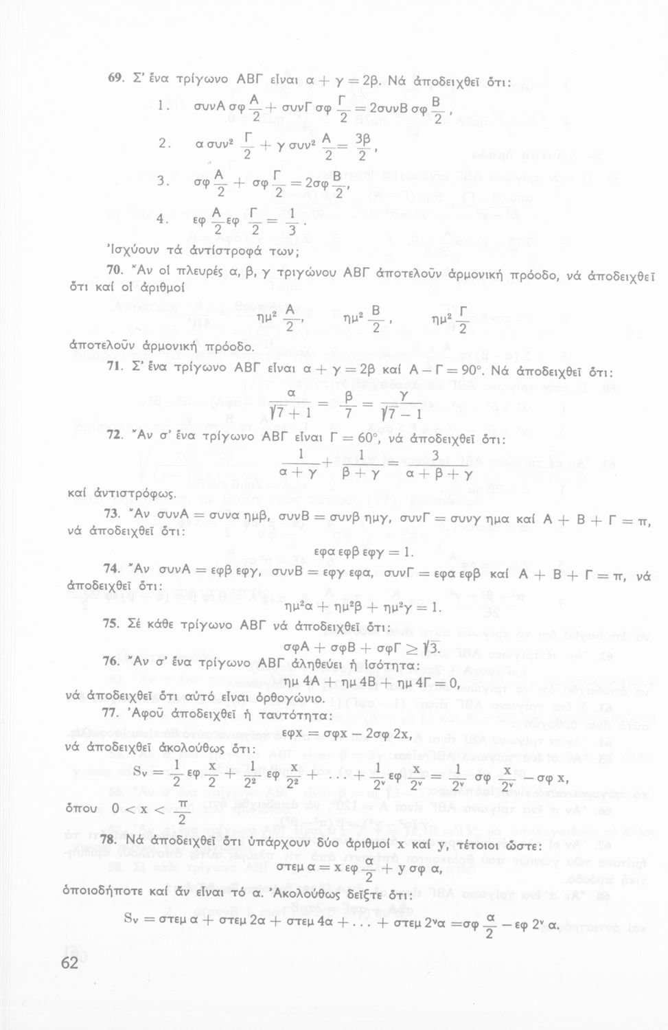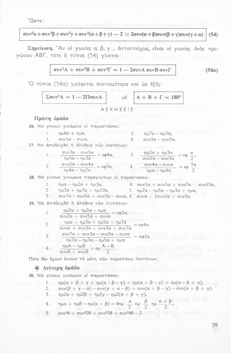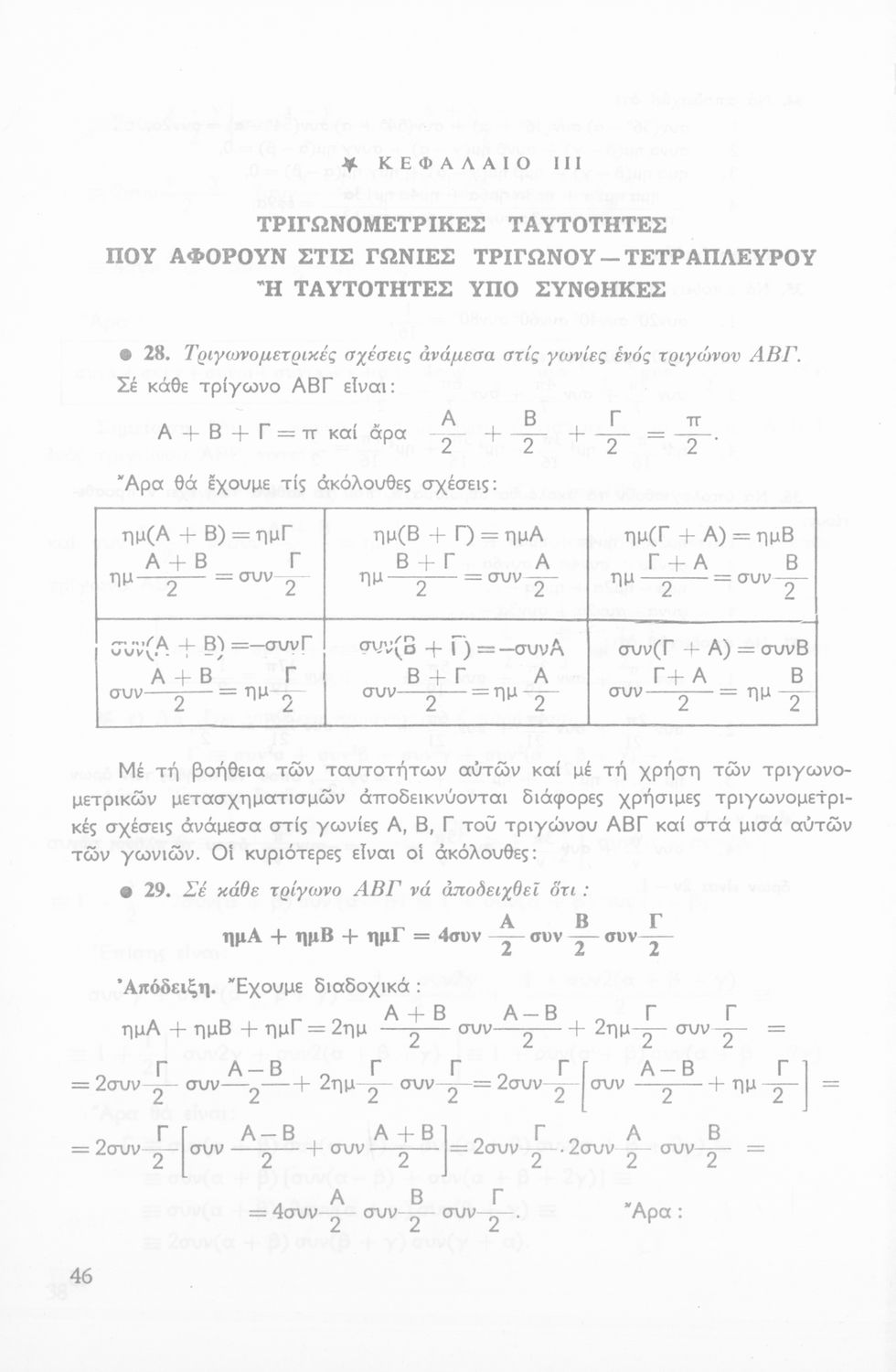 Σχολικό εγχειρίδιο Τριγωνομετρίας για την Β΄ Λυκείου χωρισμένο σε προβλήματα, εφαρμογές και ασκήσεις. Το εγχειρίδιο μεταγλωττίστηκε στη δημοτική από τους Βασίλειο Θεοδωρακόπουλο, Απόστολο Ζορμπά και τον συγγραφέα. Οι μαθητές της κλασσικής κατεύθυνσης δεν διδάσκονταν κάποια από τα κεφάλαια.