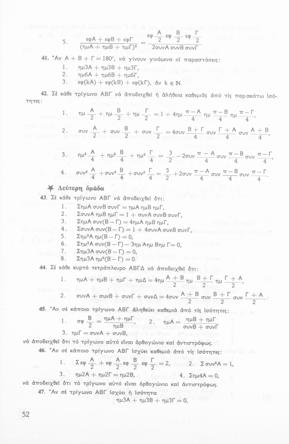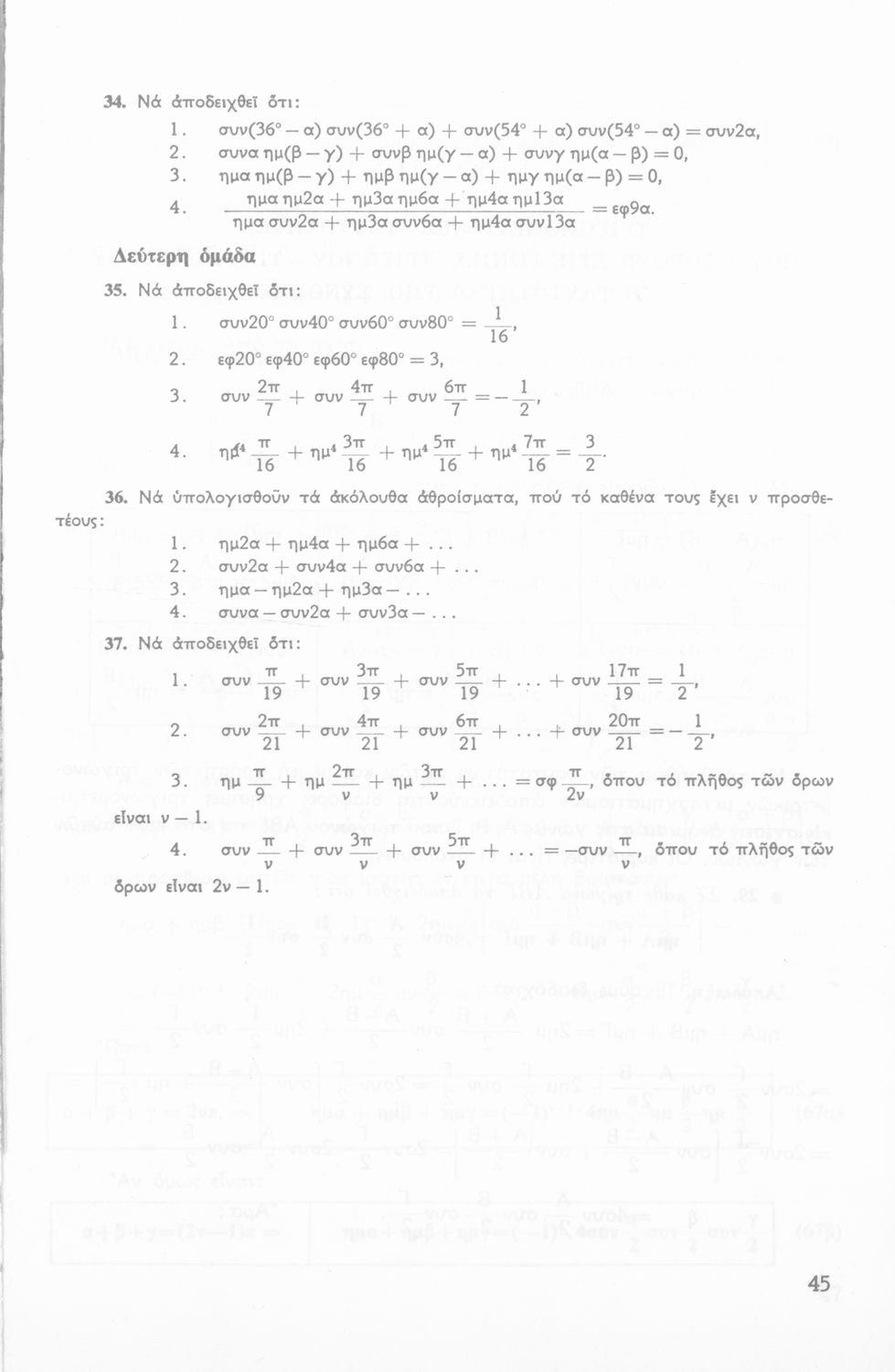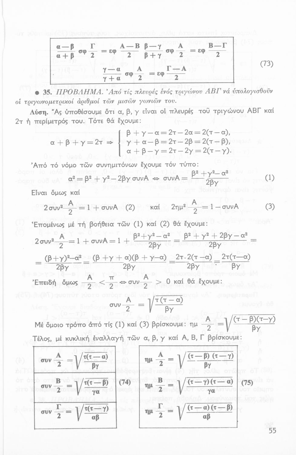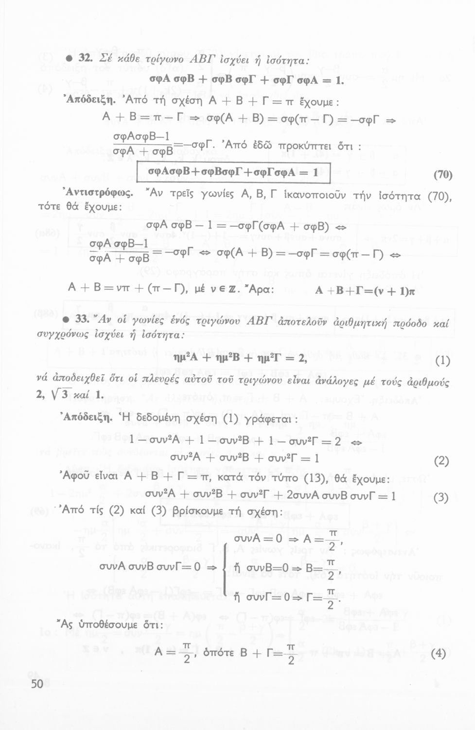 Σχολικό εγχειρίδιο Τριγωνομετρίας για την Β΄ Λυκείου χωρισμένο σε προβλήματα, εφαρμογές και ασκήσεις. Το εγχειρίδιο μεταγλωττίστηκε στη δημοτική από τους Βασίλειο Θεοδωρακόπουλο, Απόστολο Ζορμπά και τον συγγραφέα. Οι μαθητές της κλασσικής κατεύθυνσης δεν διδάσκονταν κάποια από τα κεφάλαια.