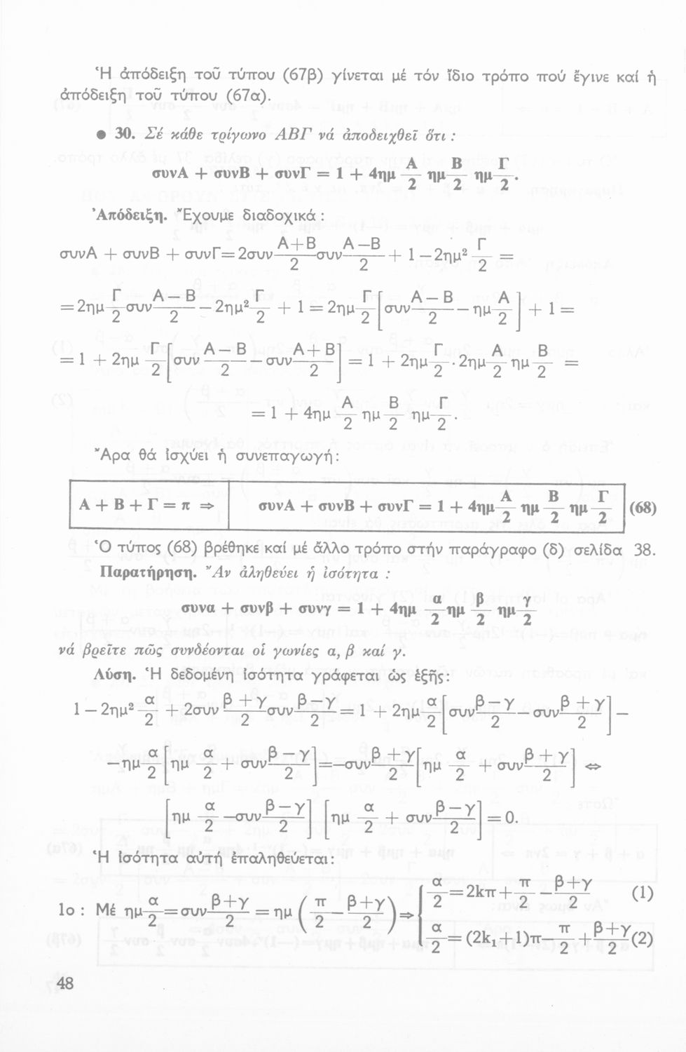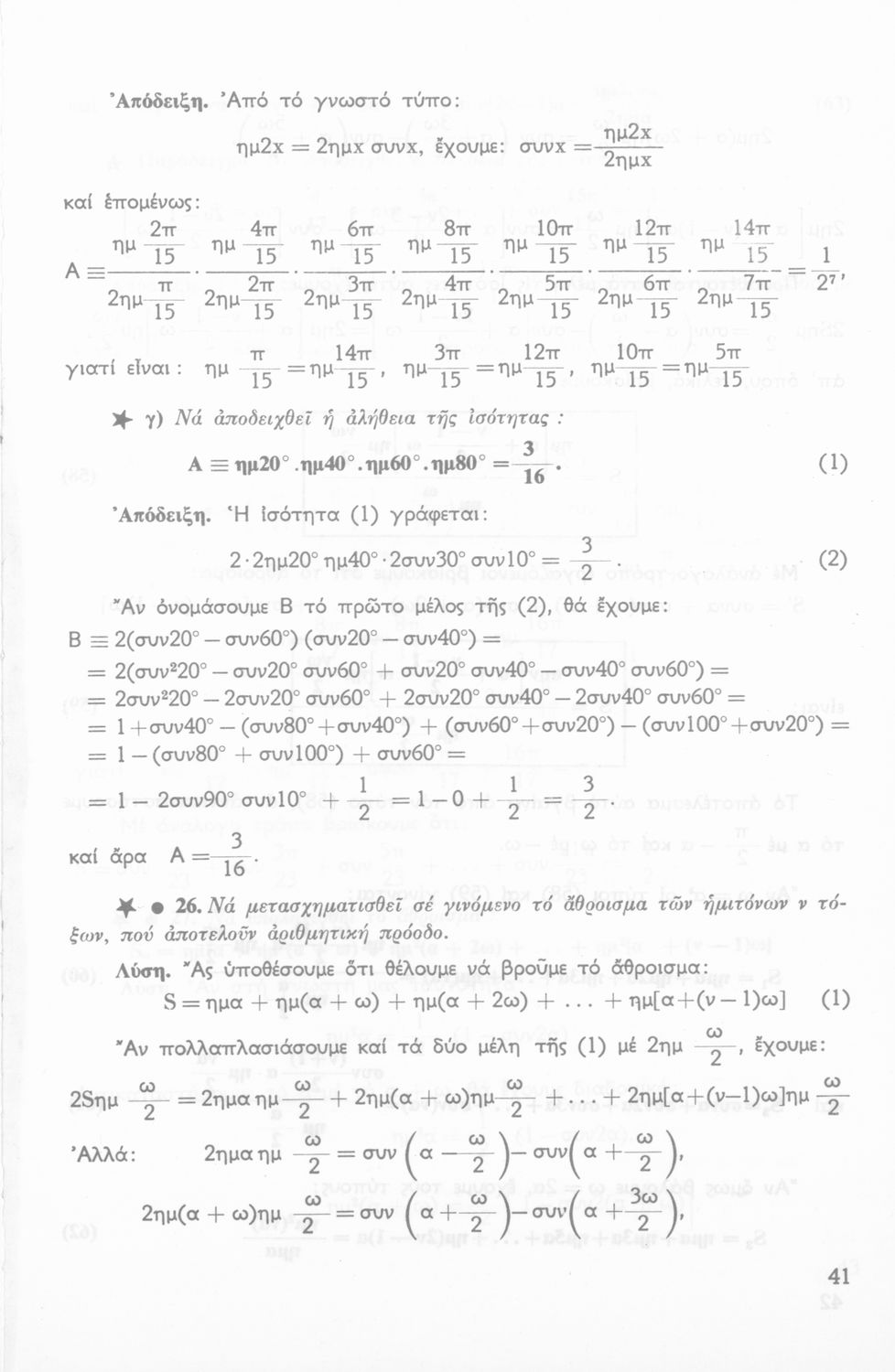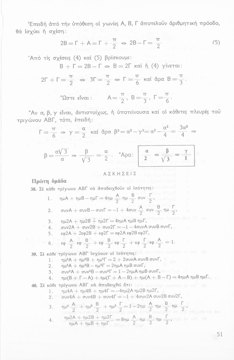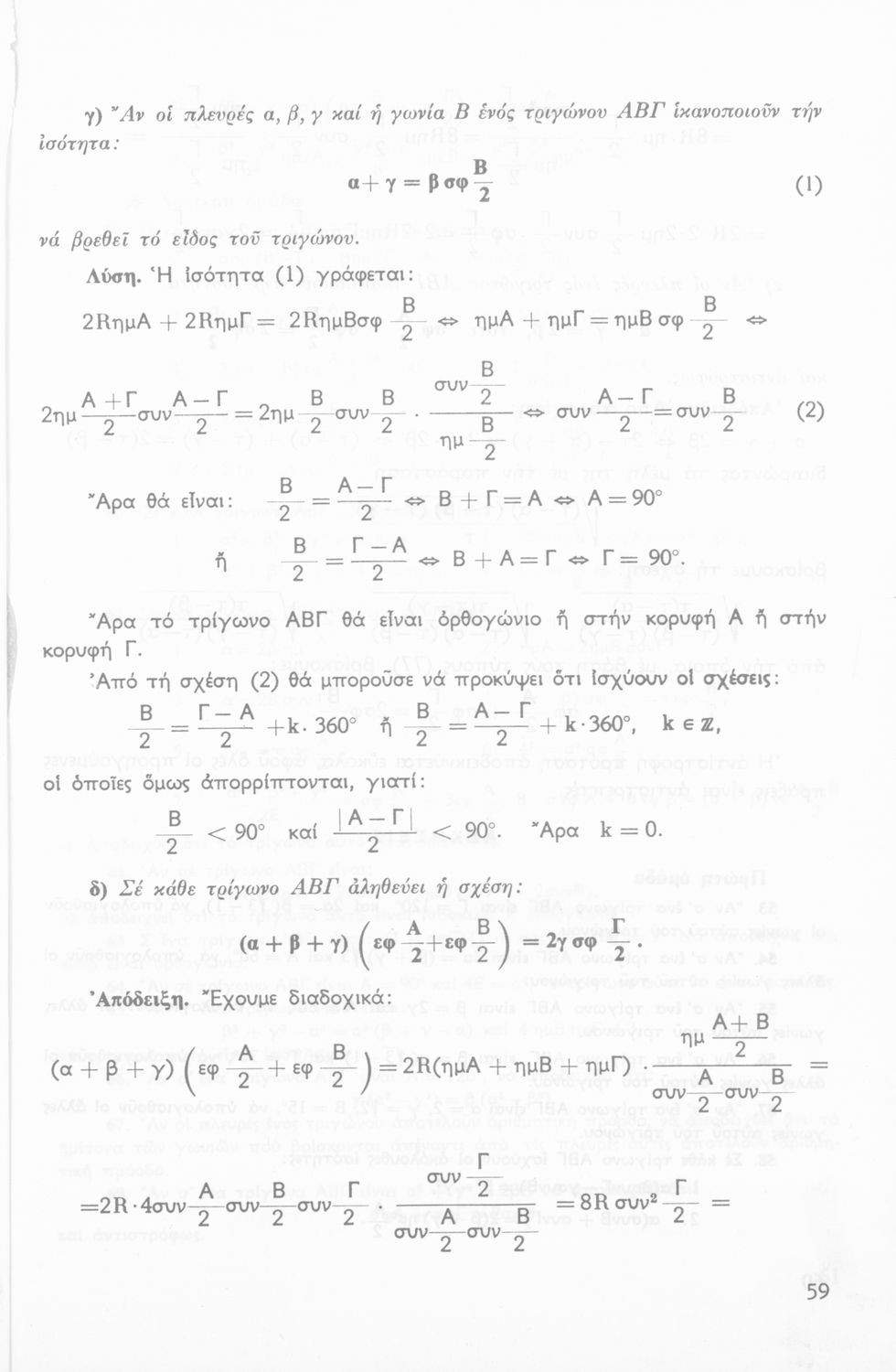 Σχολικό εγχειρίδιο Τριγωνομετρίας για την Β΄ Λυκείου χωρισμένο σε προβλήματα, εφαρμογές και ασκήσεις. Το εγχειρίδιο μεταγλωττίστηκε στη δημοτική από τους Βασίλειο Θεοδωρακόπουλο, Απόστολο Ζορμπά και τον συγγραφέα. Οι μαθητές της κλασσικής κατεύθυνσης δεν διδάσκονταν κάποια από τα κεφάλαια.