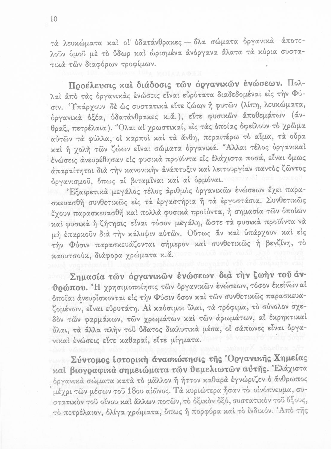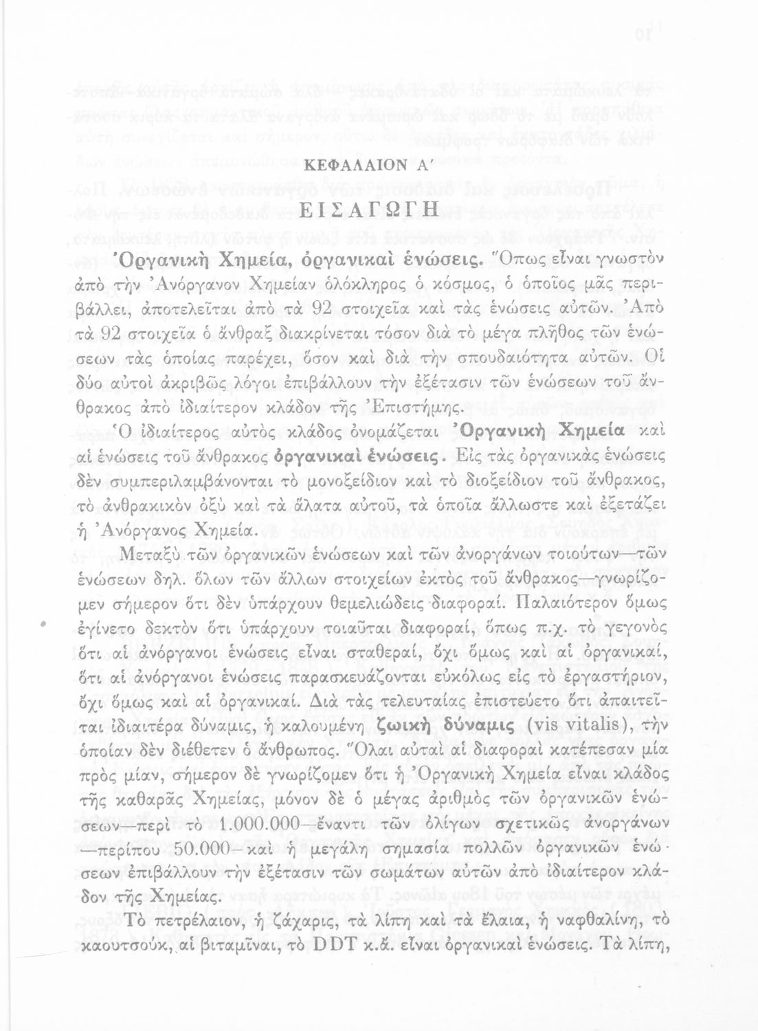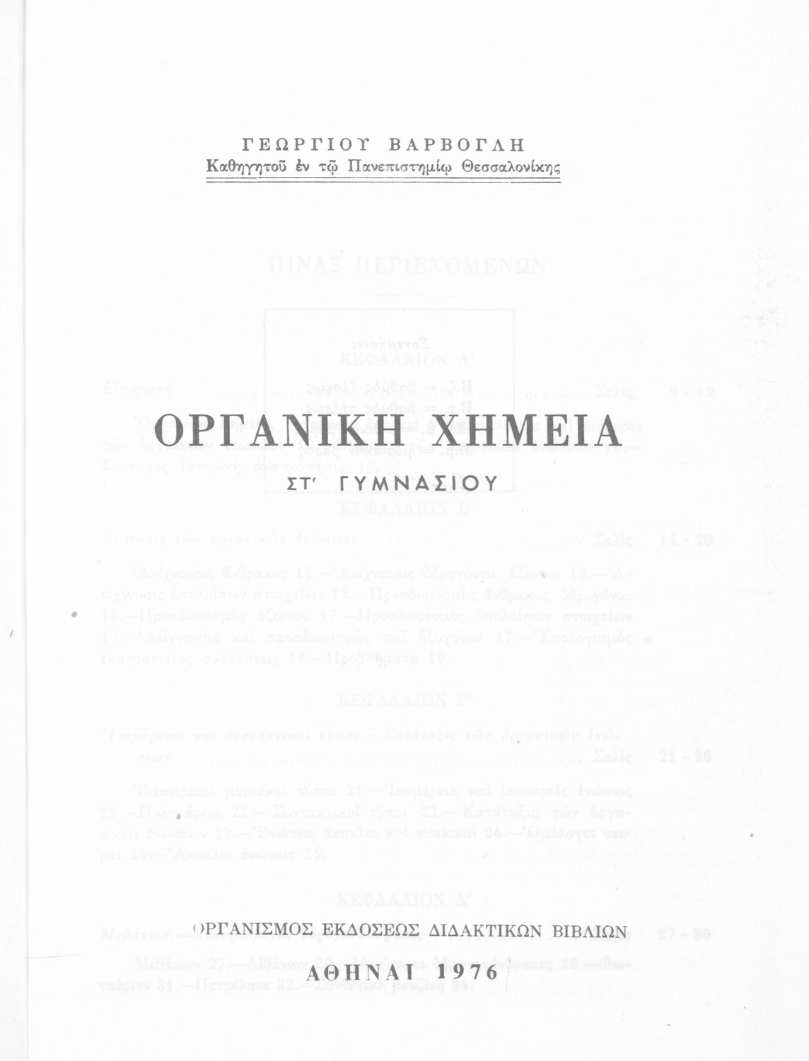 Σχολικό εγχειρίδιο Χημείας που προσδιορίζει βασικές έννοιες οργανικής χημείας (οργανικές ενώσεις, χημική ανάλυση, ονοματολογία και συμβολισμοί). Στο βιβλίο γίνεται αναλυτική περιγραφή των ιδιοτήτων και των ενώσεων αμετάλλων, οξέων, αρωματικών υδρογονανθράκων.