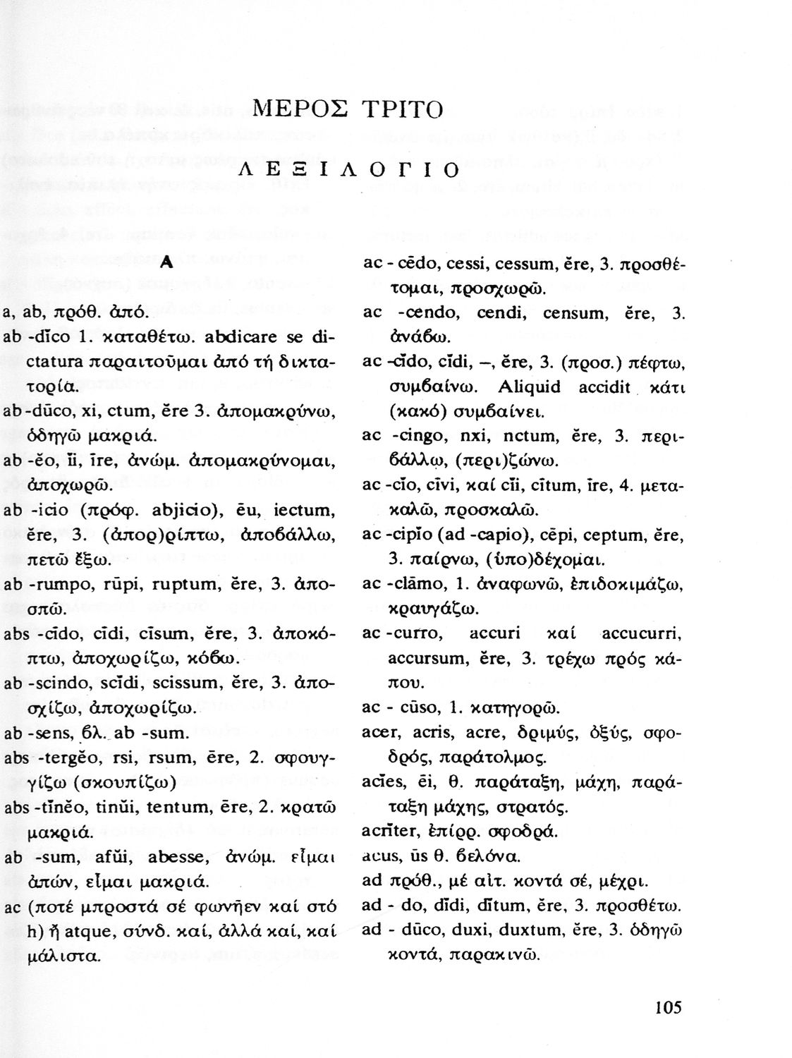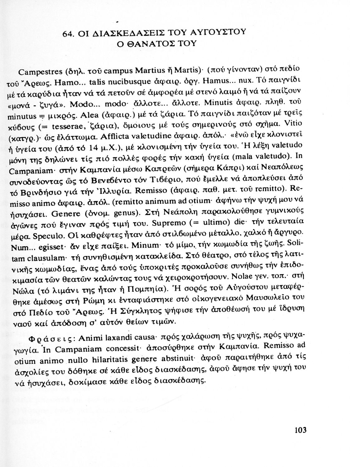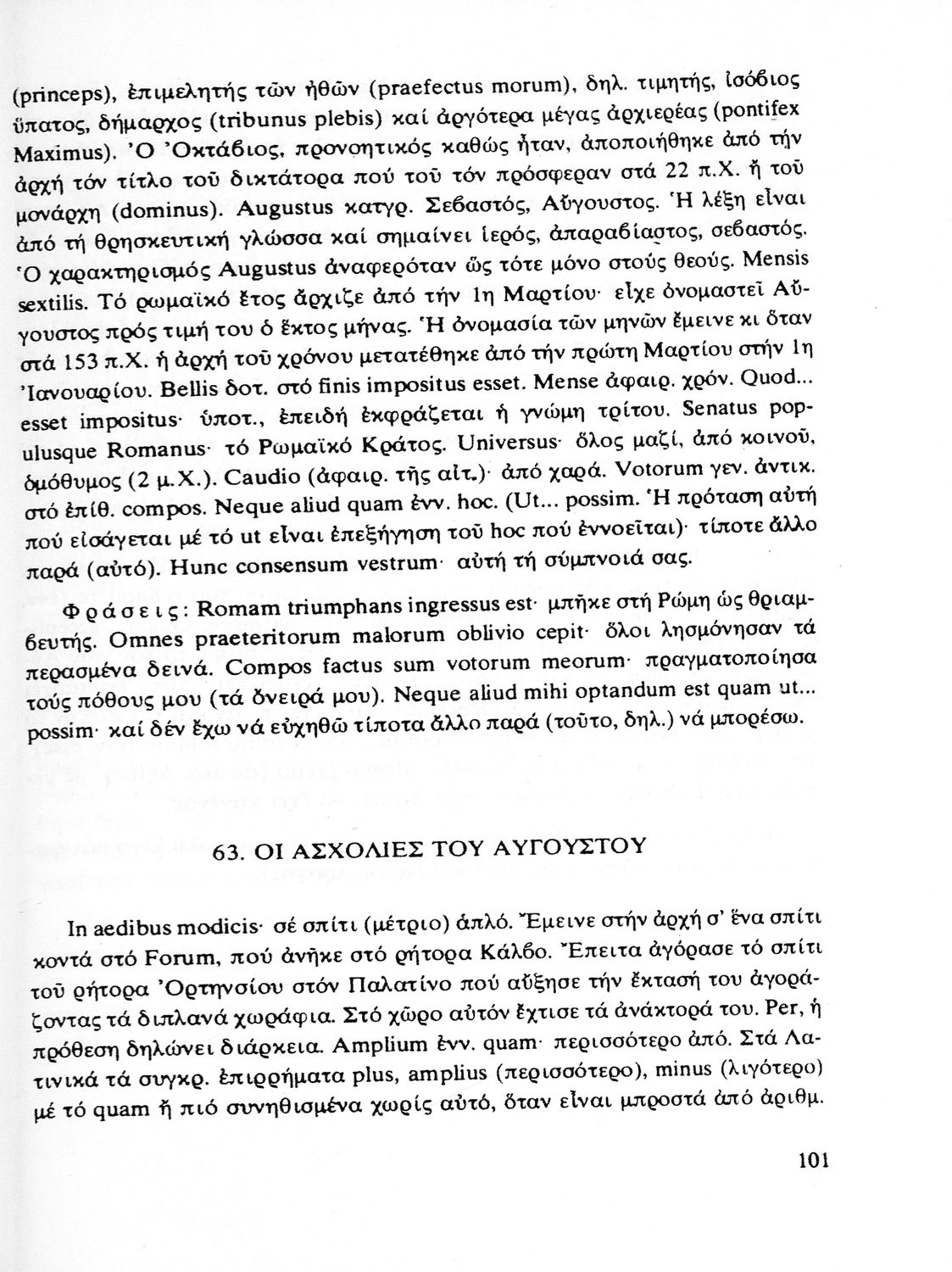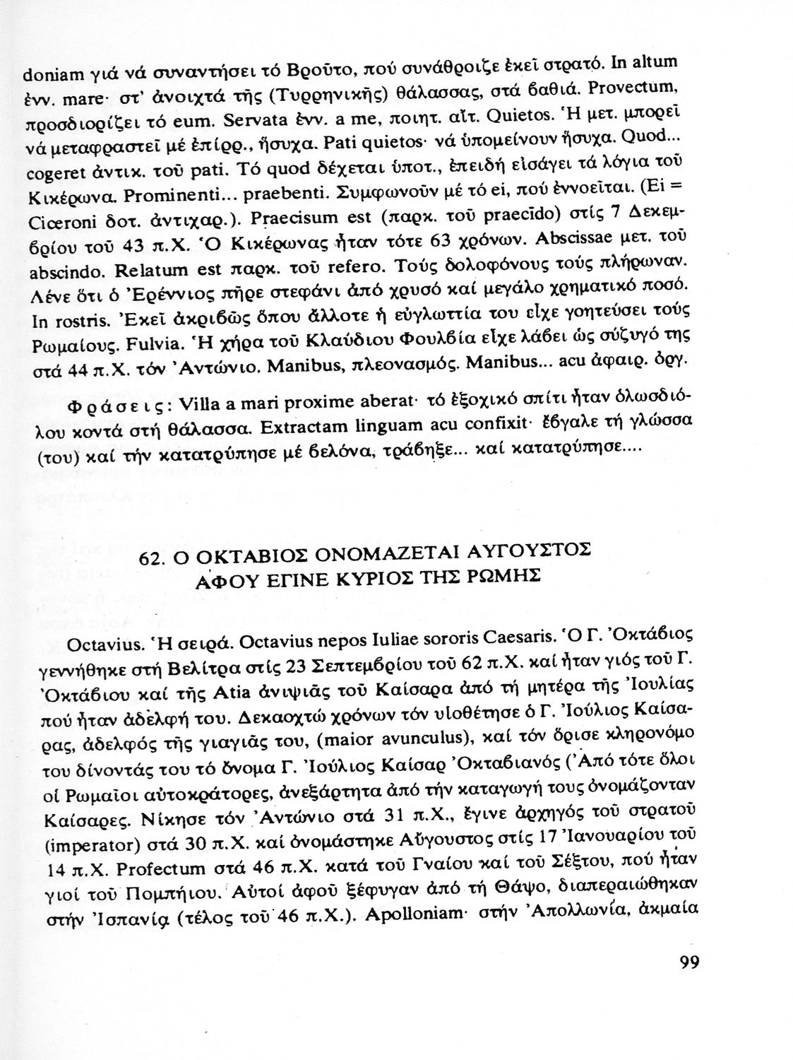 Αναγνωστικό Λατινικών για τη Γ΄ Γυμνασίου που περιέχει 54 κείμενα/περικοπές στα λατινικά, ερμηνευτικά υπομνήματα, λεξιλόγιο και κατάλογο με τα συντακτικά φαινόμενα (αφαιρετική, προθέσεις, σύνδεσμοι) που ...