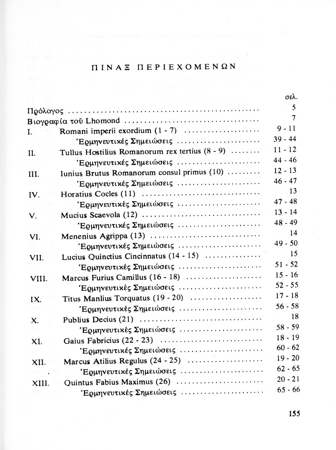Σχολικό εγχειρίδιο Λατινικών Γ΄ Λυκείου που περιέχει σύντομο βιογραφικό σημείωμα του Lhomond, 64 αποσπάσματα από το βιβλίο του, ερμηνευτικές σημειώσεις και λεξιλόγιο. Παρουσιάζει βίους επιφανών Ρωμαίων από το 753 π.Χ μέχρι το 14 μ.Χ.