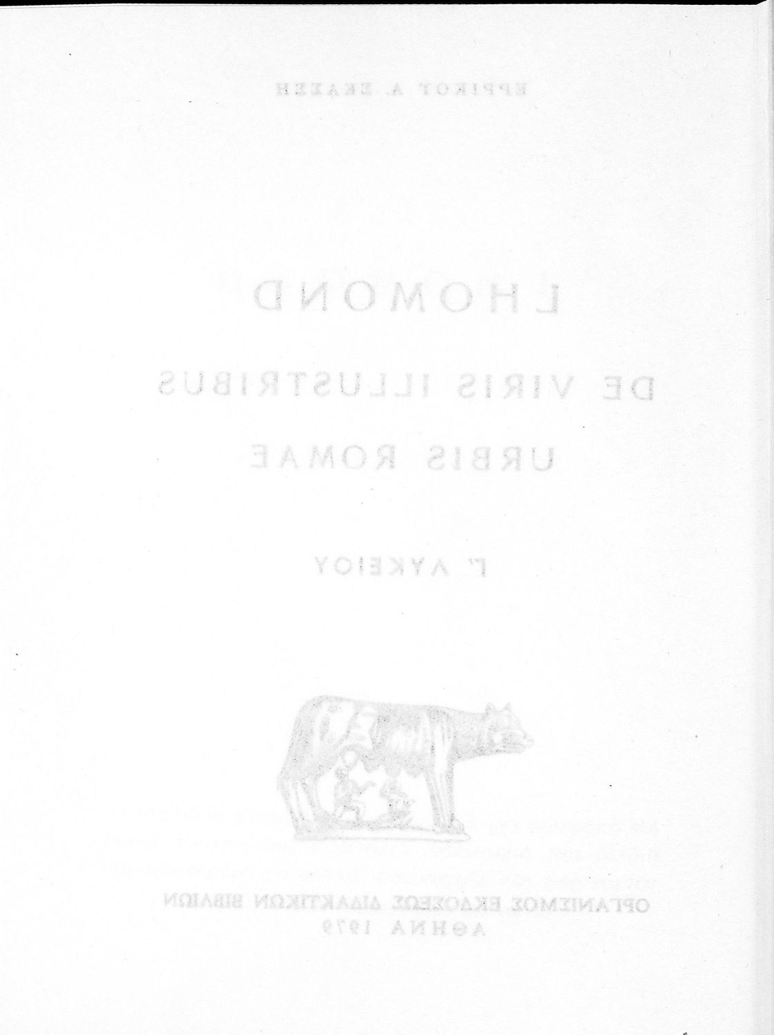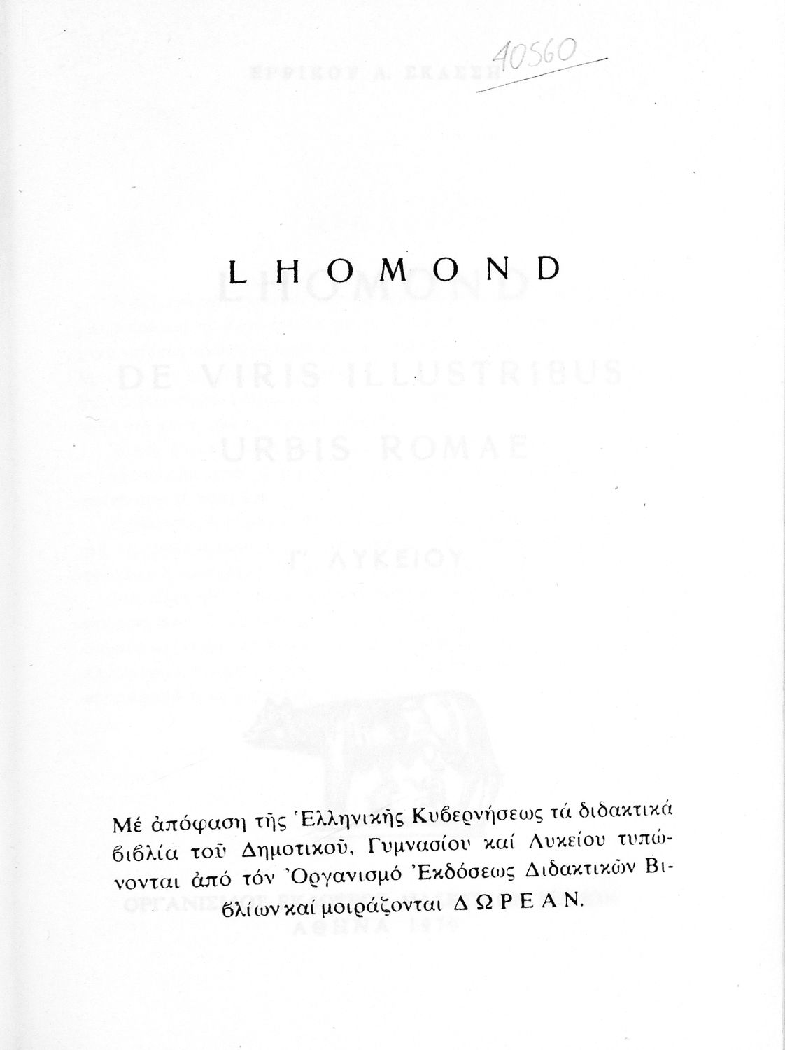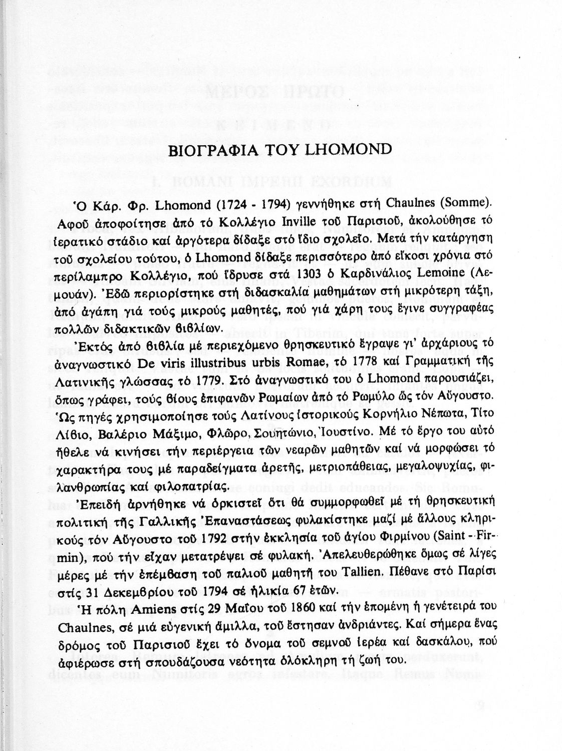 Σχολικό εγχειρίδιο Λατινικών Γ΄ Λυκείου που περιέχει σύντομο βιογραφικό σημείωμα του Lhomond, 64 αποσπάσματα από το βιβλίο του, ερμηνευτικές σημειώσεις και λεξιλόγιο. Παρουσιάζει βίους επιφανών Ρωμαίων από το 753 π.Χ μέχρι το 14 μ.Χ.