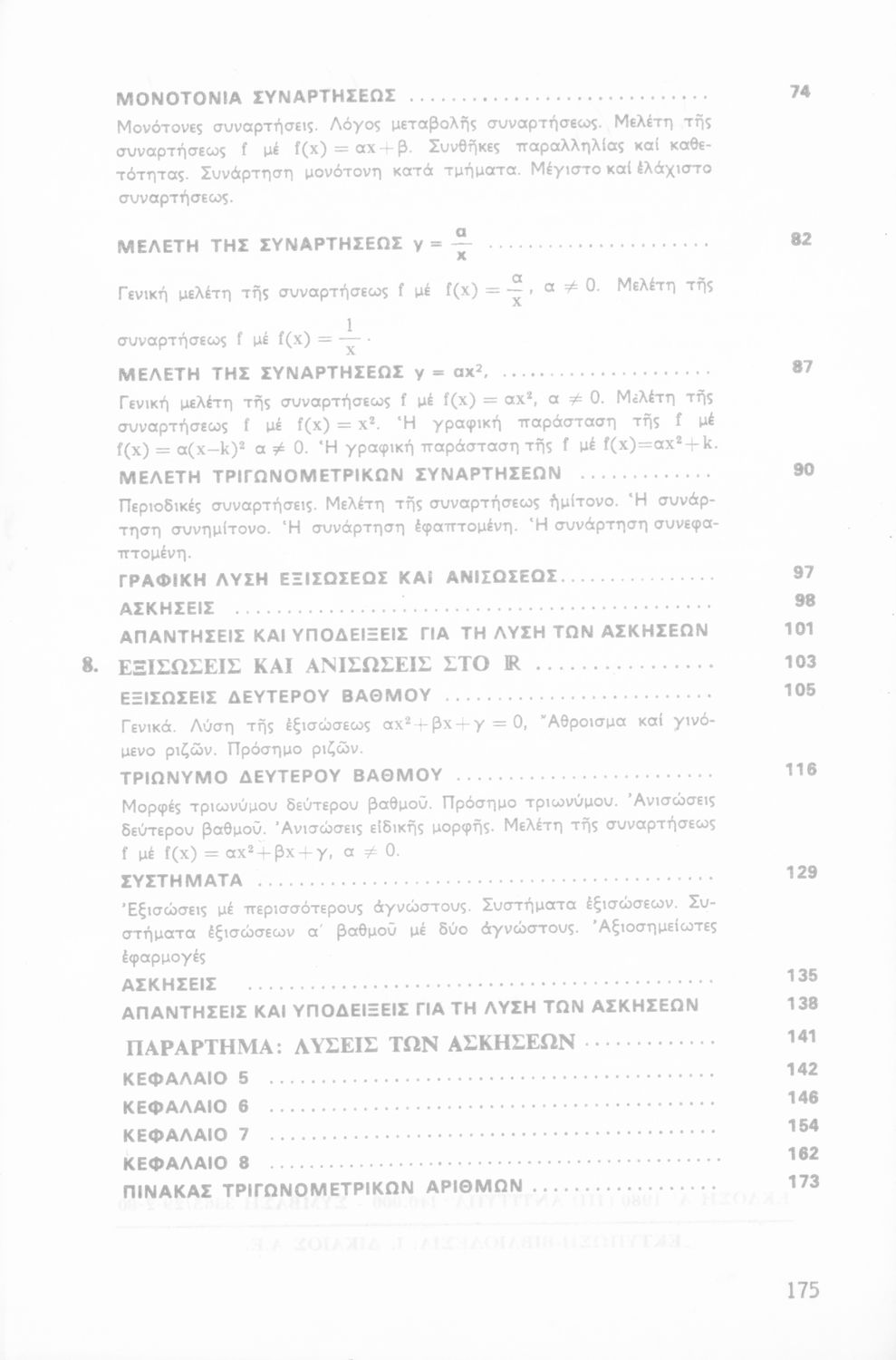 Σχολικό εγχειρίδιο Άλγεβρας Α΄ Λυκείου που είναι χωρισμένο σε αξιώματα, πορίσματα, παραδείγματα και ασκήσεις και εστιάζει στις συναρτήσεις και τις εξισώσεις. Περιέχει παράρτημα με τις λύσεις των ασκήσεων.