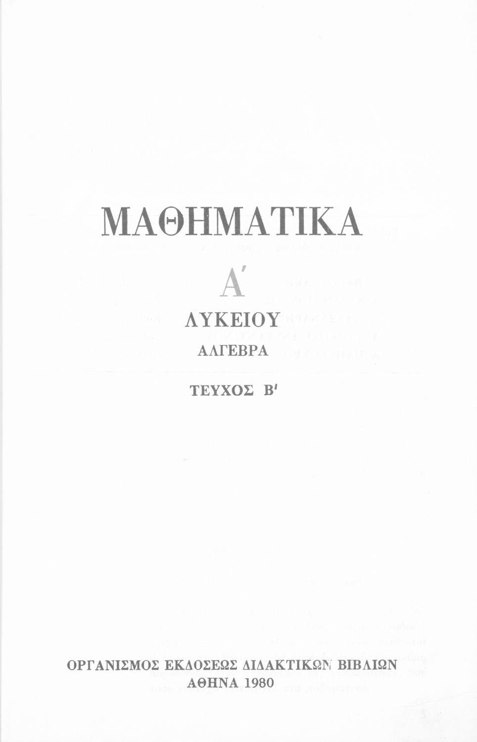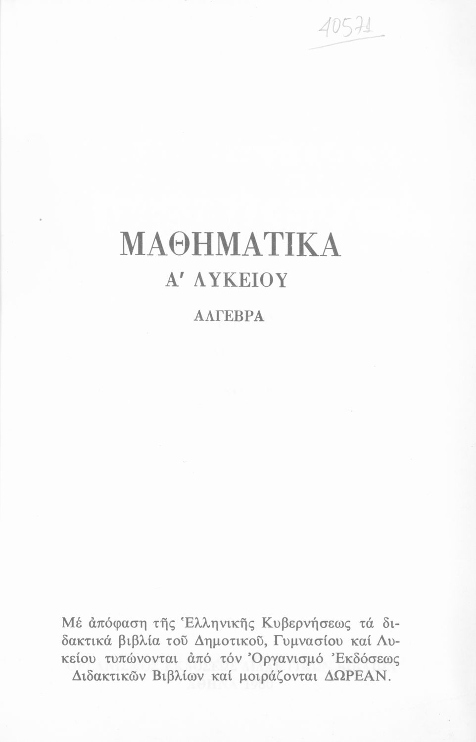Σχολικό εγχειρίδιο Άλγεβρας Α΄ Λυκείου που είναι χωρισμένο σε αξιώματα, πορίσματα, παραδείγματα και ασκήσεις και εστιάζει στις συναρτήσεις και τις εξισώσεις. Περιέχει παράρτημα με τις λύσεις των ασκήσεων.