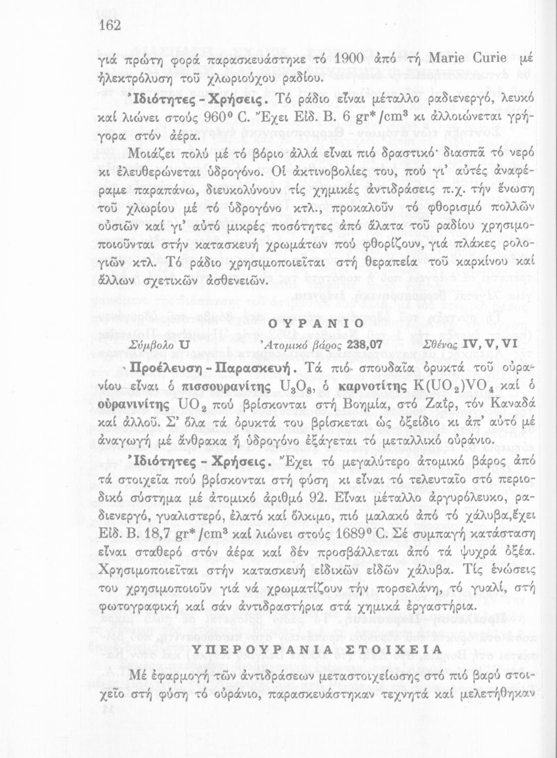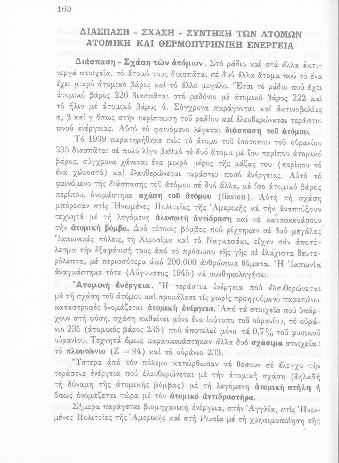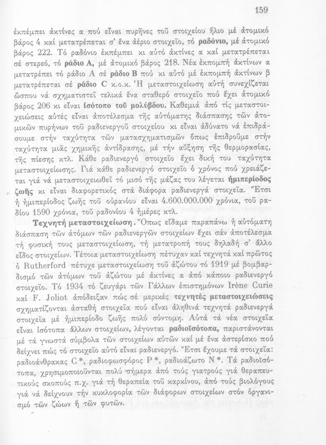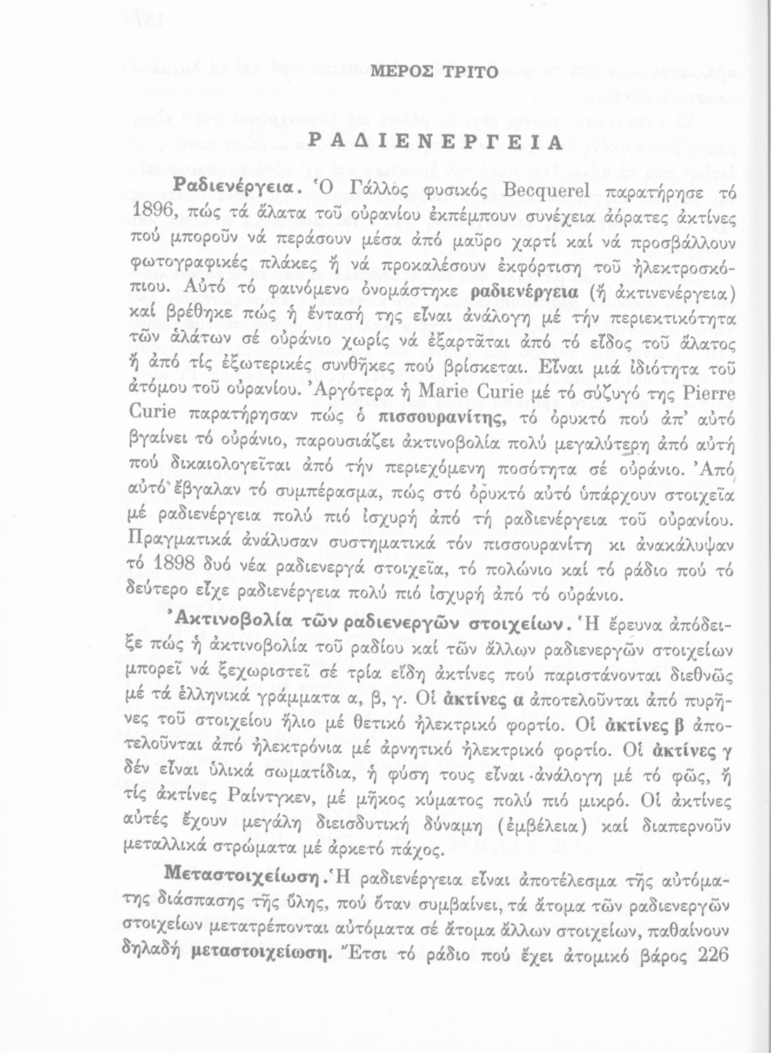 Σχολικό εγχειρίδιο Χημείας που απευθύνεται σε μαθητές Γυμνασίου με σκοπό τη περιγραφή εισαγωγικών εννοιών χημείας (ύλη, νόμοι χημείας, χημικές αντιδράσεις-εξισώσεις-ενώσεις). Στο βιβλίο γίνεται αναλυτική περιγραφή στοιχείων μετάλλων και αμέταλλων περιγράφοντας τις ιδιότητες και τις ενώσεις τους. Τέλος προσδιορίζεται η ακτινοβολία ραδιενεργών σωμάτων.